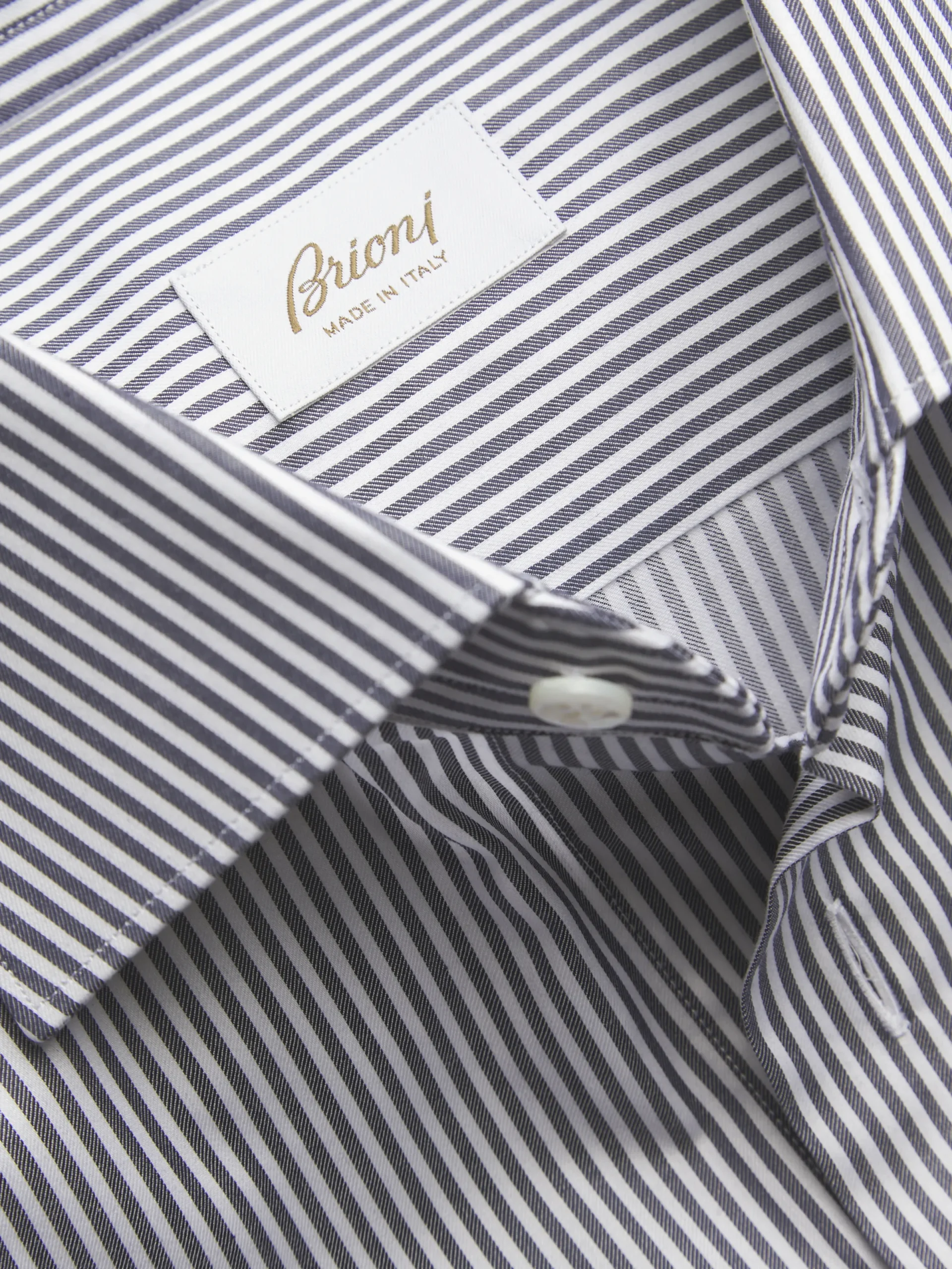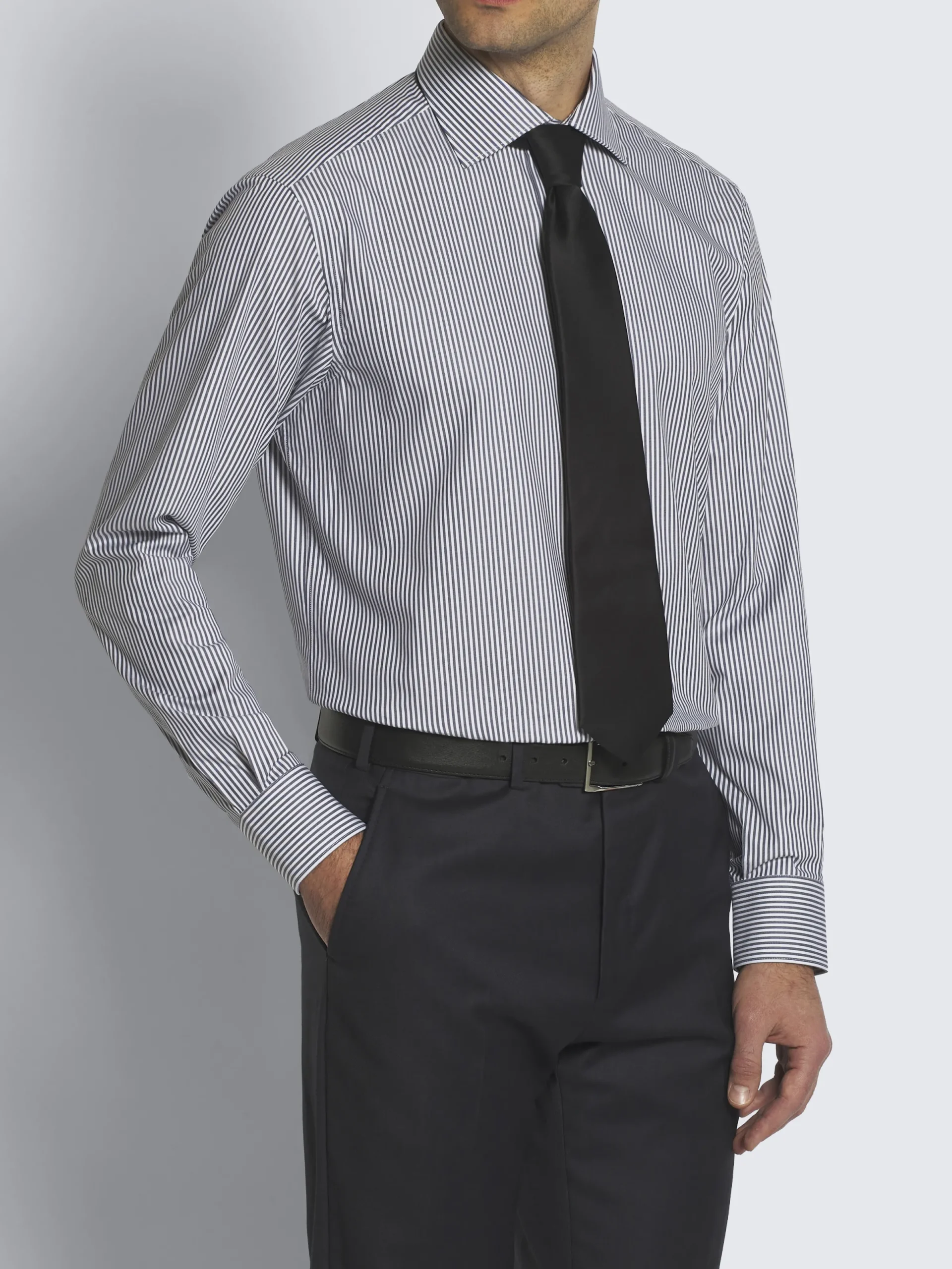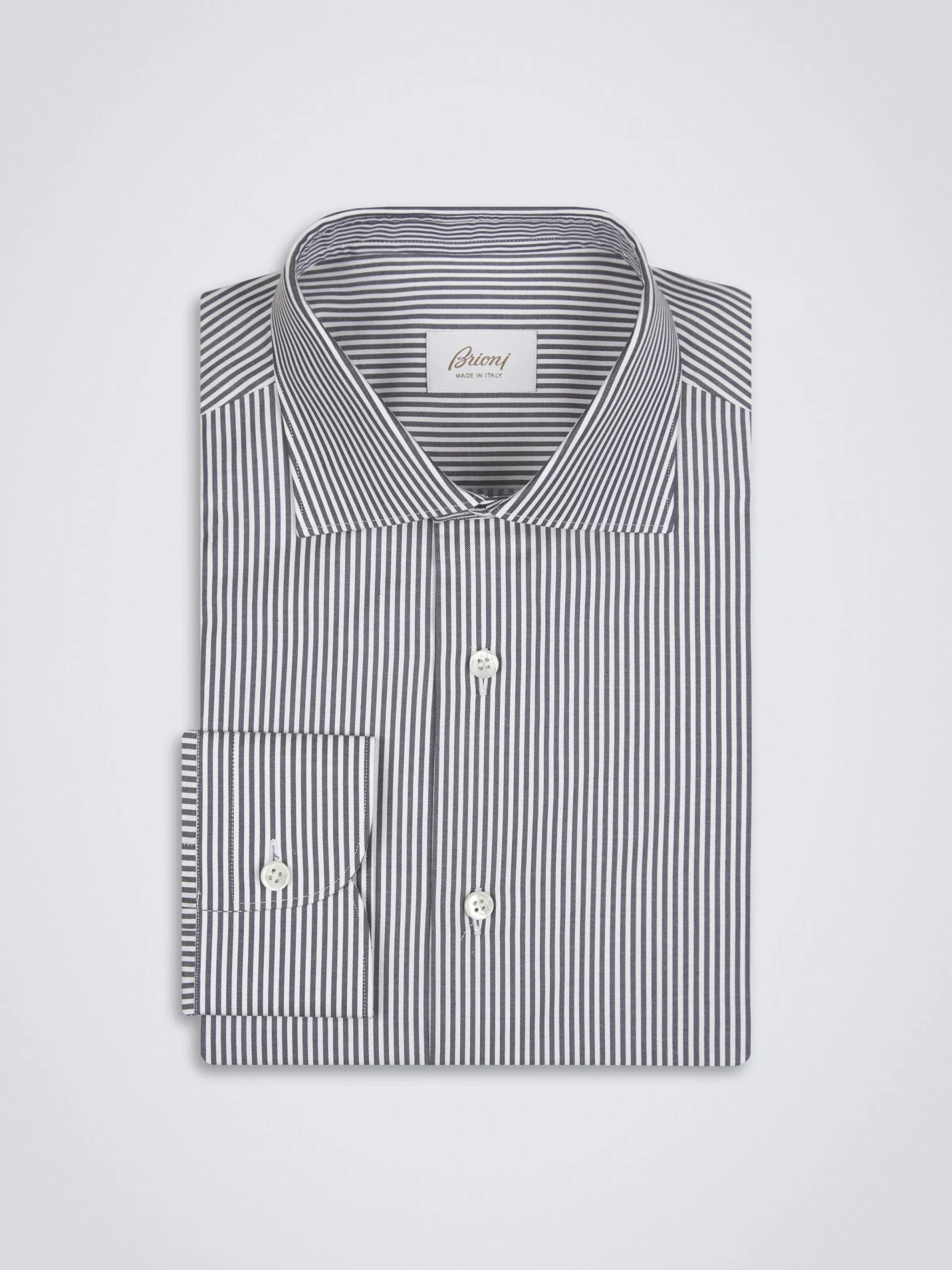 White and dark grey striped organic cotton formal shirt. Featuring a regular fit, rounded cuffs, mother of pearl buttons and without front placket. Sleek and sophisticated, it is perfect to be worn with a tie. A true wardrobe staple.nThis garment contains GOTS certified cotton. The Global Organic Textile Standard (GOTS) is a voluntary standard obtained by verification through independent third-parties. Practices include requirements on environmental management and wastewater; protection of health, safety and rights of employees; avoidance of hazardous substances.