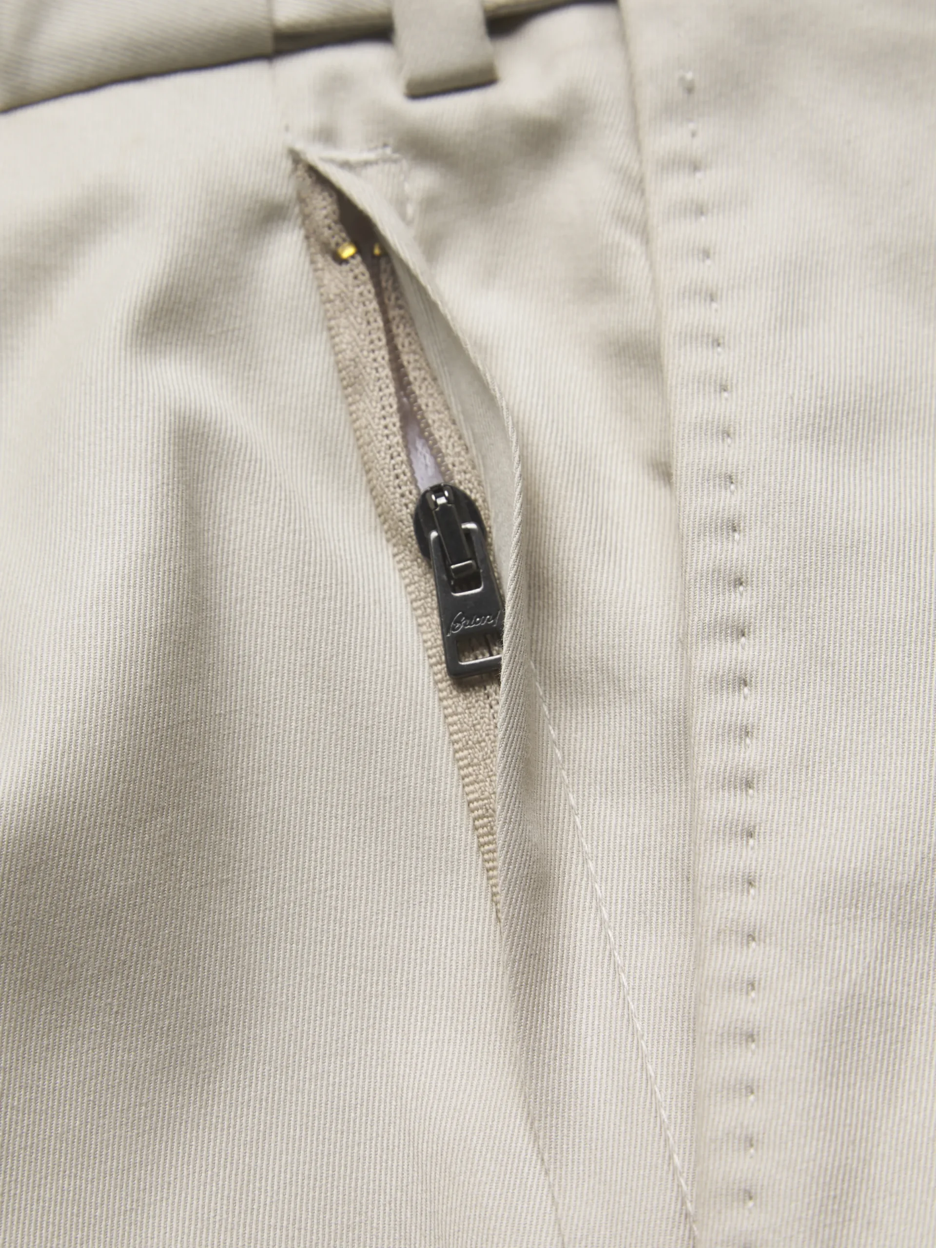 Ivory white cotton gabardine Journey trousers, featuring a special construction with self-regulating elasticated waistband with belt loops, these trousers will provide you with uncompelling comfort and great body adaptability. This model features an additional zipped pocket and regimental button back loop. This garment is part of our Golf Capsule.