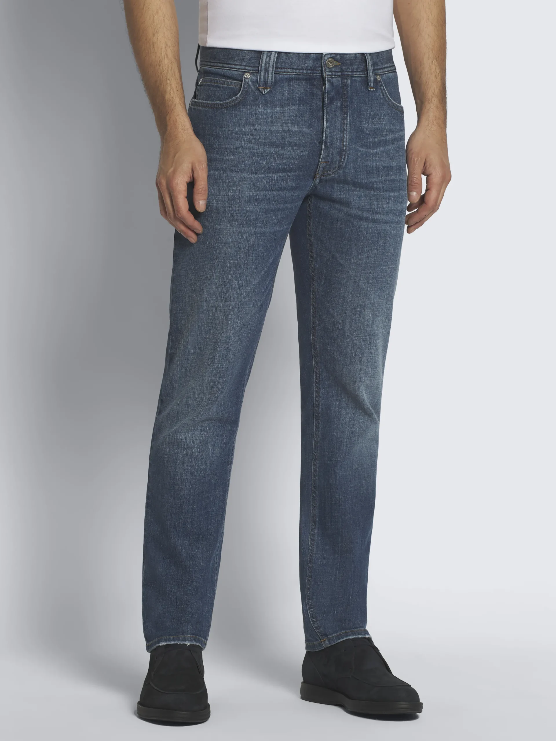 Essential sky blue stretch organic cotton Meribel jeans, featuring a regular fit. These sophisticated jeans ensure the ideal comfort and can be worn with casual and leisurewear pieces for a sophisticated yet nonchalant flair. This garment contains GOTS certified cotton. The Global Organic Textile Standard (GOTS) is a voluntary standard obtained by verification through independent third-parties. Practices include requirements on environmental management and wastewater; protection of health, safety and rights of employees; avoidance of hazardous substances.