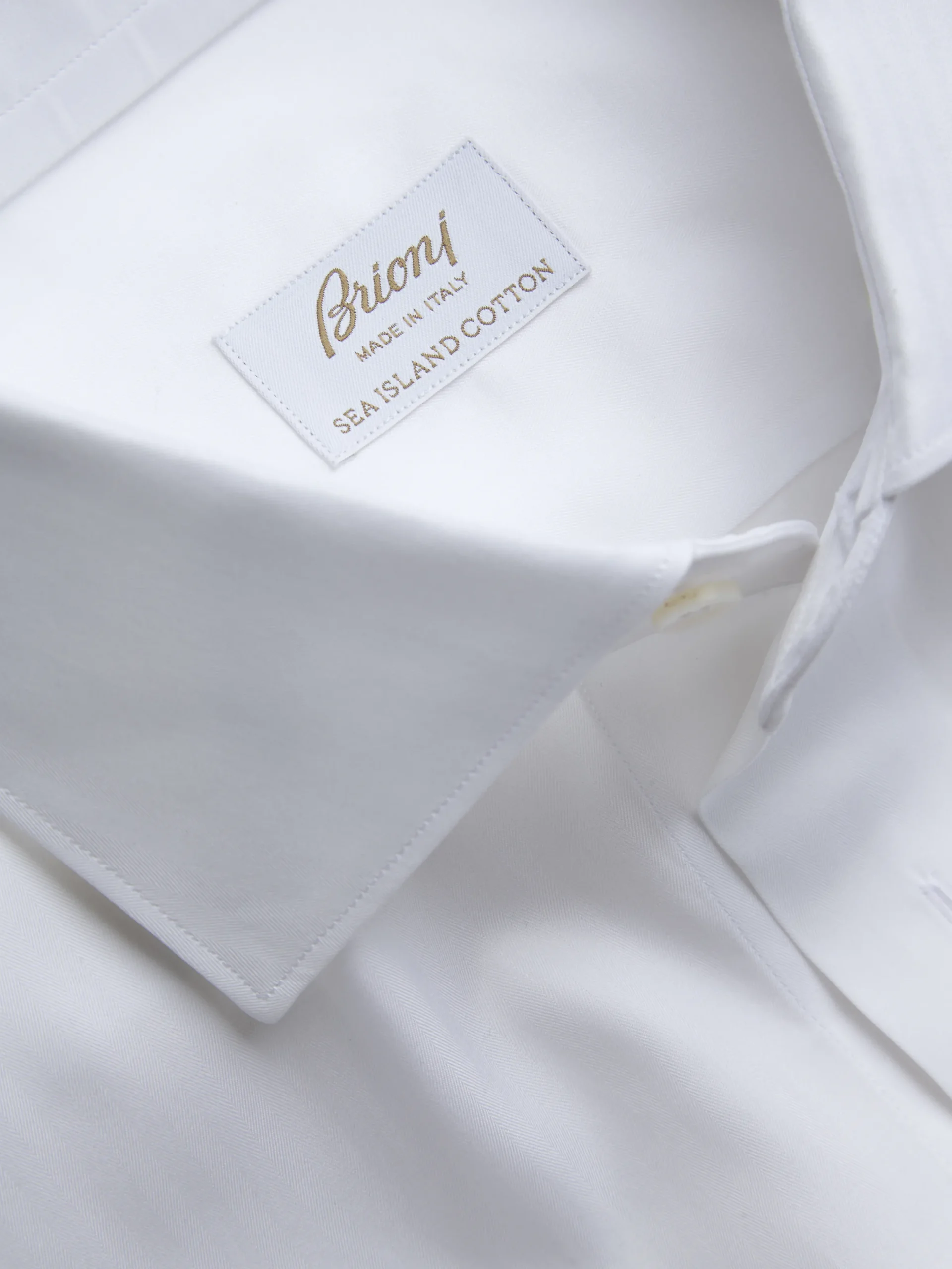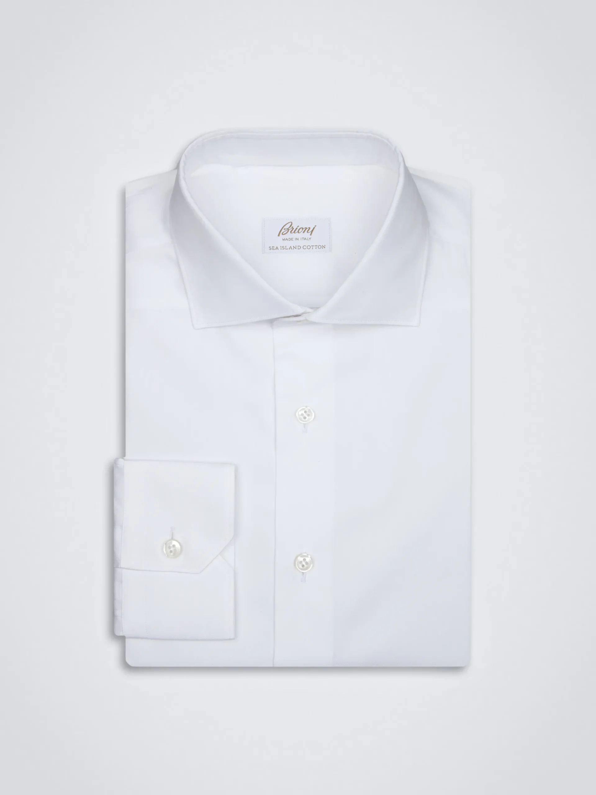 Essential white cotton formal shirt. Fitted, with spread collar, mitered cuffs, mother of pearl buttons and no front placket. Sleek and sophisticated, is perfect to be worn with a tie. A true wardrobe staple.nSea Island is one of the finest and most sought-after cottons in the world. Grown in limited quantities in the Caribbean, it is renowned for its long staple fibres which allow for a stronger, more resilient yarn, and result in an incredible hand feel, silky to the touch and smooth on the skin.