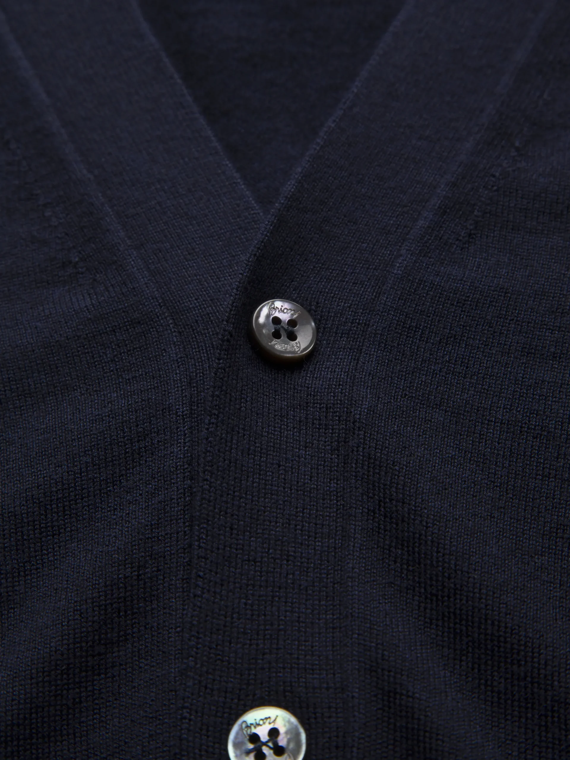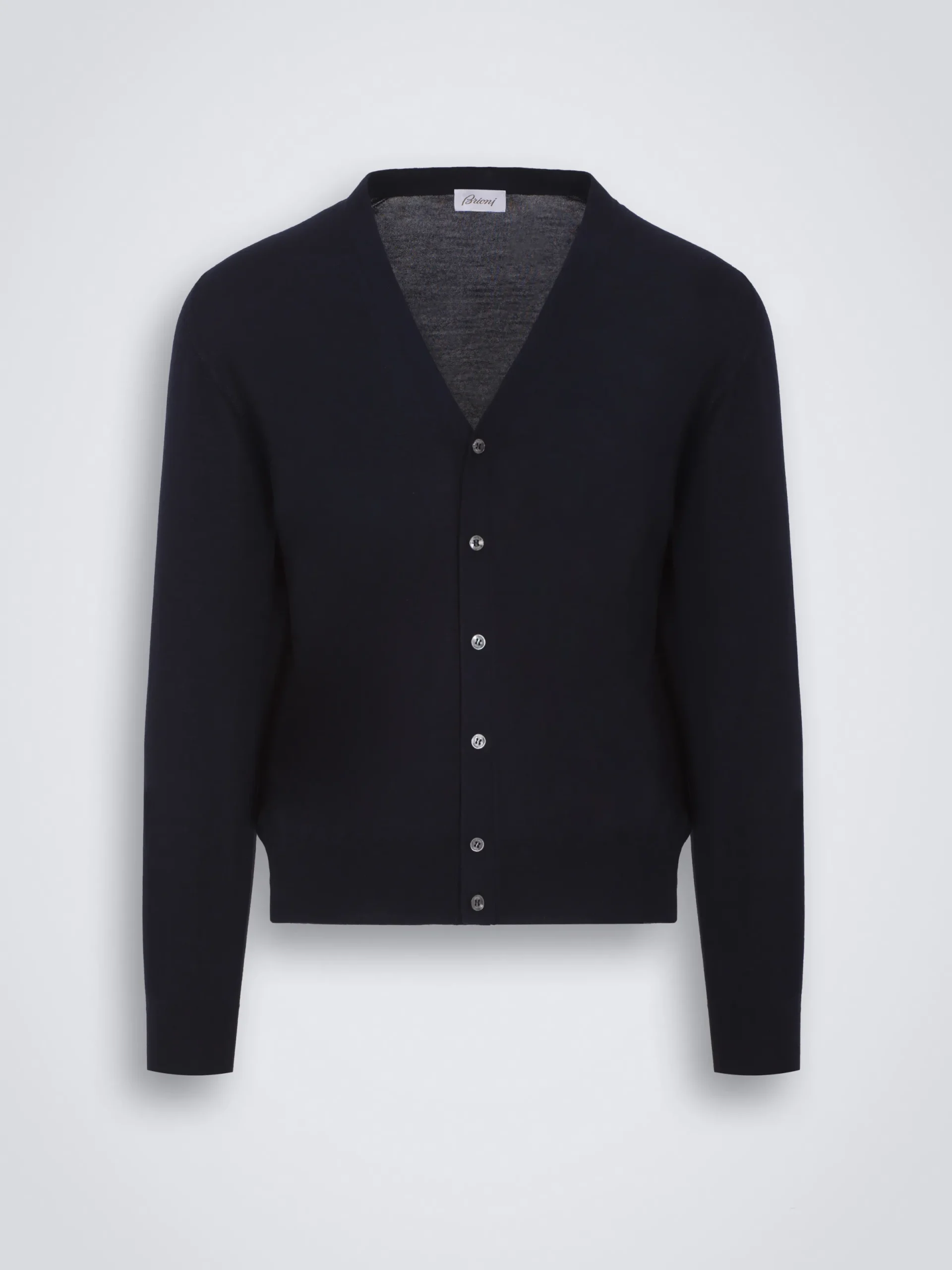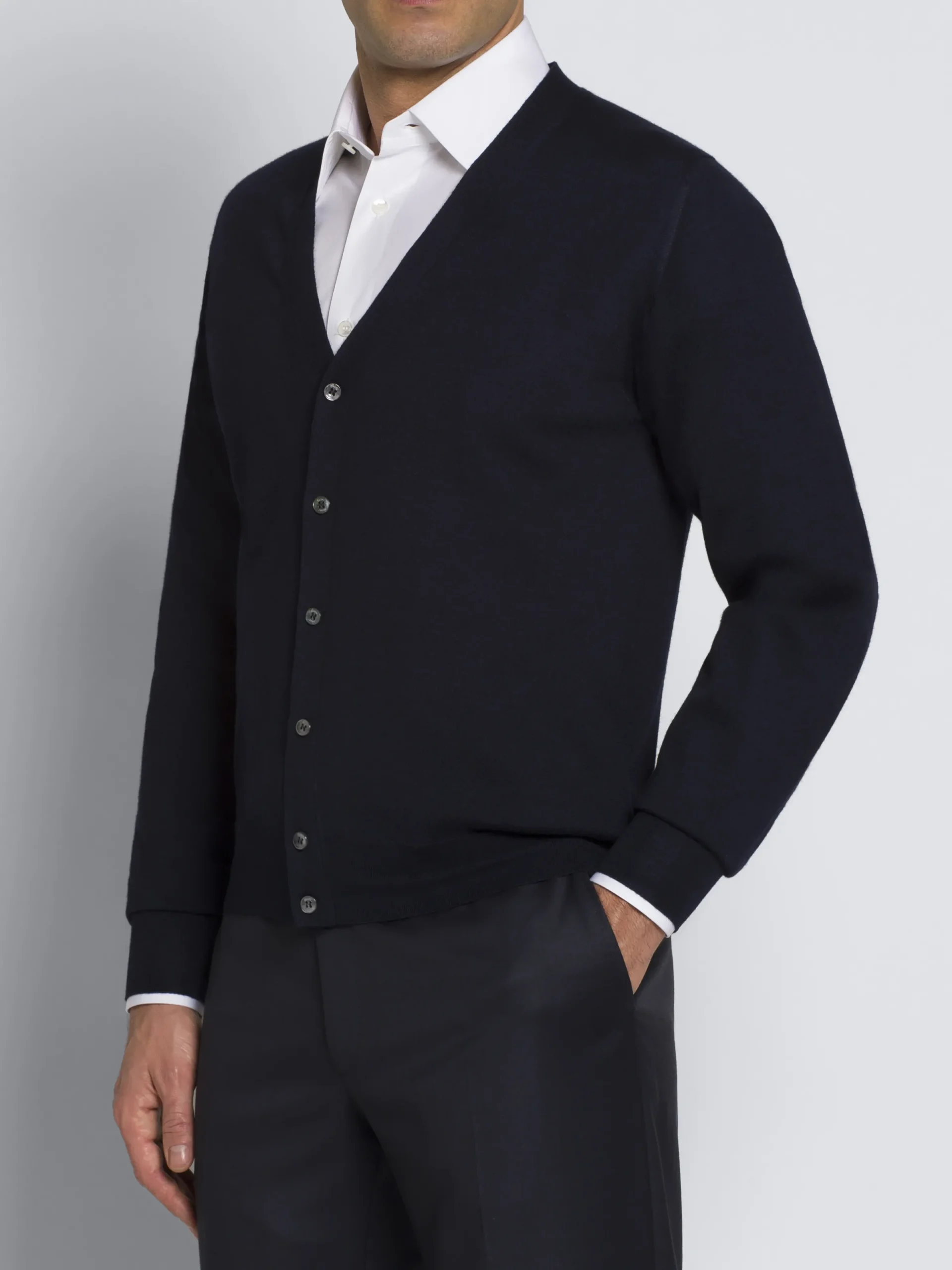 Essential midnight blue cardigan with long sleeves and six mother of pearl buttons, crafted from a blend of wool, cashmere and silk. Its soft hand feel and comfortable fit make it perfect to be worn year-round and it matches perfectly with formal and semi-formal attire.