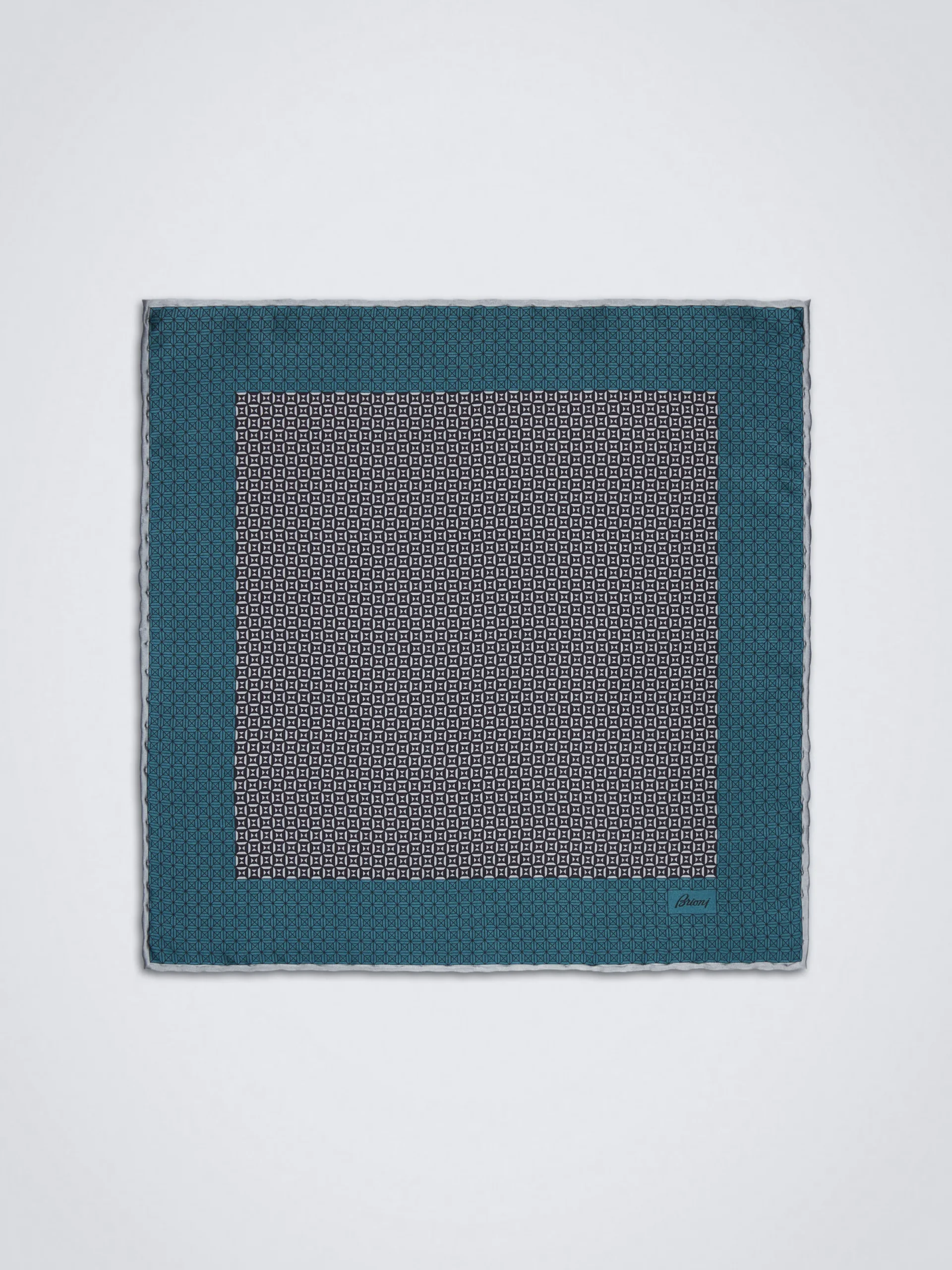 Ice grey and teal green pocket square in super soft silk with printed micro motif. The screen printed technique used to create this accessory, is made in the atelier by highly skilled artisans will allow vivid colour to seamlessly penetrate the most delicate of fabrics in intricate designs. An aesthetic and sensory joy for the contemporary gentleman.