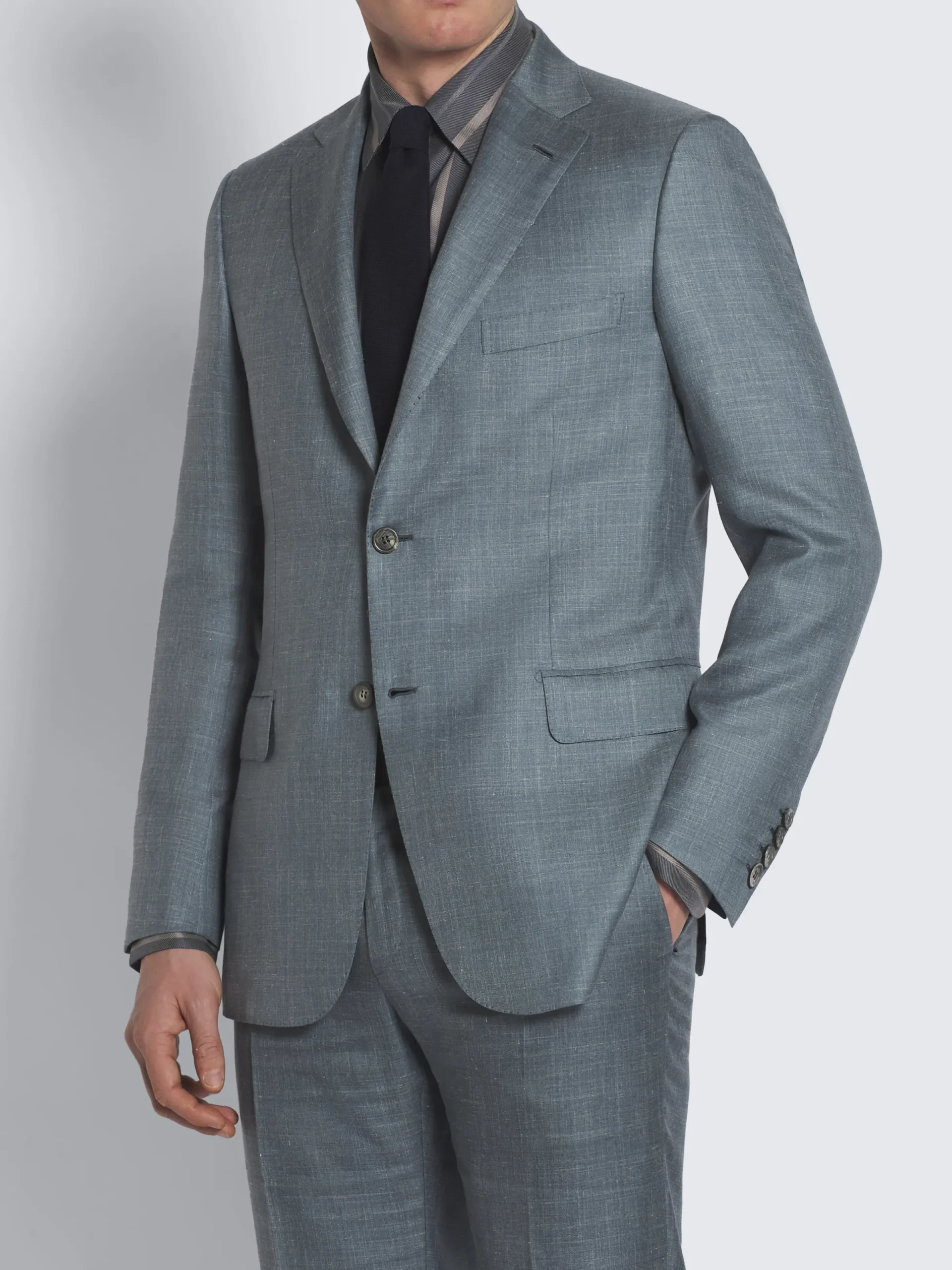 Light blue silk, cashmere and linen slab twill Featuring a regular fit, notch lapels, two back vents, one chest pocket, two flap pockets, two internal jet pockets and one internal pocket with button closure. Based on the classic Brunico model but with more relaxed and light shoulders, this jacket is the perfect addition to your formal wardrobe.