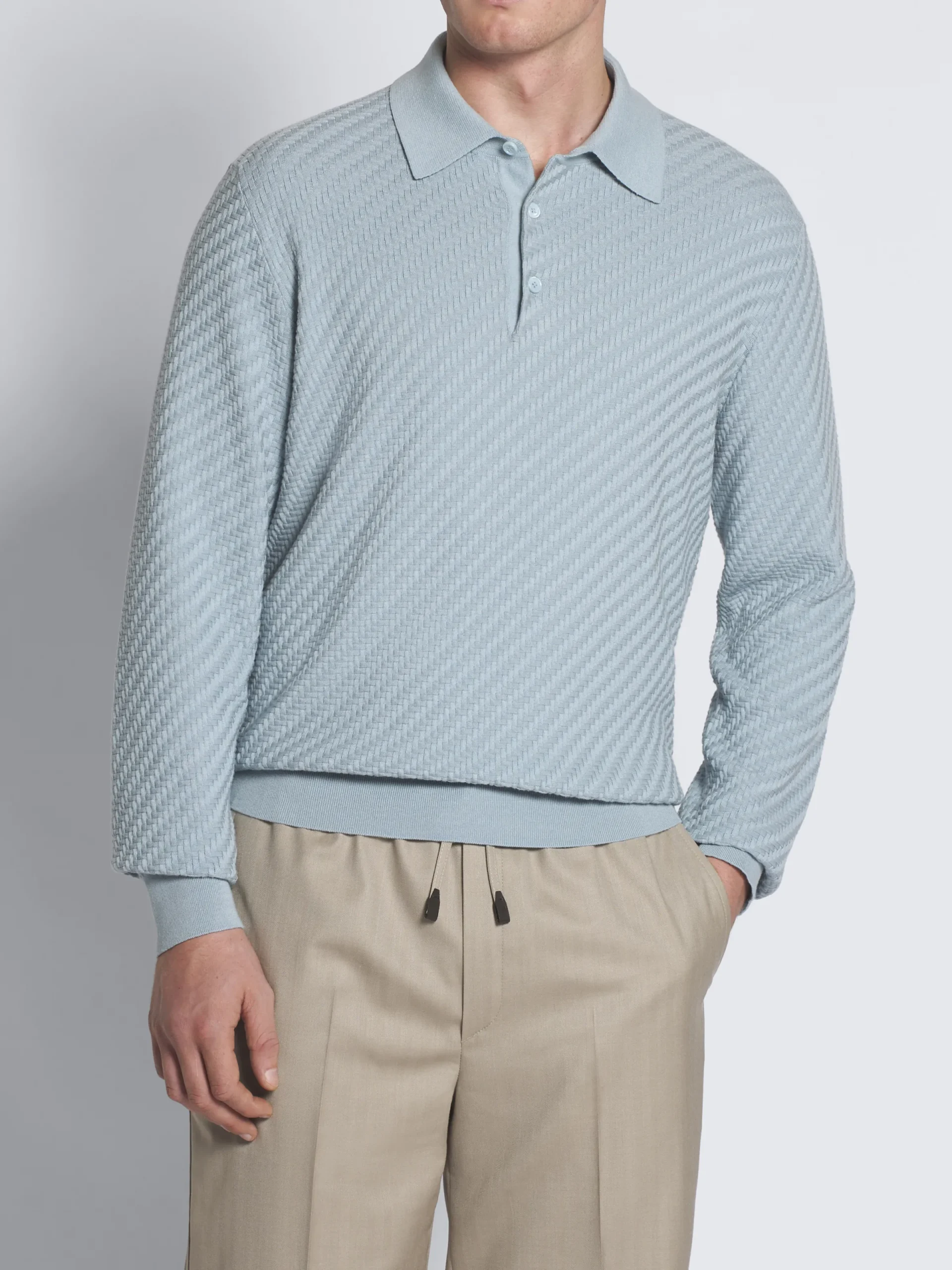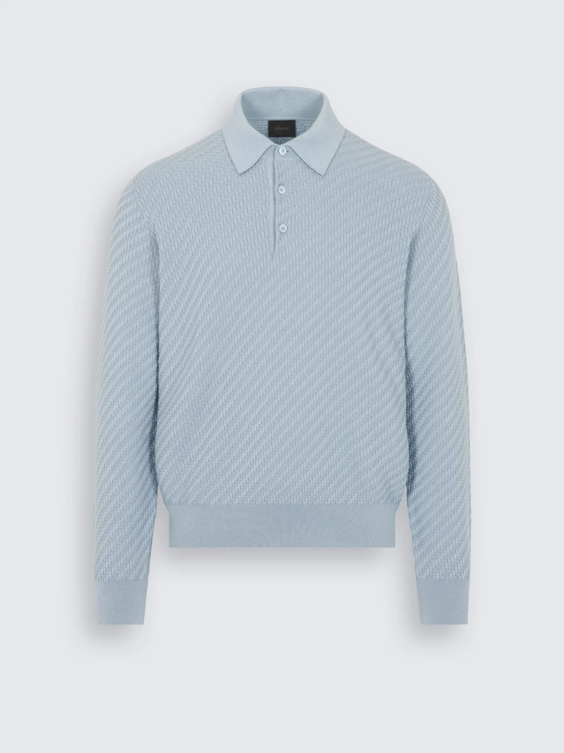 Sky blue cotton, silk and cashmere Trama weave long-sleeved polo. Featuring a regular fit, shirt collar and mother of pearl buttons. Its refined knit perfectly matches with semi-formal attires. The Trama weave features tone-on-tone ribs for a uniquely subtle, tactile feeling. This pattern mimics the San Pietrini, the cobbled stones characterizing the streets of Rome. An iconic motif drawn from the eternal city itself. nThis garment contains GOTS certified cotton. The Global Organic Textile Standard (GOTS) is a voluntary standard obtained by verification through independent third-parties. Practices include requirements on environmental management and wastewater; protection of health, safety and rights of employees; avoidance of hazardous substances.