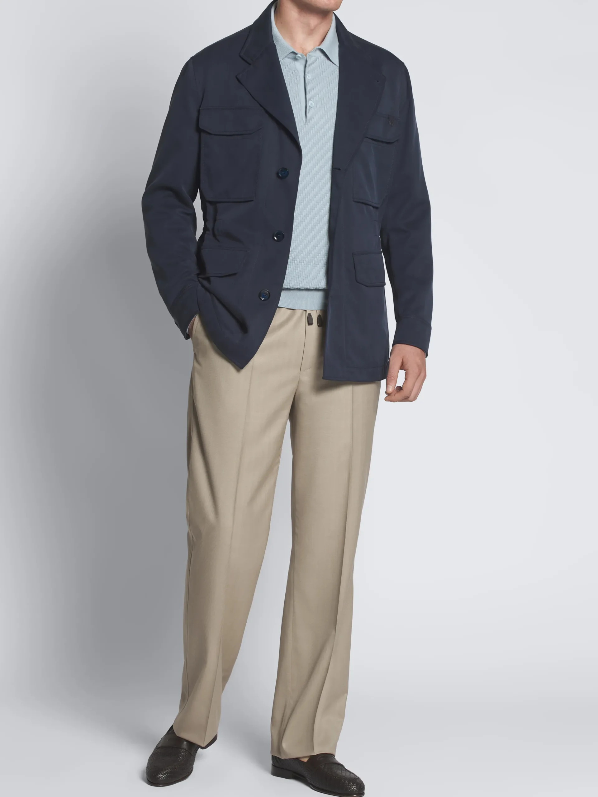 “,”features”:”Regular fit 3D Trama weave Shirt collar Mother of pearl buttons Gauge: 18 GG