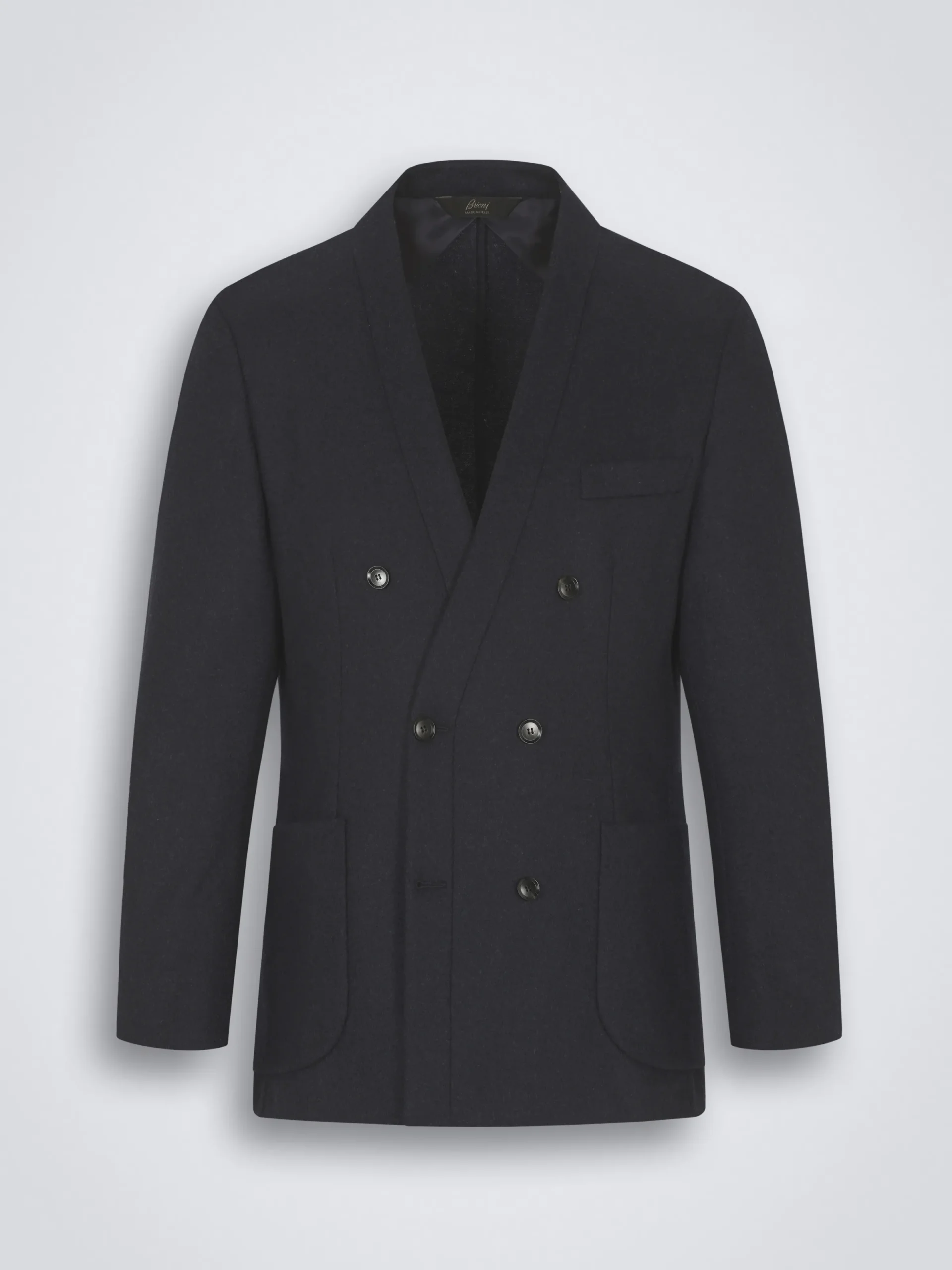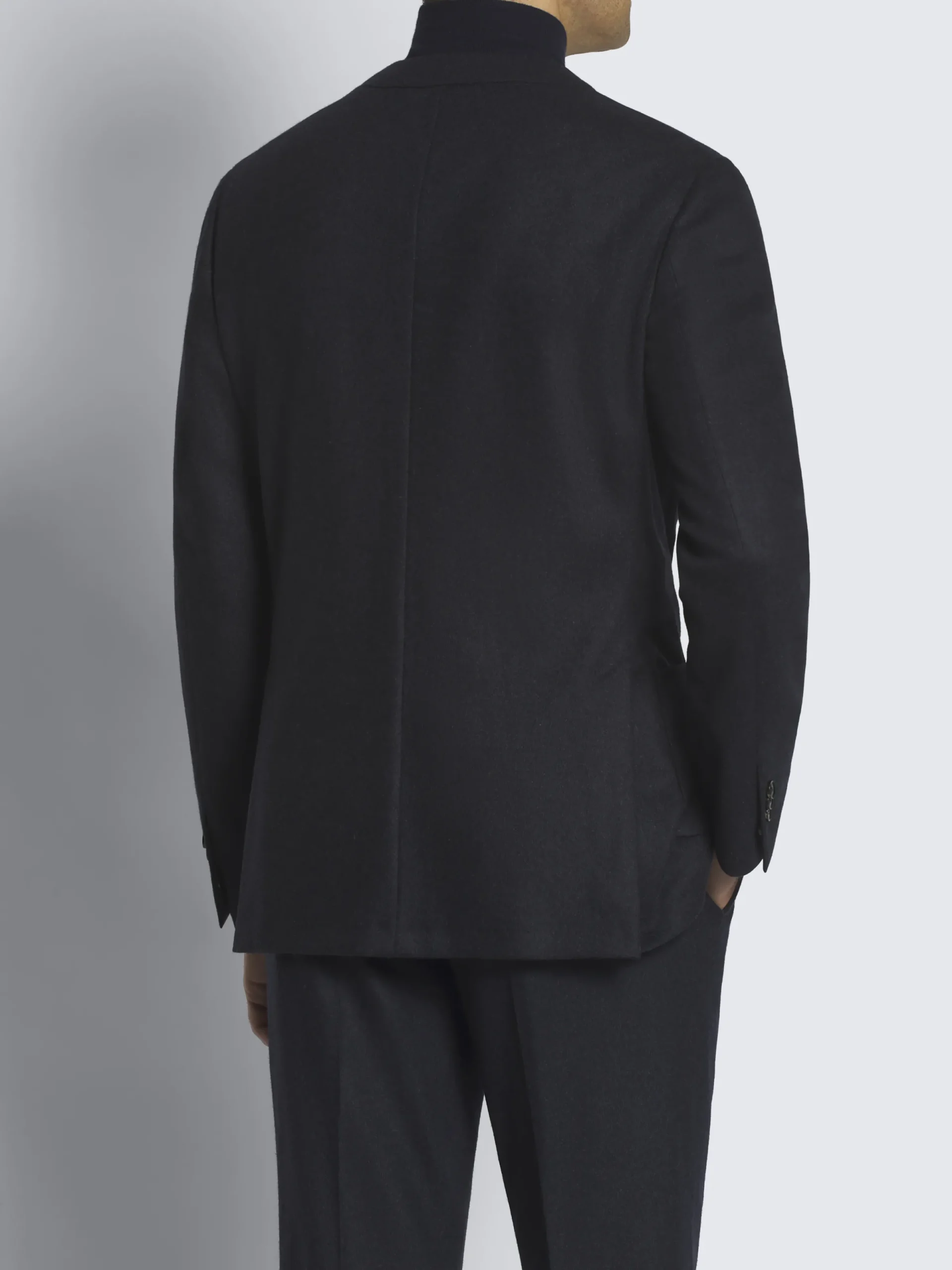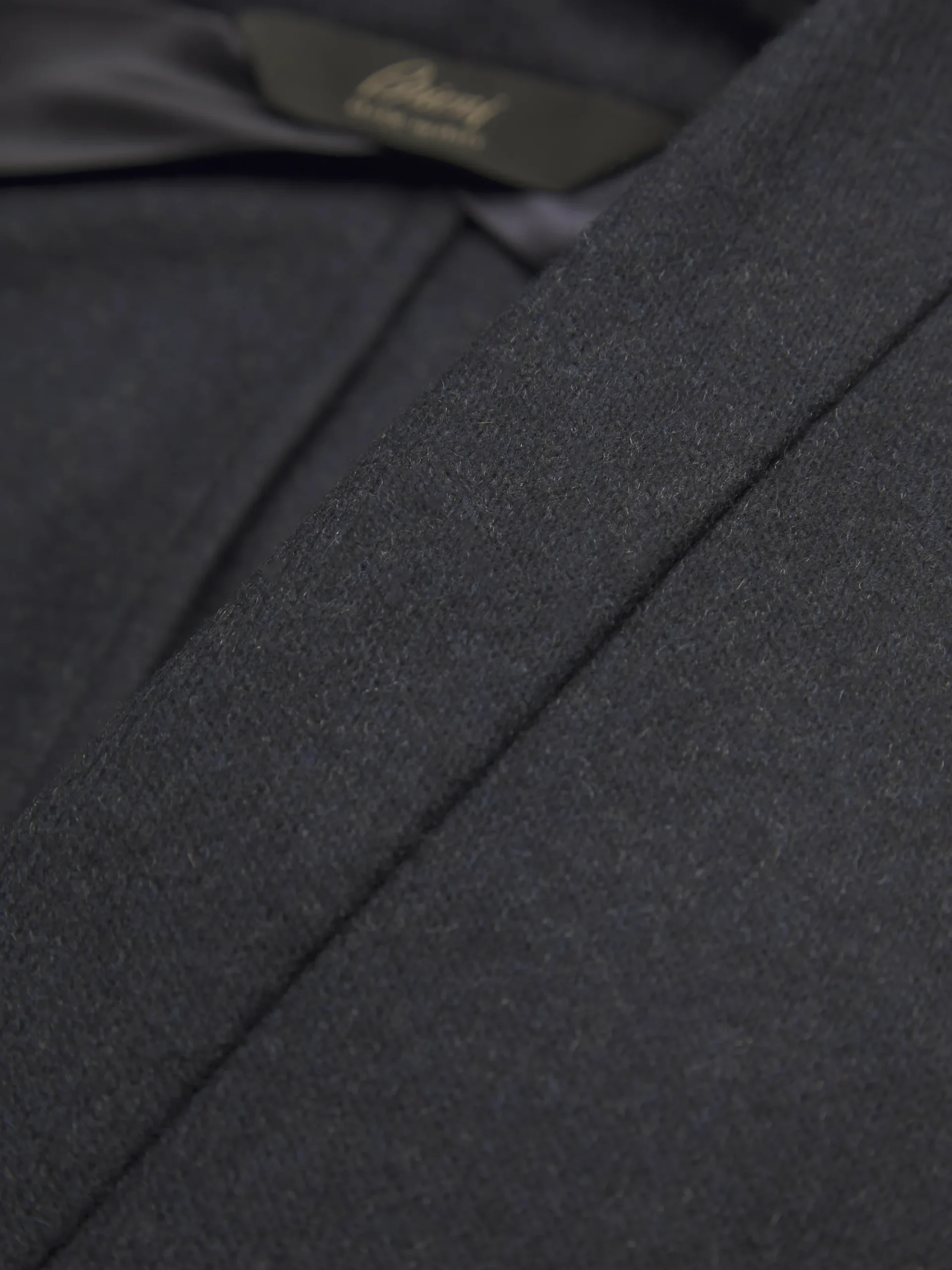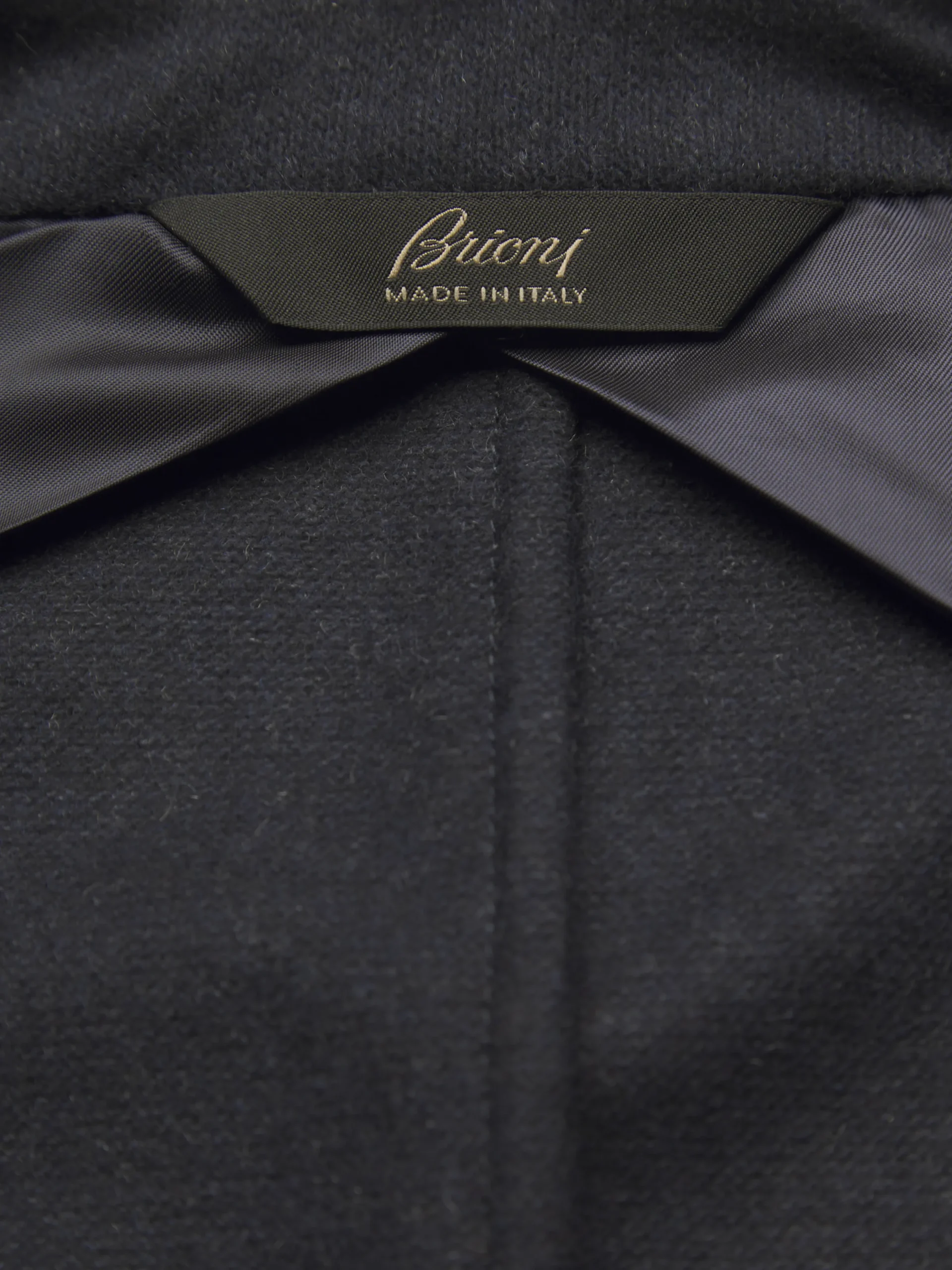 Midnight blue cashmere jersey Jardigan. A true Brioni original from 1955, the Jardigan was an innovative take on two wardrobe staples, the jacket and the cardigan, that were merged to create a new icon of effortless elegance. Collarless, deconstructed, unlined and lapel-free, this one and a half breasted version features branded horn buttons closure, classic jacket cuffs, a jet breast pocket, two patch pockets and two back vents with branded tape in between. A perfect touch of sophistication for informal occasions, this garment offers great wearability and illustrates our commitment to relaxed dressing with style.