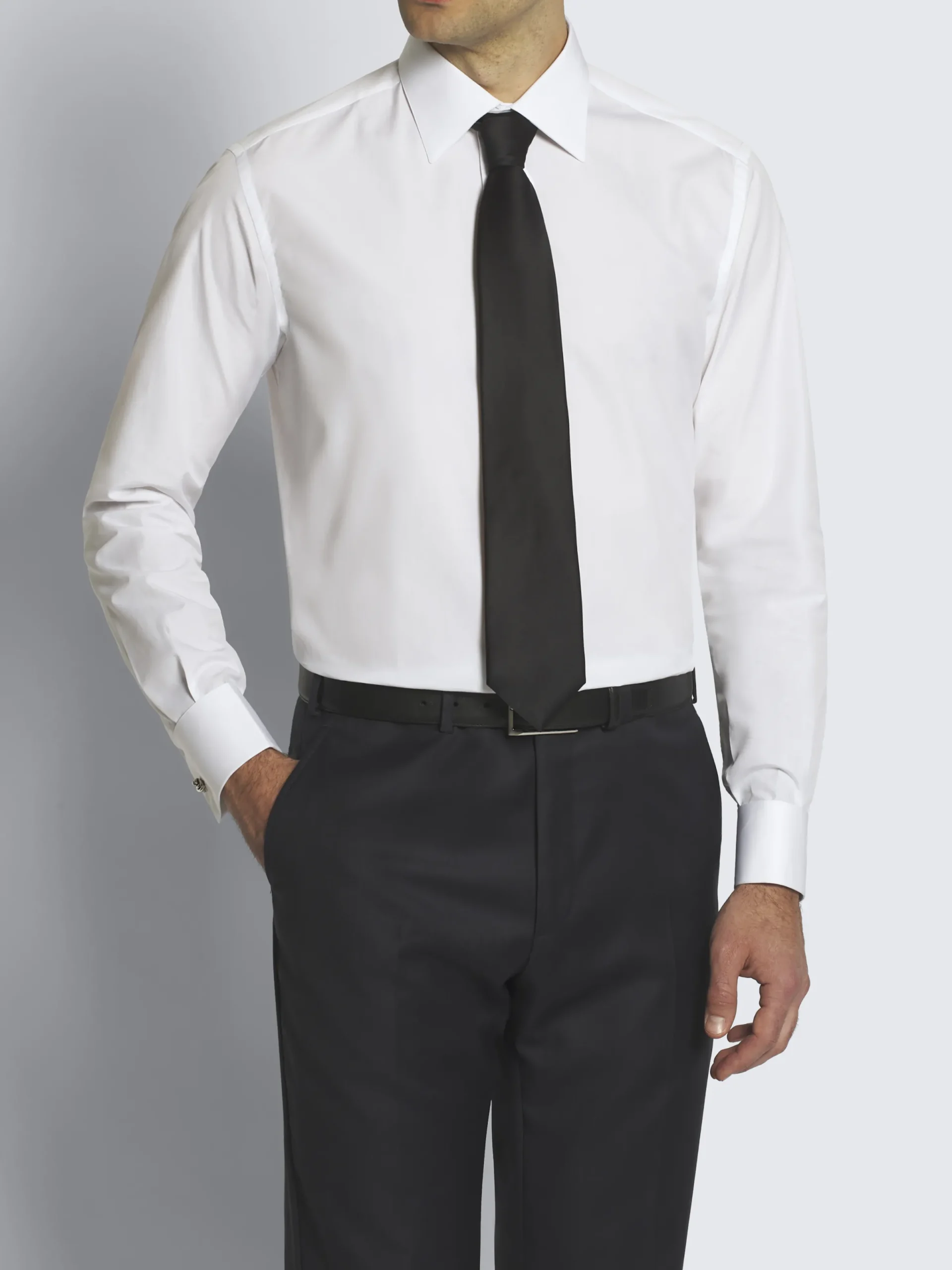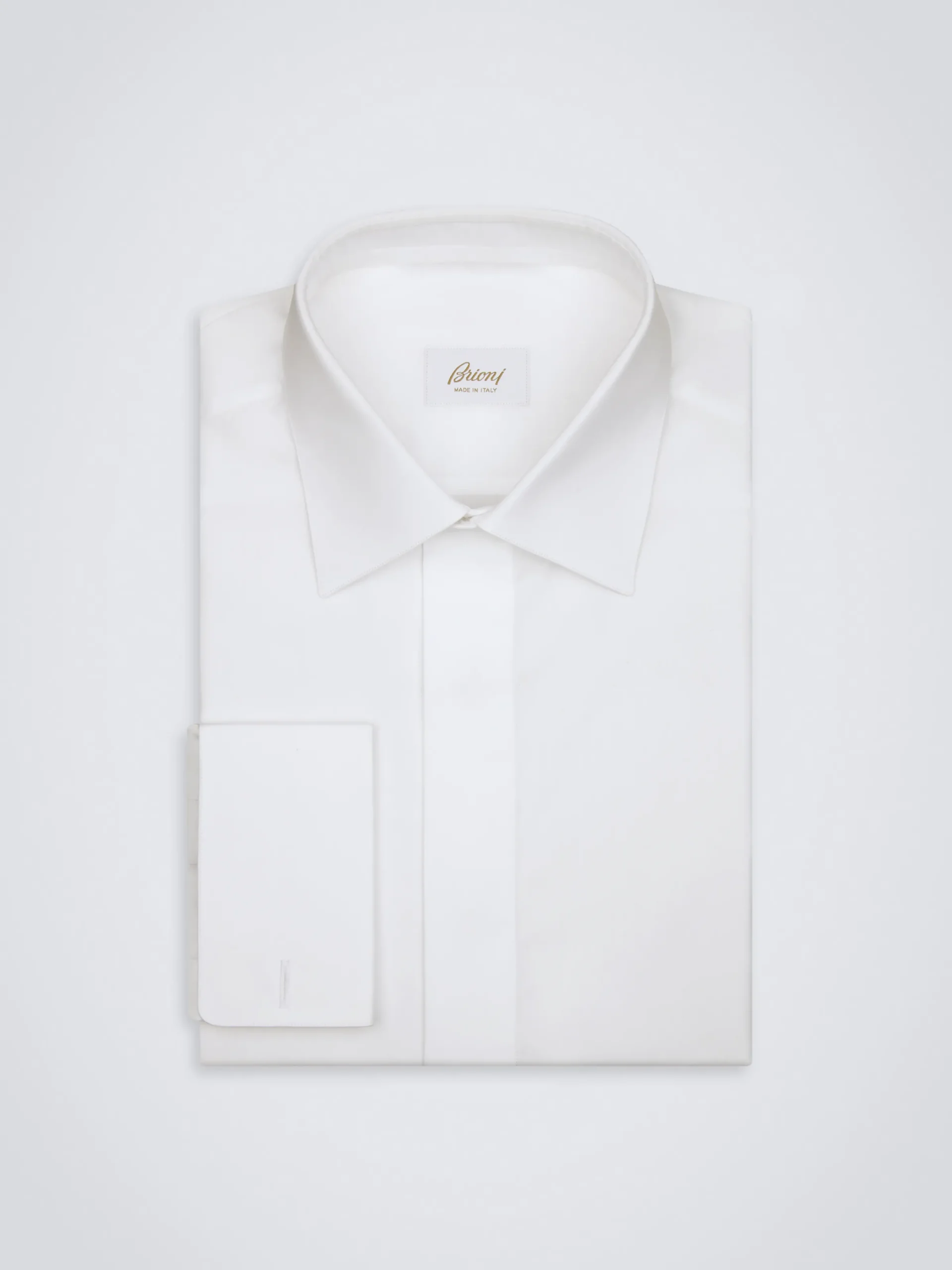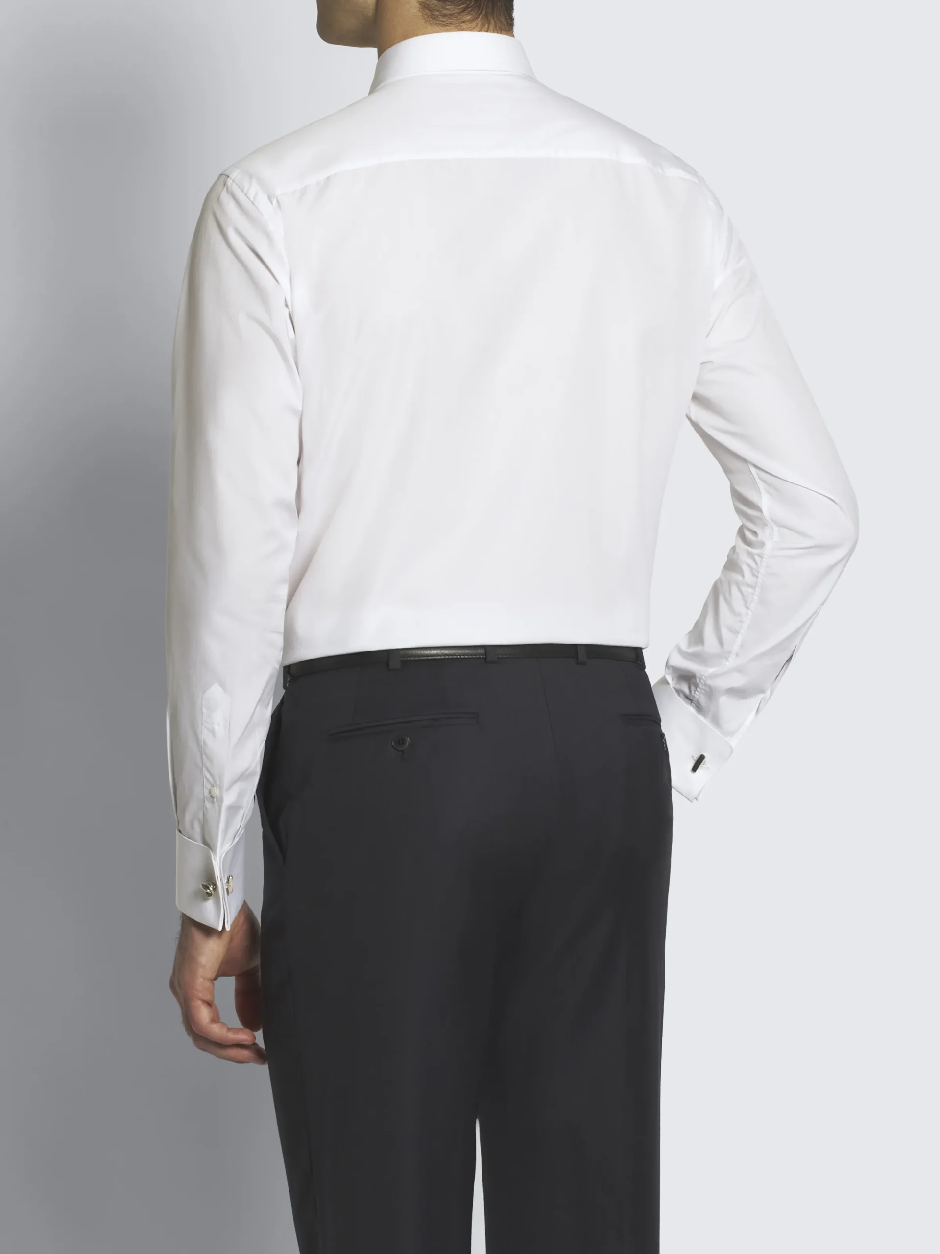 Essential white cotton poplin evening shirt with placket, hidden mother of pearl buttons on front and French cuffs. Featuring a regular fit, this evening shirt guarantees a soft touch and a pleasantly fresh feeling of lightness on the skin.