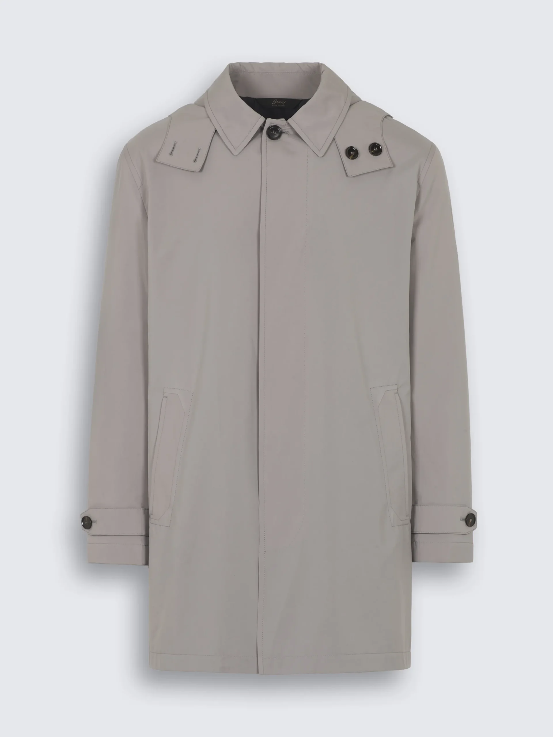 “,”features”:”Shirt collarnDetachable hood with adjustable elastic bandnLeather undercollar with debossed logonHidden horn buttons front closure with bevelled topstitchingnAdjustable bevelled tab on the cuffs with buttonsnTwo front vertical pockets with bevelled shape topstitchingnOne internal zip pocketnLined in technical fabricnWater repellent and wind proofnLength: 85 cm measured on a size 50
