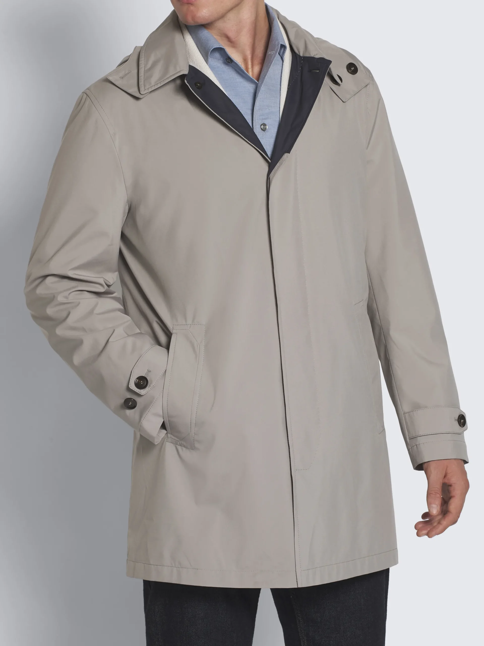 Lead grey Performa raincoat. Featuring a shirt collar, leather undercollar with debossed logo, hidden horn buttons front closure with bevelled topstitching, two front vertical pockets with bevelled shape topstitching and one internal zip pocket. A detachable hood with adjustable elastic band, adjustable bevelled tabs on the cuffs with buttons and lining in technical wool, add comfort and functionality to this garment. Water repellent and wind proof, it is the perfect layer to wear with different types of weather.