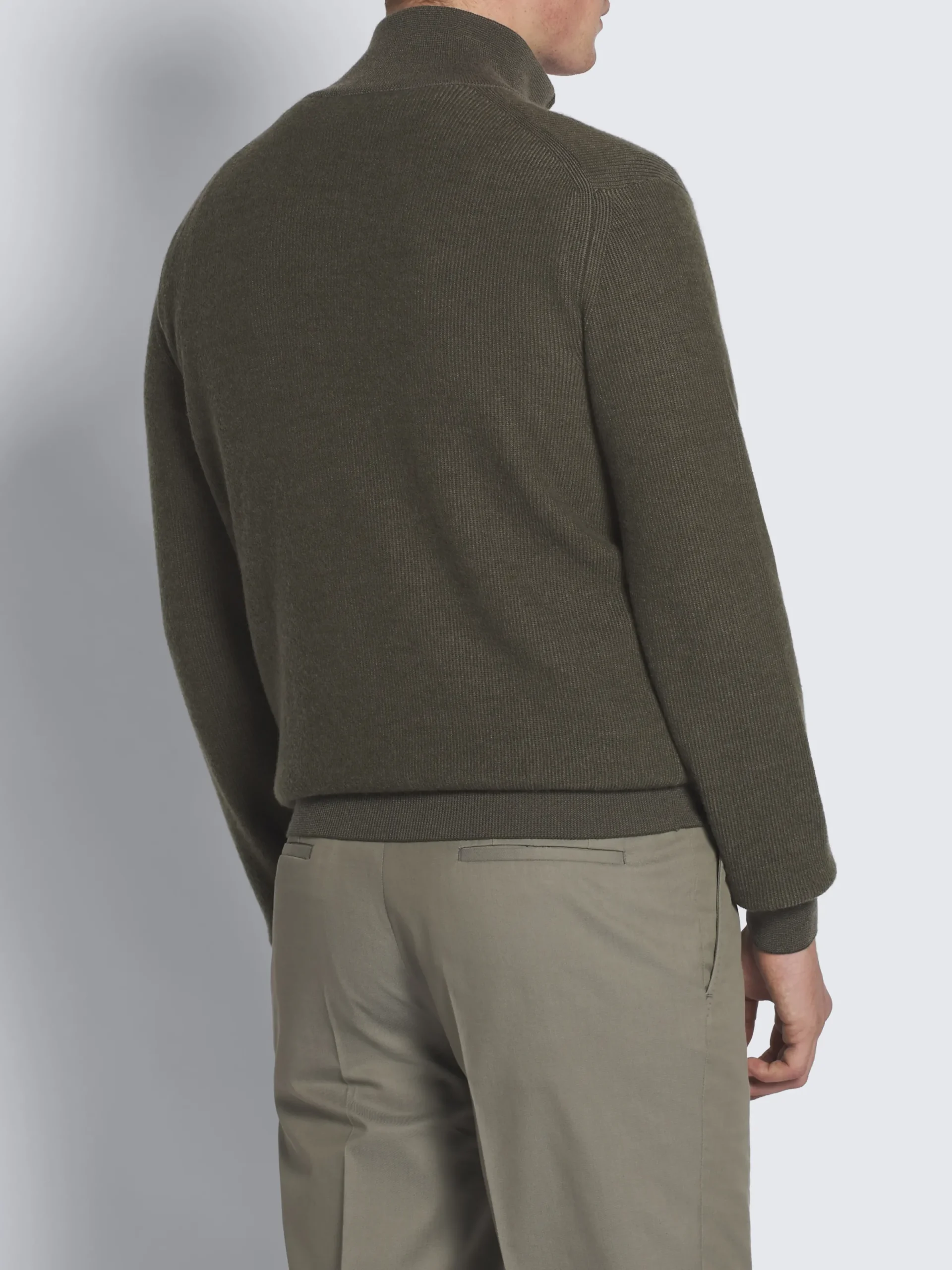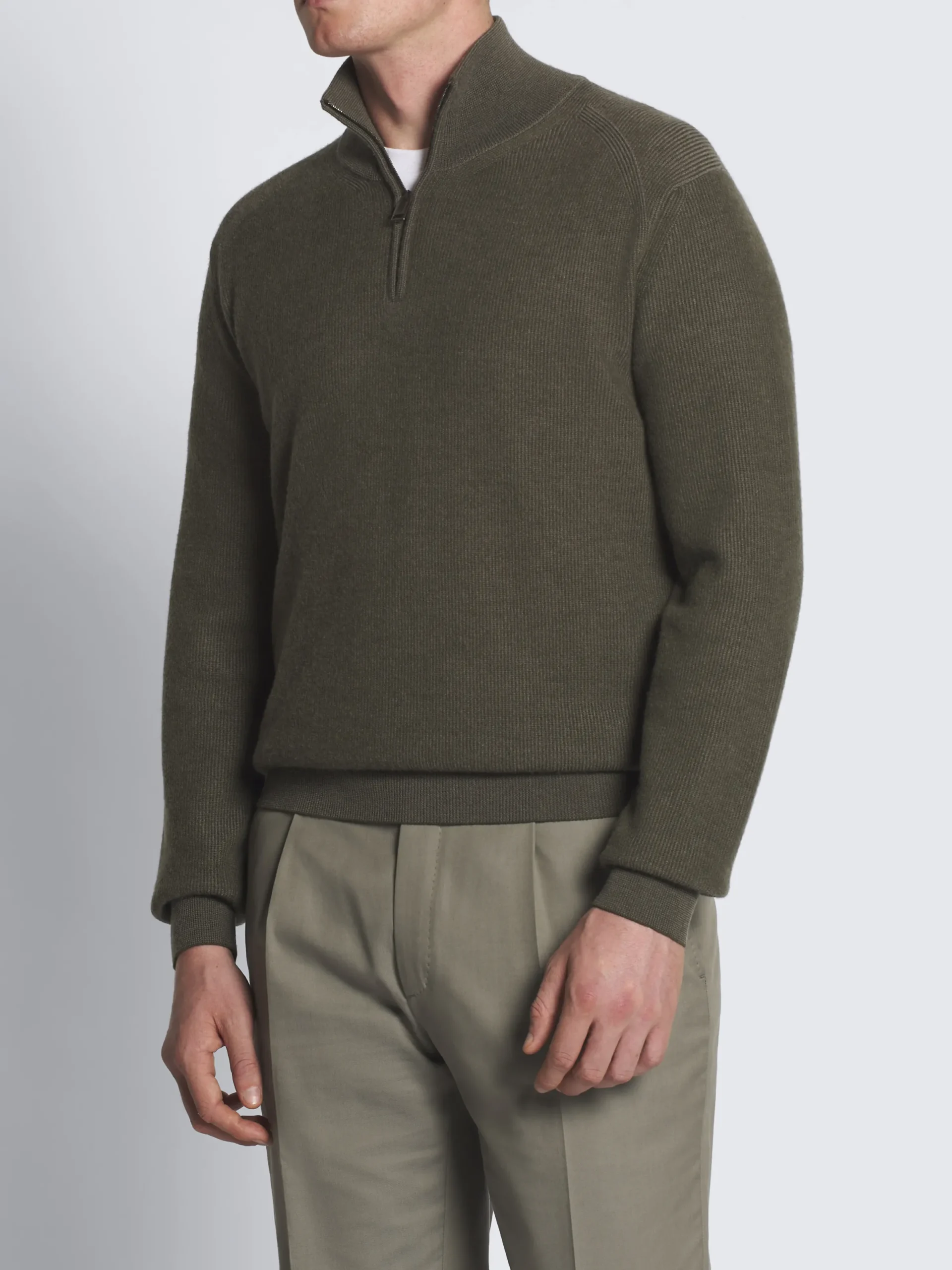 Military green and taupe cashmere and wool half-zip mockneck sweater. Featuring a regular fit, half-zip with metal puller, and light ribs effect on collar, hem and cuffs. nThis garment presents a vanisé weaving technique, in which vertical stripes in distinct colours are perfectly merged for a delicate visual depth. Effortless, it is an indispensable piece for a gentleman’s leisure wardrobe.