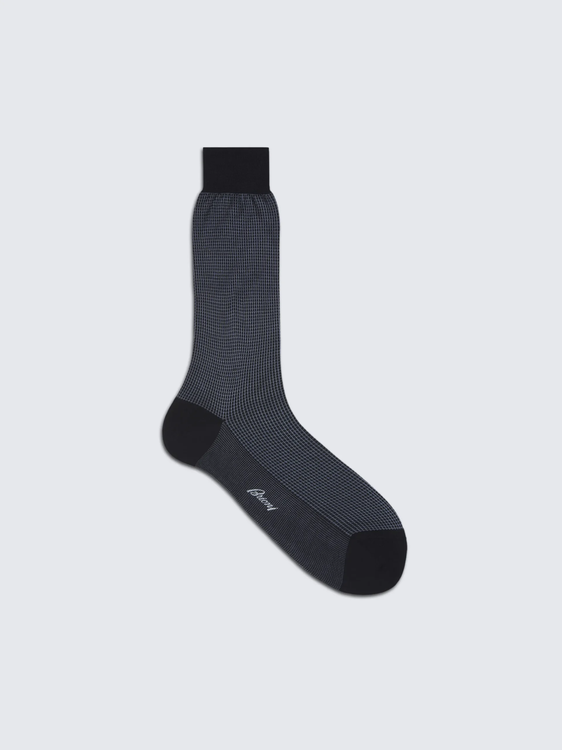 Navy and light blue micro motif cotton and silk socks. Featuring a Brioni logo on the bottom, these mid-calf socks are both soft and breathable: an essential piece in every gentleman wardrobe. The perfect final touch for a polished and sophisticated outfit.