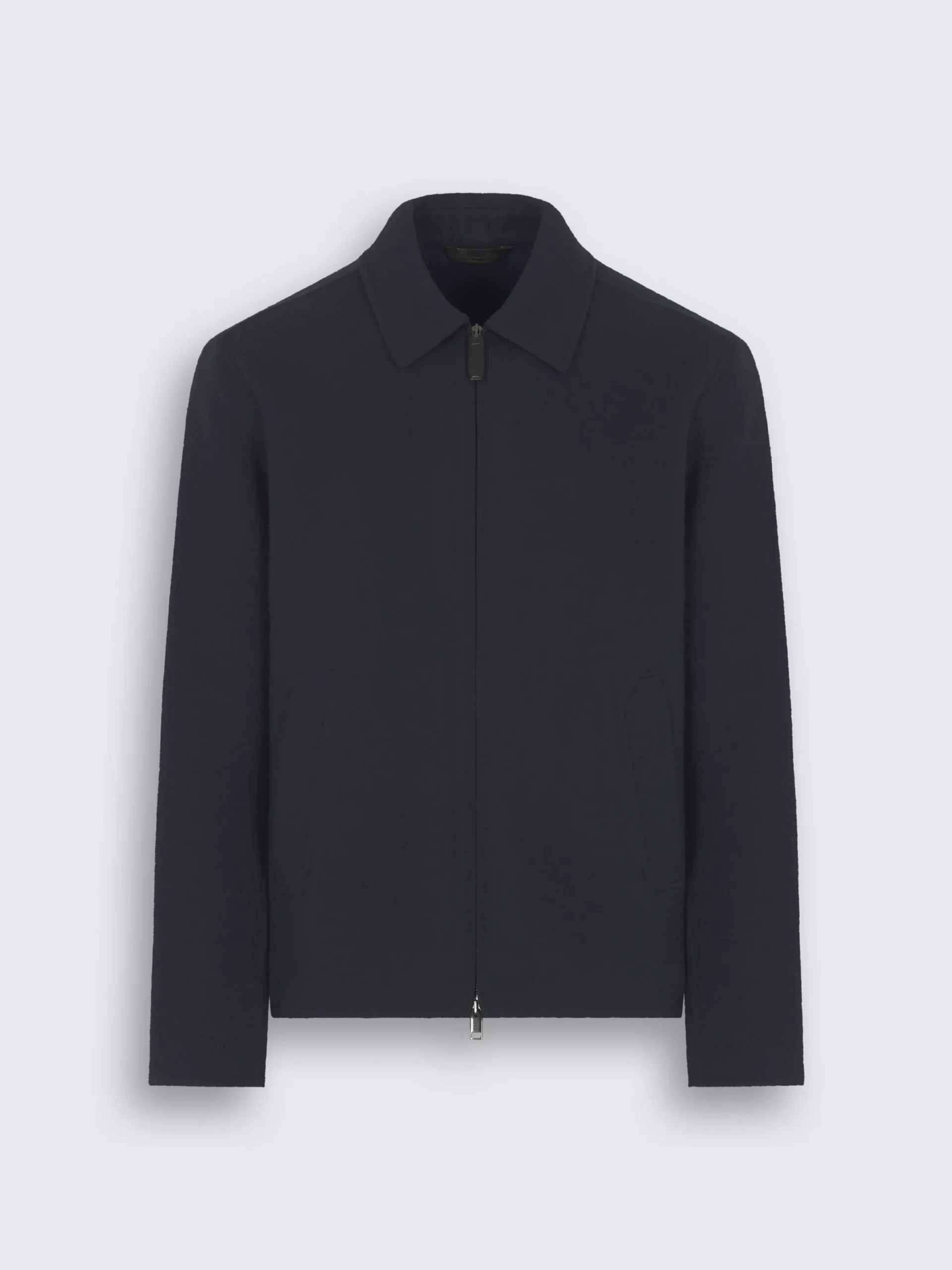 Navy blue double-splittable jersey shirt collar blouson, vicuña on the outside and cashmere on the inside. Featuring a dual zip with metal and leather pullers closure, two side pockets with bevelled topstitching and one internal zip pocket. Lined sleeves and a leather tab with with button closure on the cuffs finish this precious piece. The perfect final layer for a refined leisure look.nThis piece features our iconic double-splittable fabric: in this construction, the faces of two separate fabrics are painstakingly and invisibly sewn together giving the aesthetic and fluidity of a single cloth. The edges are finished by hand by the finest craftsmen, displaying sartorial know-how at its best.