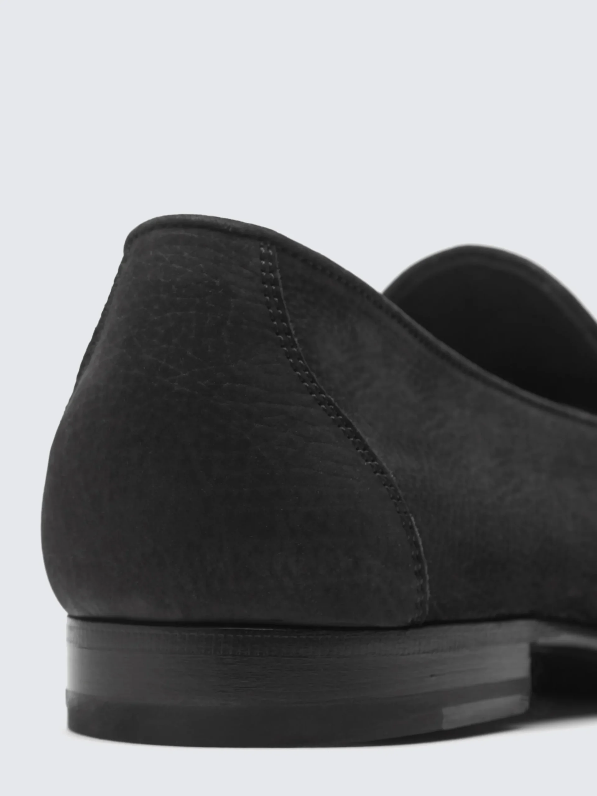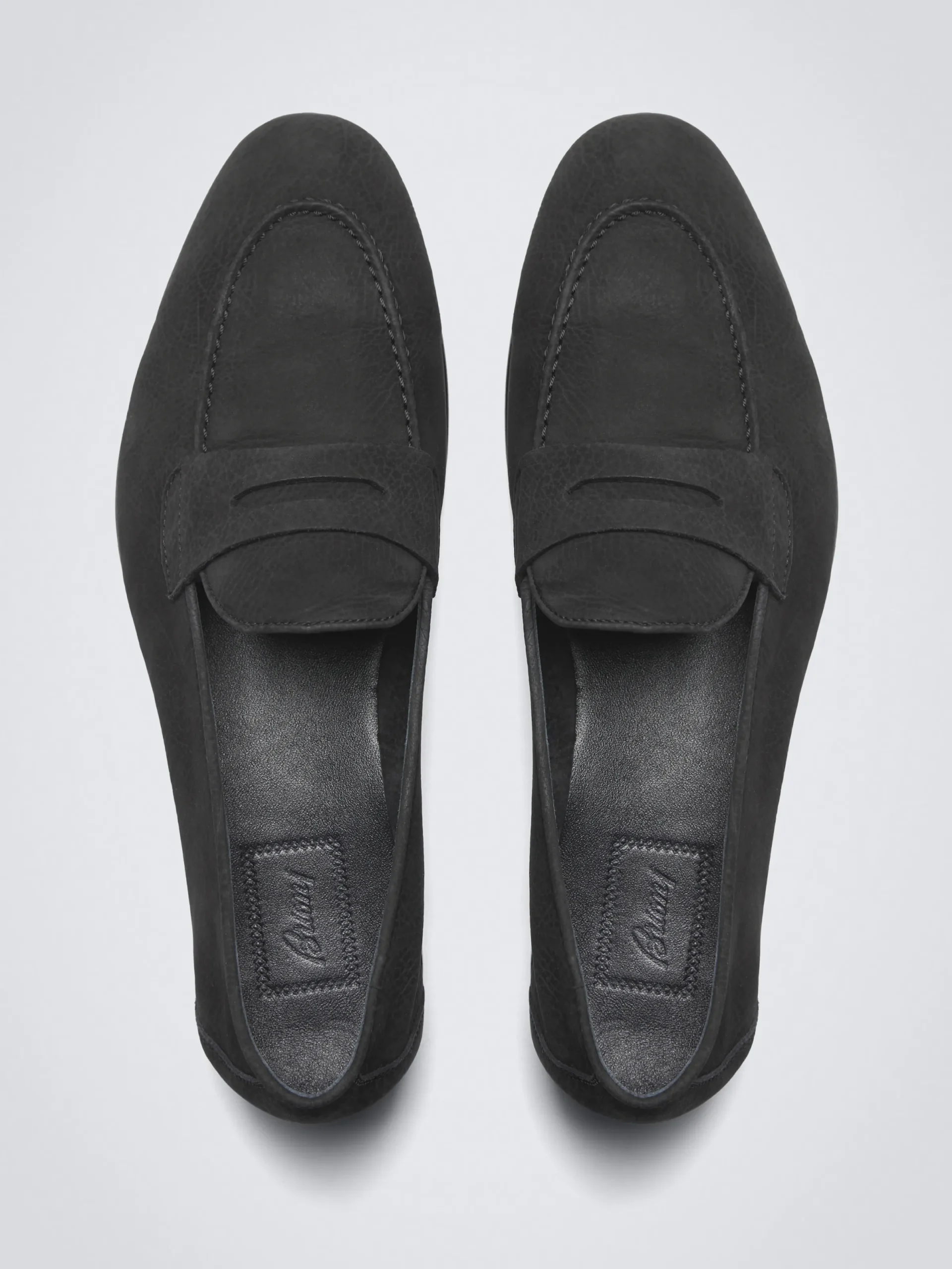 Black Appia penny loafer in nubuck, an epitome of elegance. Realized in a classic almond shape with extra flexibility in the sole, resulting in a refined look with unparalleled comfort. Nubuck is recognized for its soft velvet touch and renowned for its finishing. The outer side of the raw skin undergoes a sanding treatment that erases the first layer of the leather to obtain a powdered texture. It is a very refined tannery process which makes the shoes even more valuable. Named after the extensive Roman road, the shoe was born as a challenge for the classic moccasin to suit long walks. A timeless rounded shape complements the natural movement of the foot. An elegant icon that fits like a glove.
