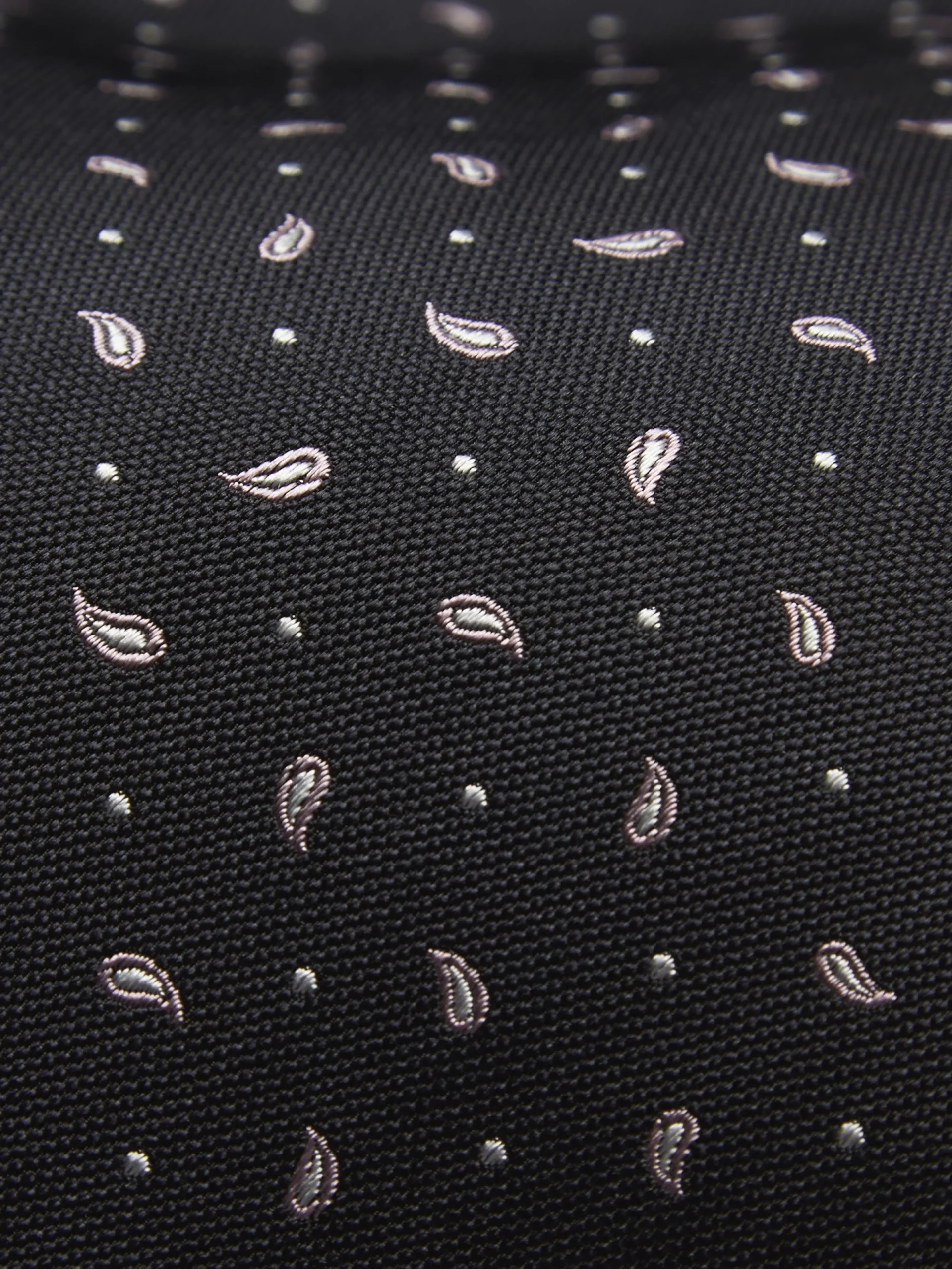 100% silk black tie with pink paisley motif, entirely handcrafted in Italy. A stylish and innovative design that will allow you to compliment this piece with different colours and styles of jacket.