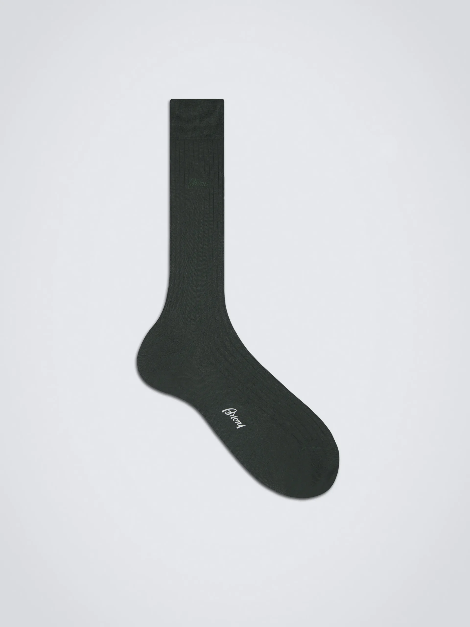 Dark green ribbed cotton socks. These finely knitted mid-calf length socks are incredibly comfortable to wear. Featuring a Brioni logo embroidered on the side and one on the bottom, they are a subtle way to add a unique touch to every outfit.