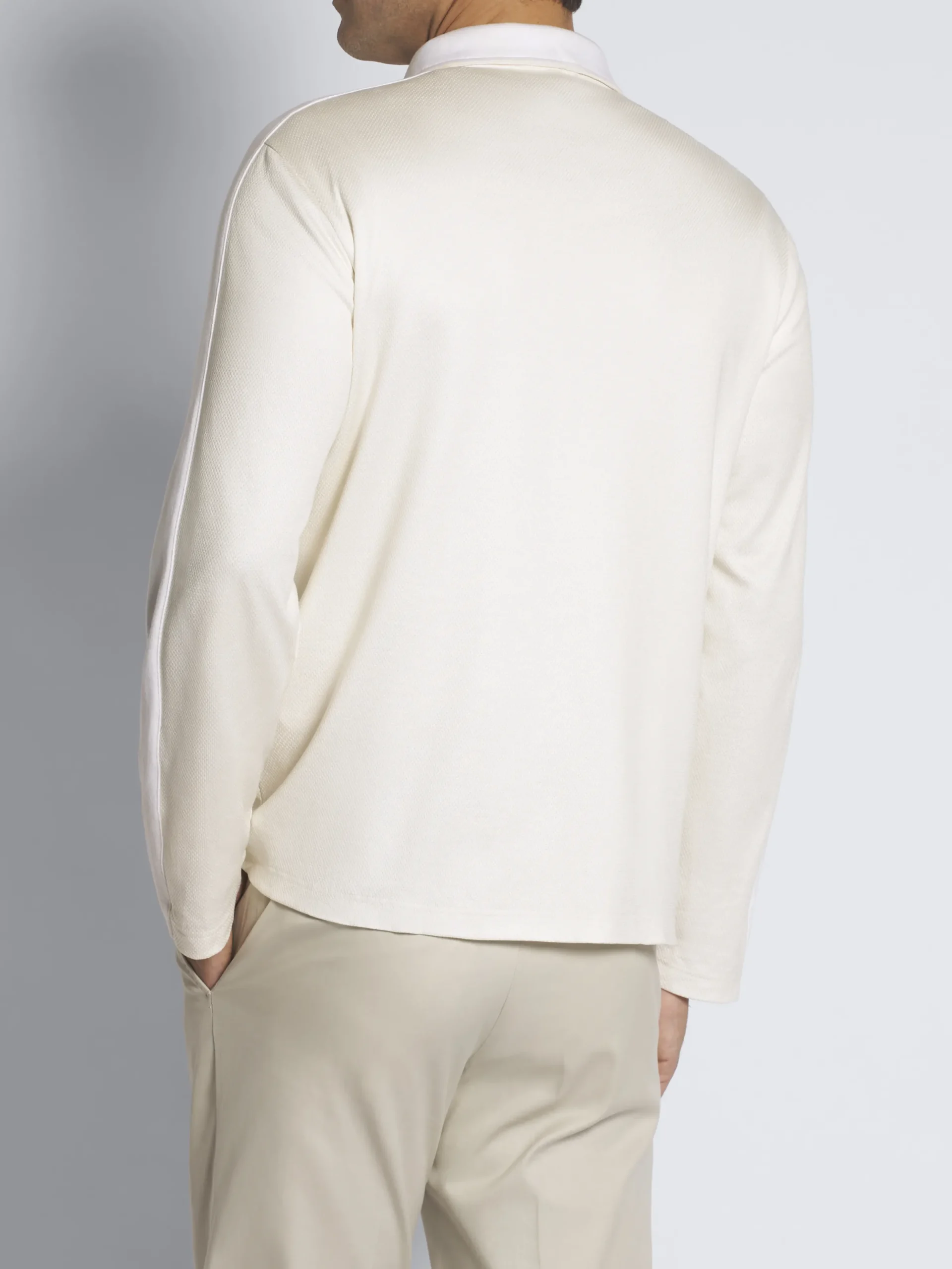 Ivory white silk and cotton jersey sweater, featuring Brioni Golf logo on chest, a mockneck with half-zip closure and two side pockets. This garment is part of our Golf Capsule.