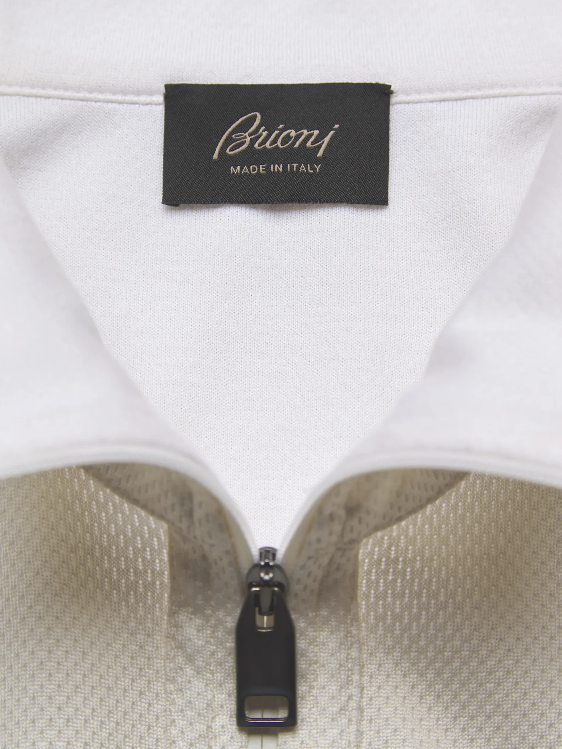 “,”features”:”Regular fit Brioni Golf logo on chest Metal zip puller