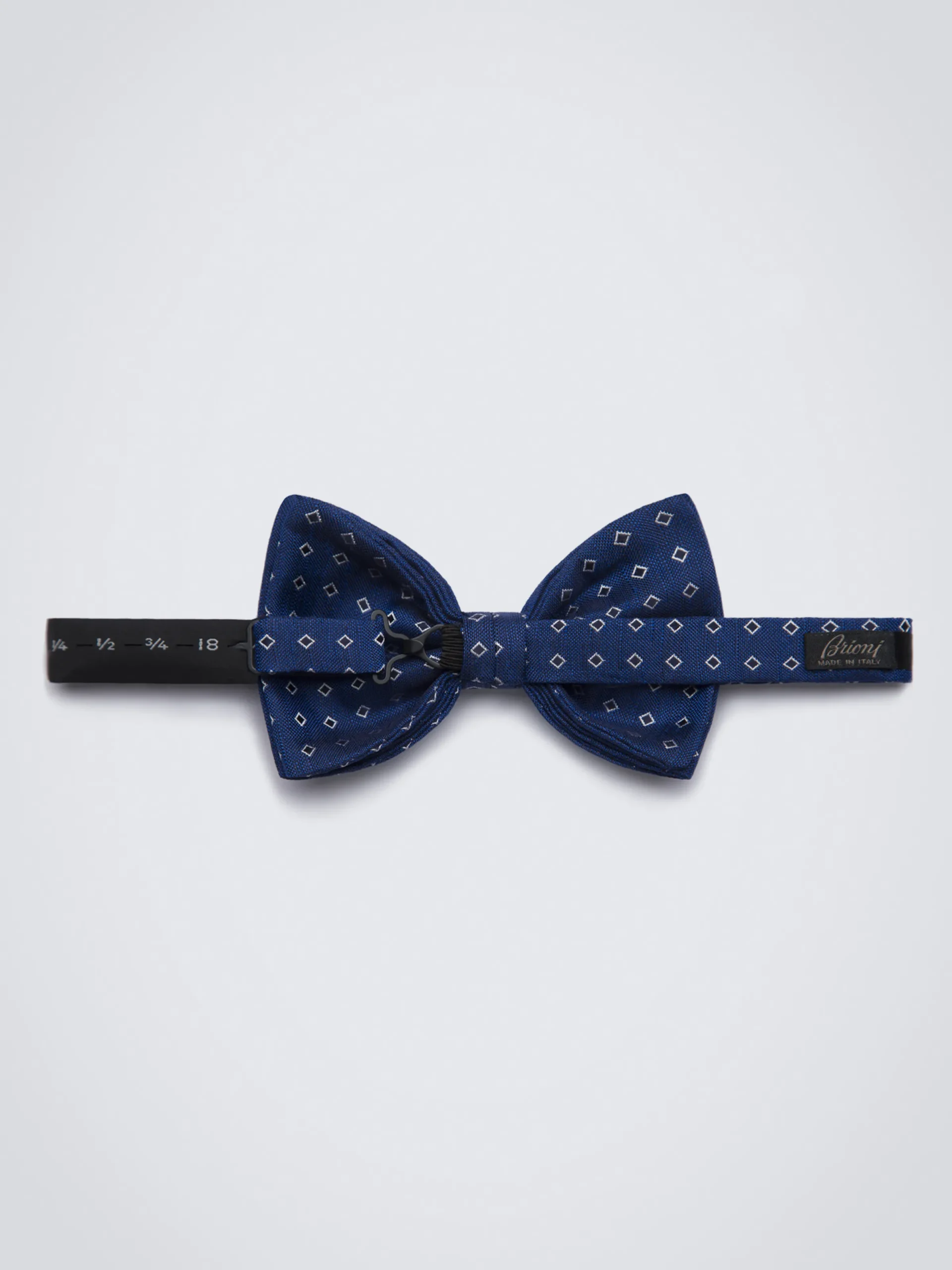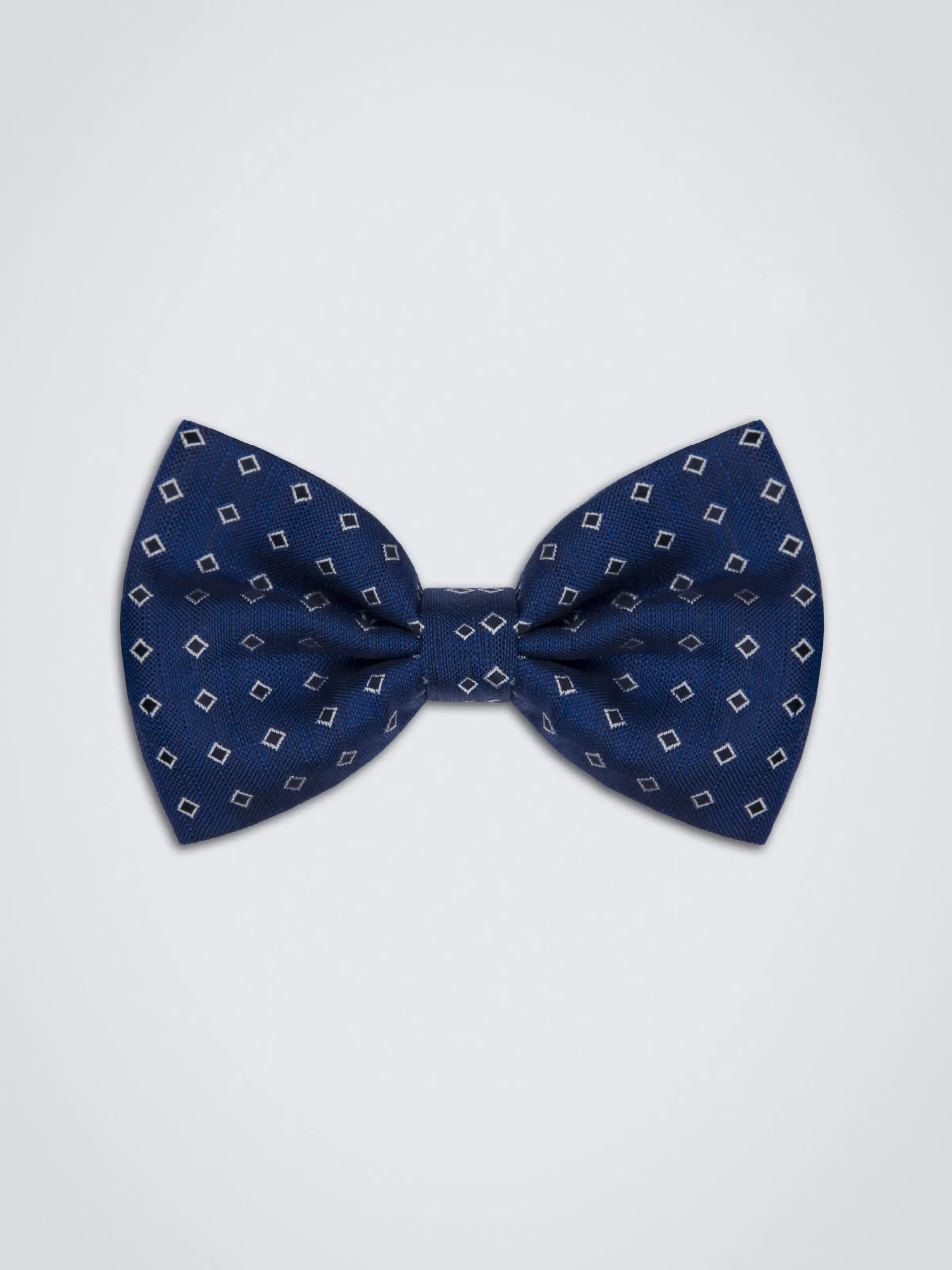 Silk jacquard and linen royal blue bow tie with a platinum coloured micro motif. The blend of the two fabrics gives this piece a textured finish and appearance, making it completely appropriate for semi-formal daywear.