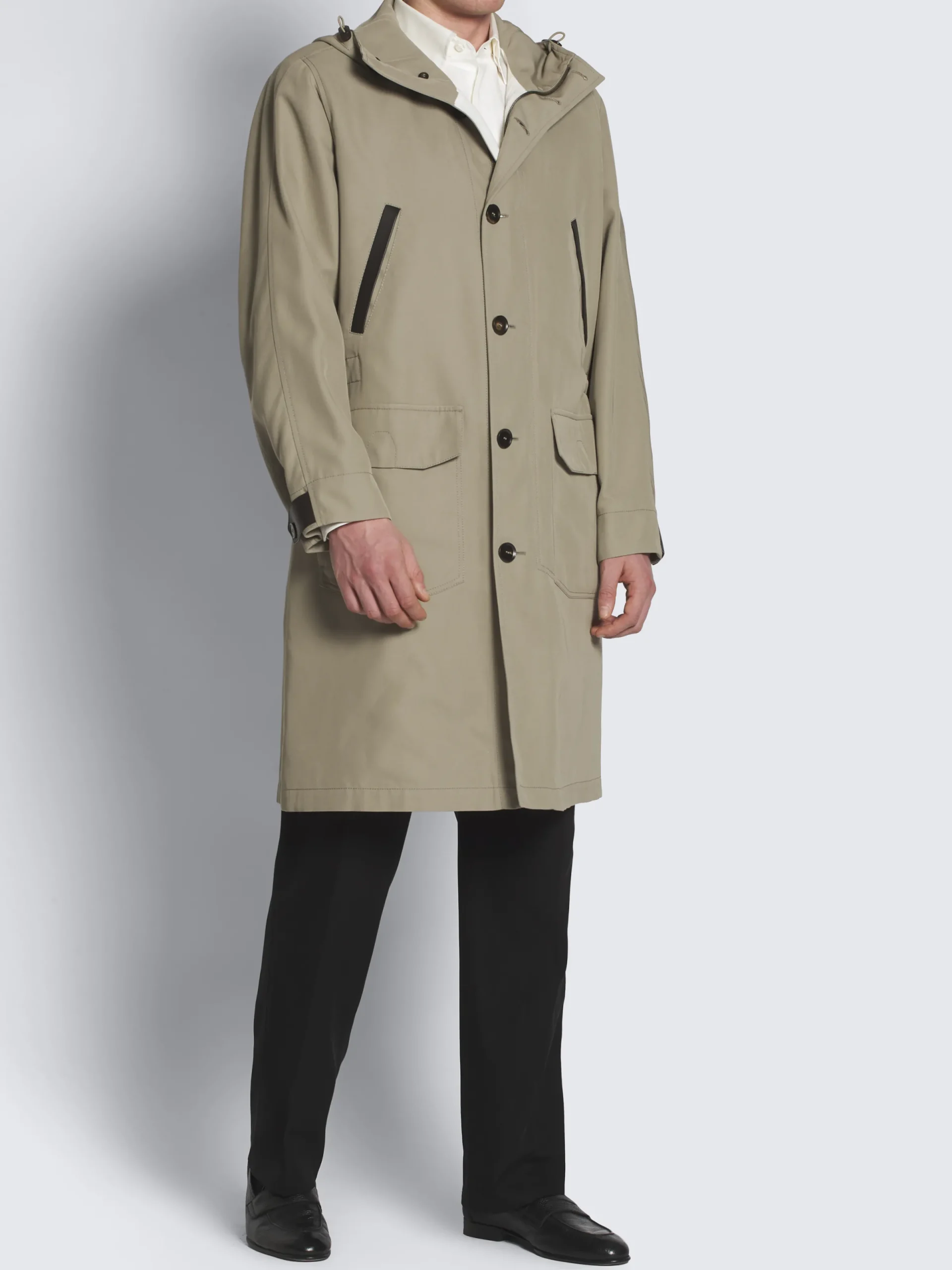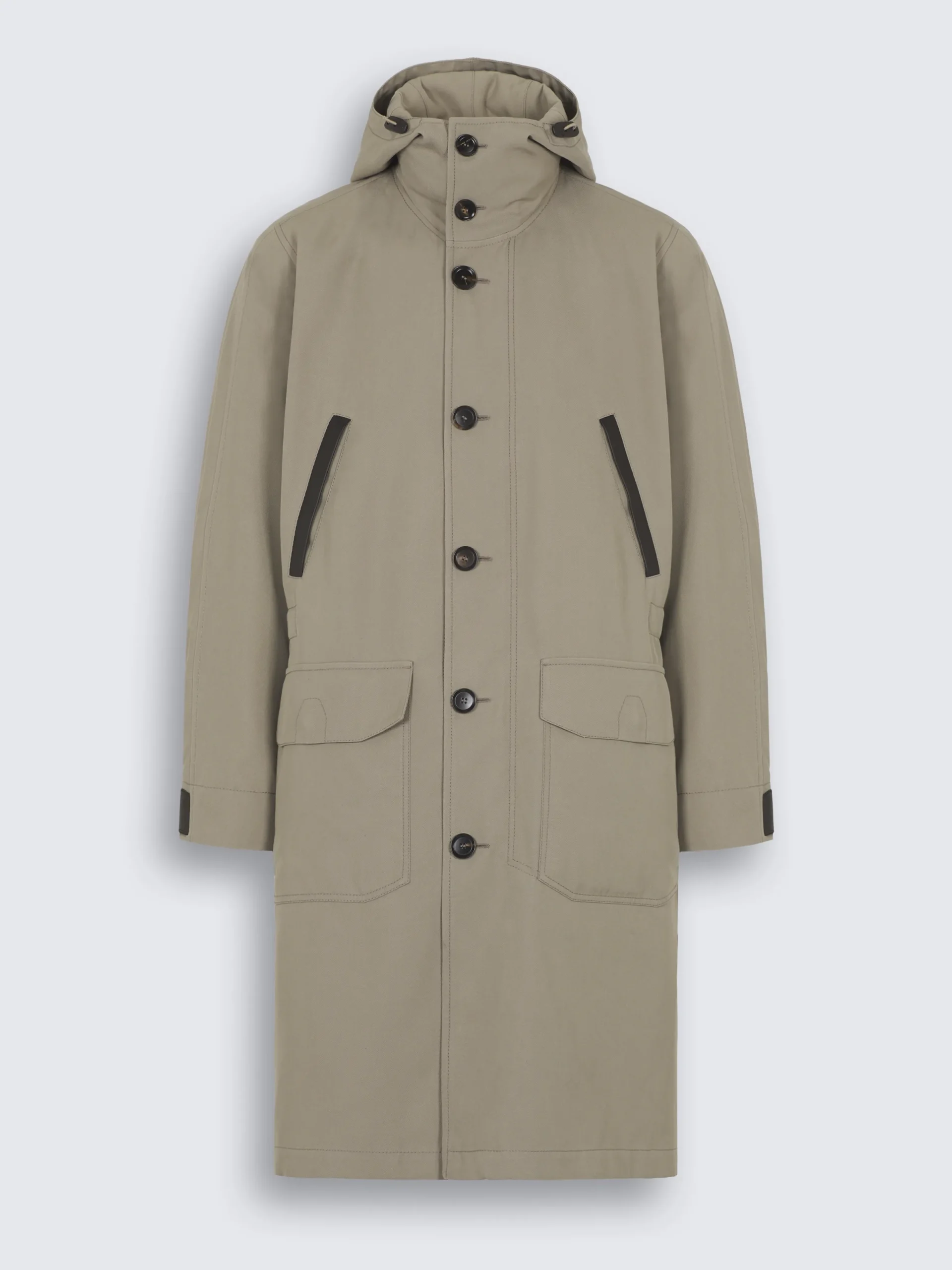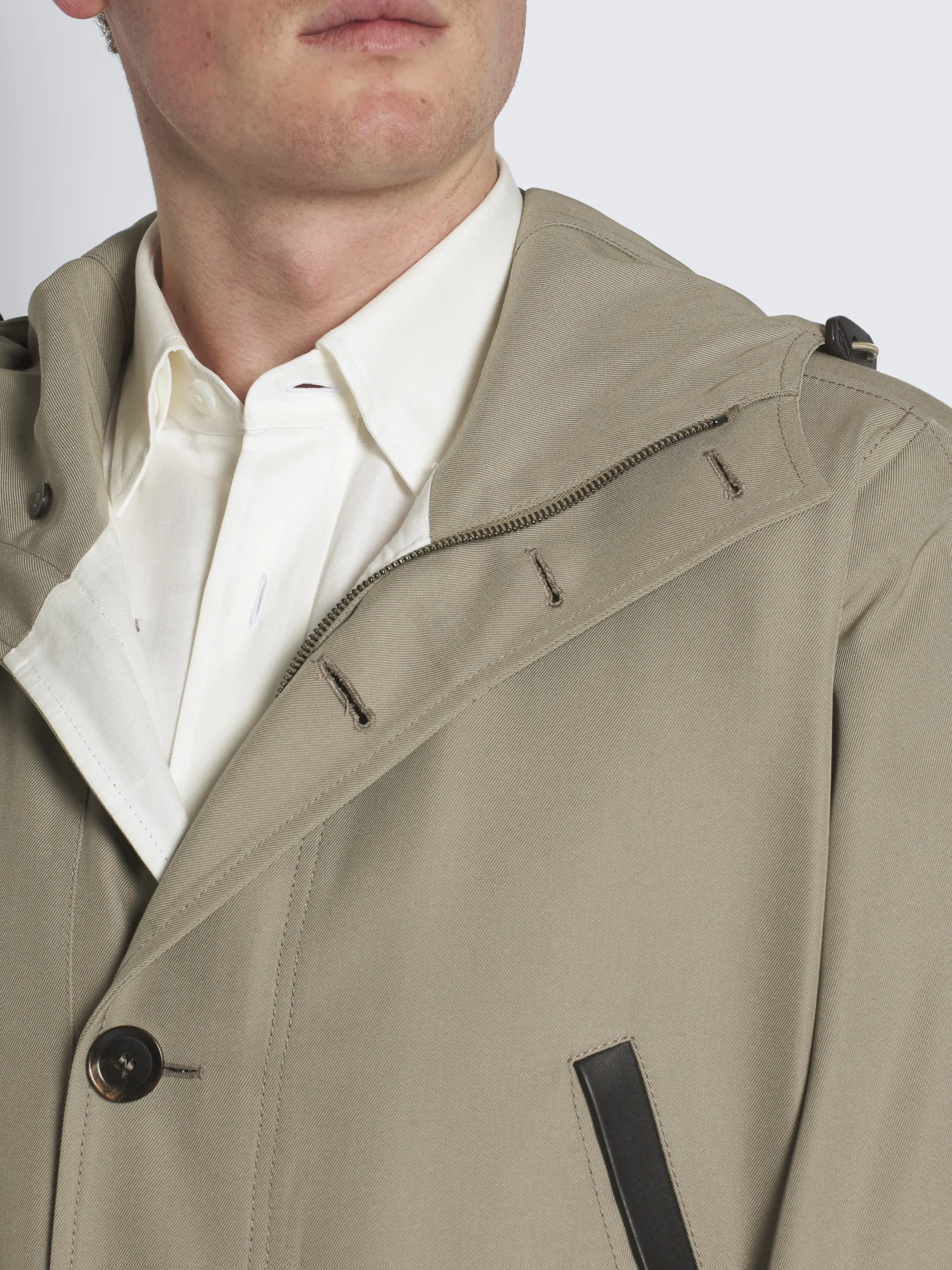 Beige silk gabardine hooded parka. Featuring a zip with metal puller and horn buttons front closure, buttons on the collar to fully close it, two chest pockets with leather trimmings, two front patch pockets with flaps and button closure, one internal zip pocket and without back vent. An adjustable drawstring with leather « B » logo bevelled ends on the hood, internal adjustable tab with horn buttons on the waist and adjustable leather tabs with button on the cuffs, will allow you to adapt the fitting of this detailed layer to your body. Comfortable and functional, it will easily complete your leisure looks.