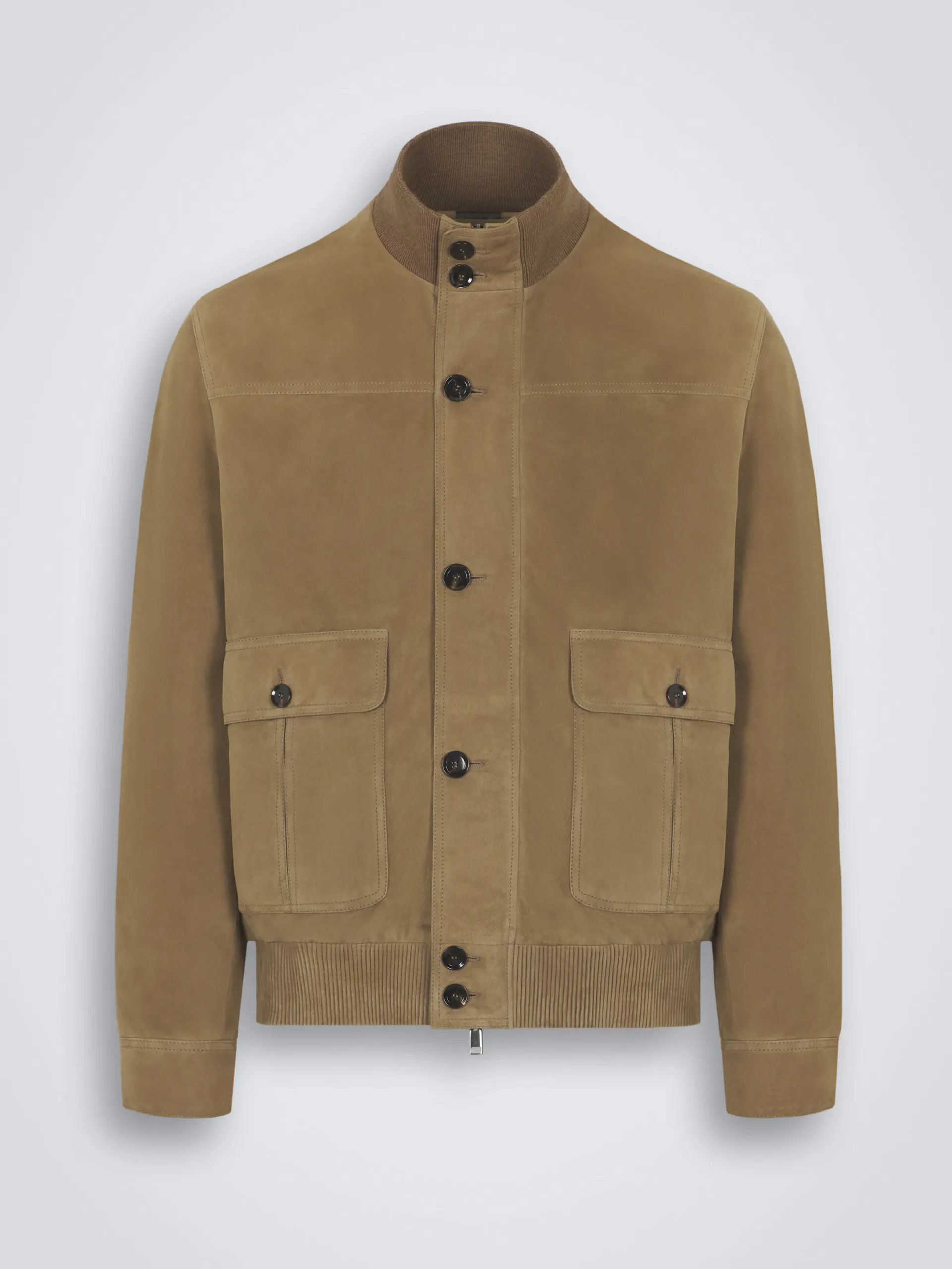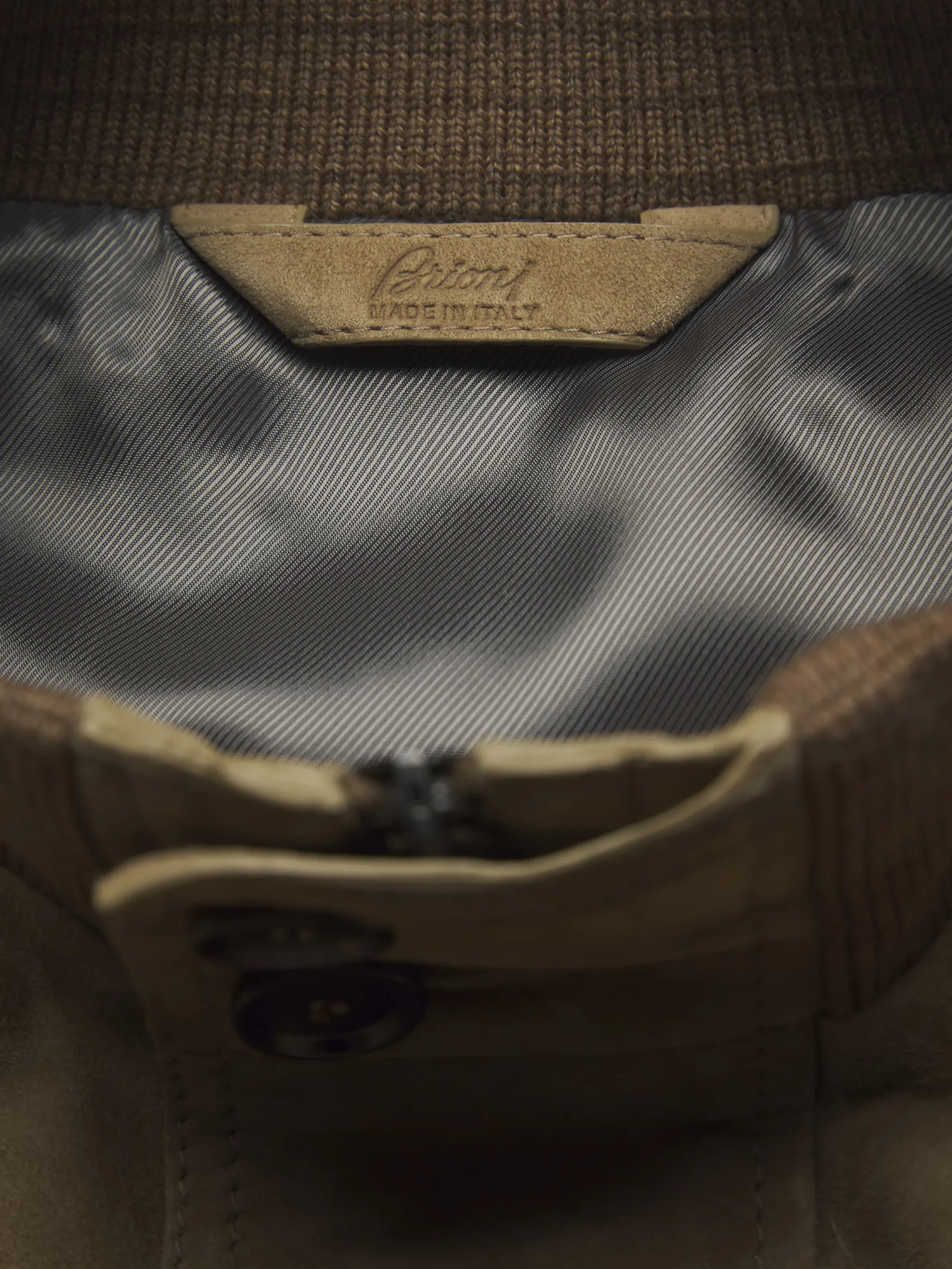 Brioni iconic 75 Blouson in supple lambskin suede. This impeccably crafted outerwear features a regular fit, a standing cotton rib collar in cotton and double entry pockets. Front closure with horn buttons, two internal vertical pockets along the lining and one internal zip pocket. It is the perfect mid-season style.