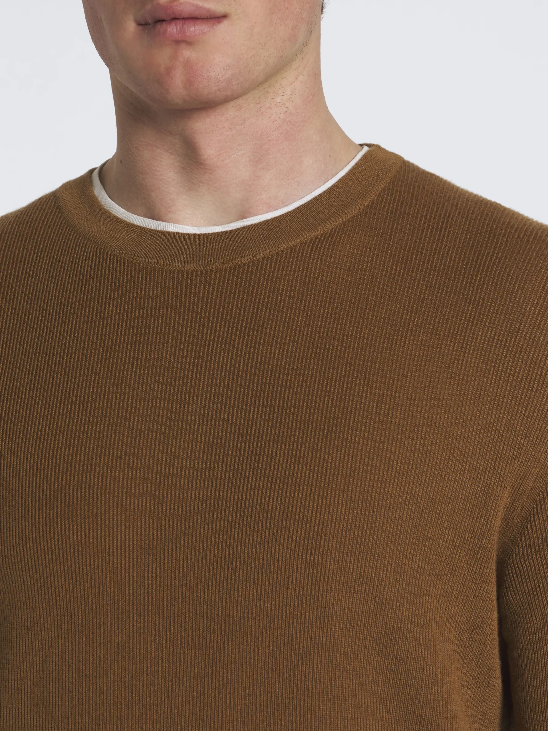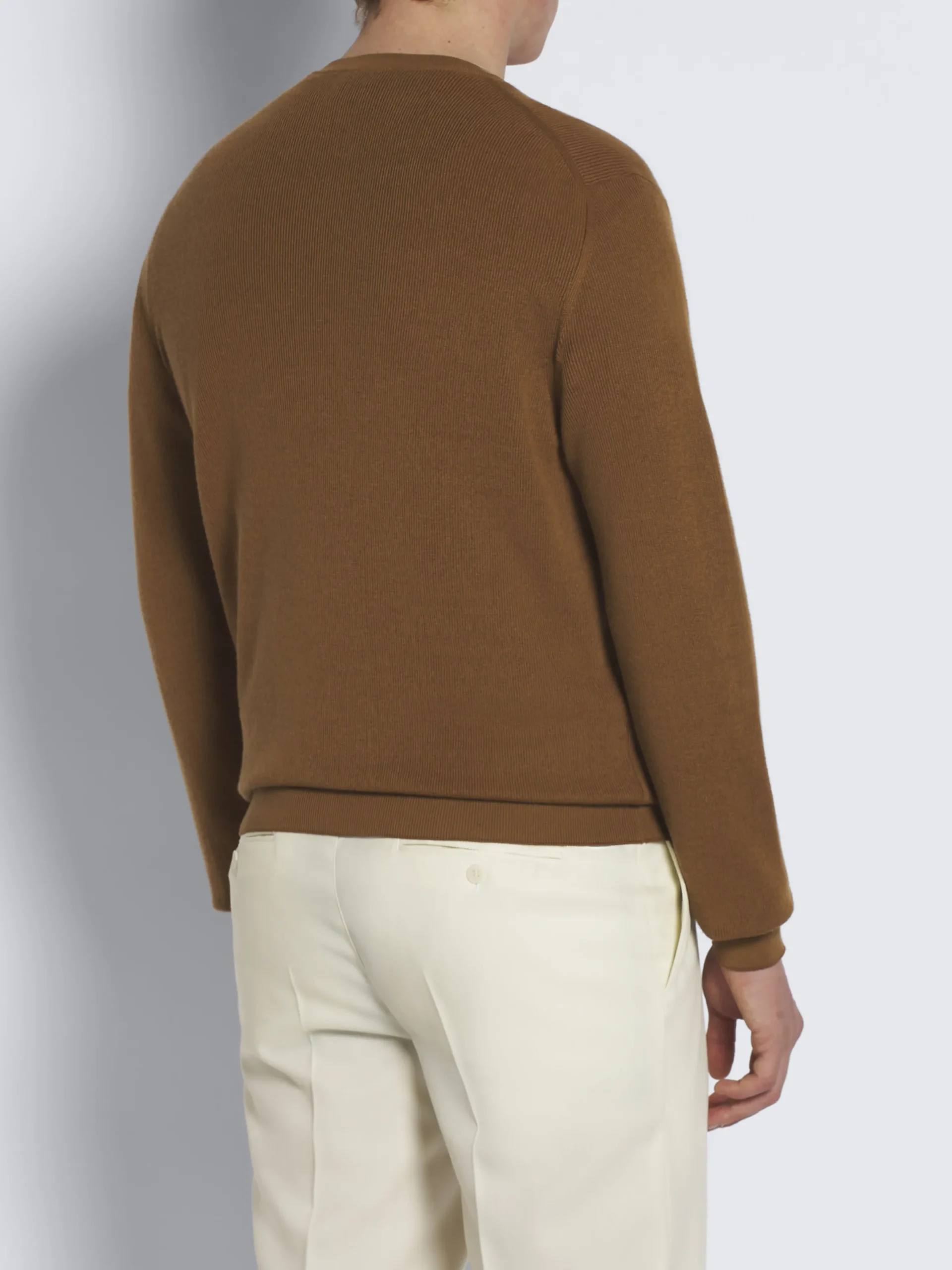 Light brown vicuña and cotton crewneck sweater, featuring a regular fit and light ribs effect on collar, hem, and cuffs. A timeless essential elevated by unique softness and comfort, optimal for refined leisure outfits.