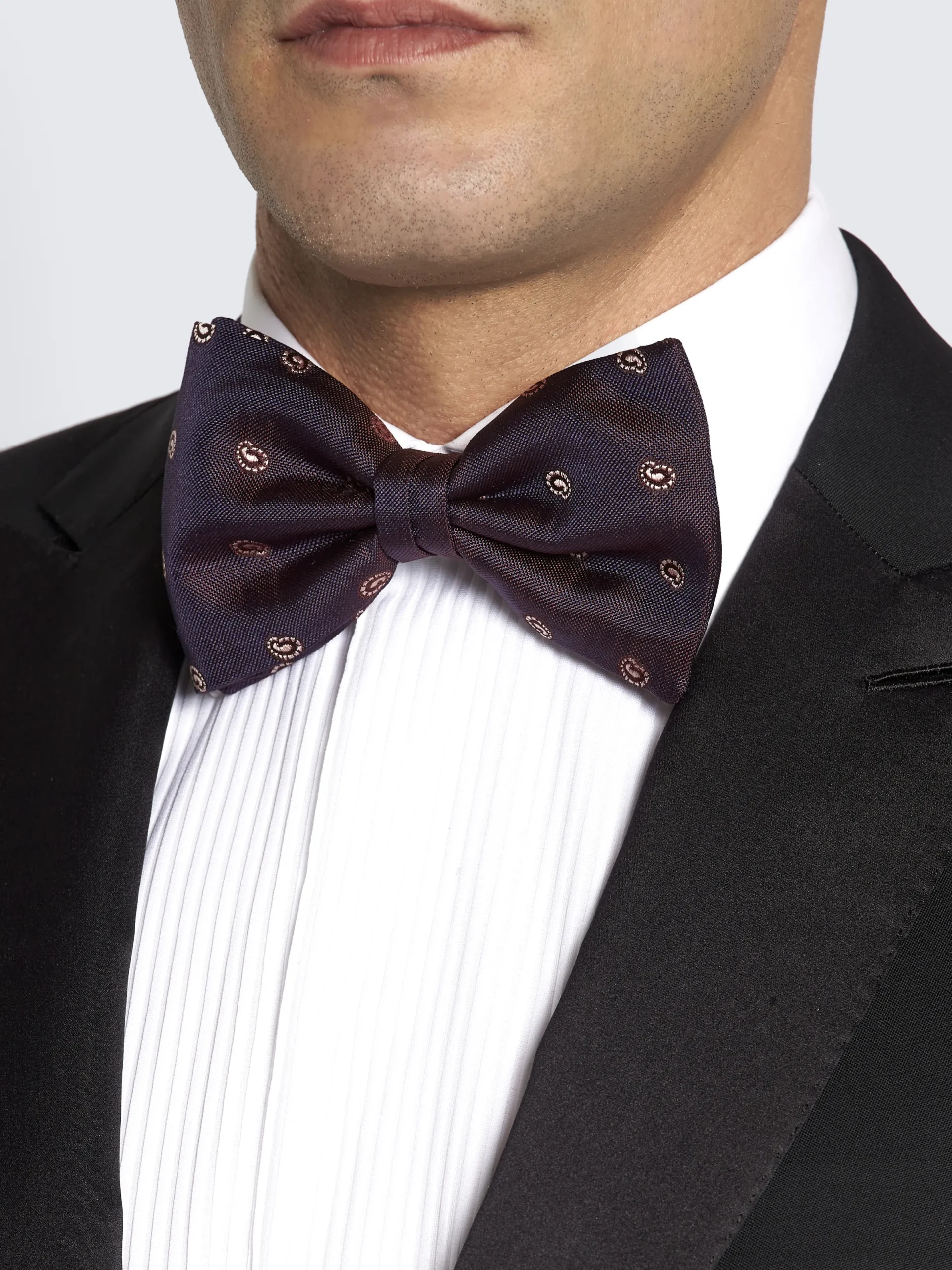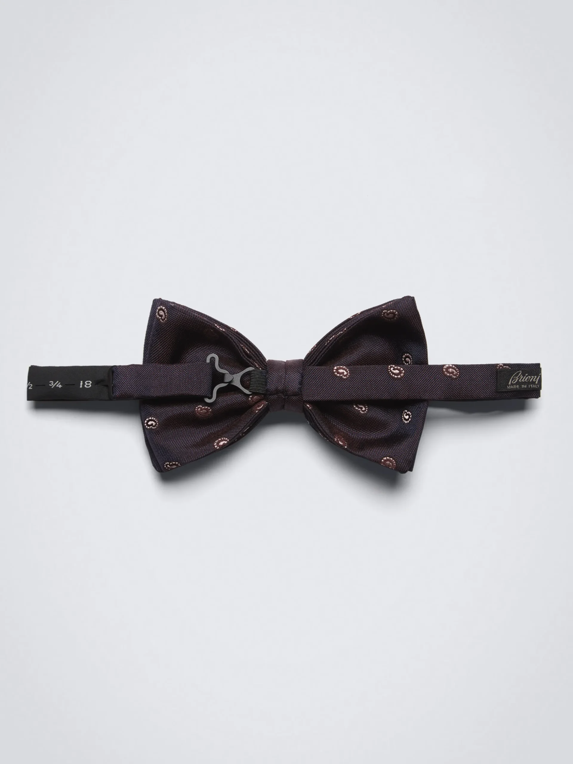 100% purple silk bow tie with pink paisley motif, handmade in Italy. A stylish and innovative design that will allow you to compliment this piece with different colours and styles of jacket.