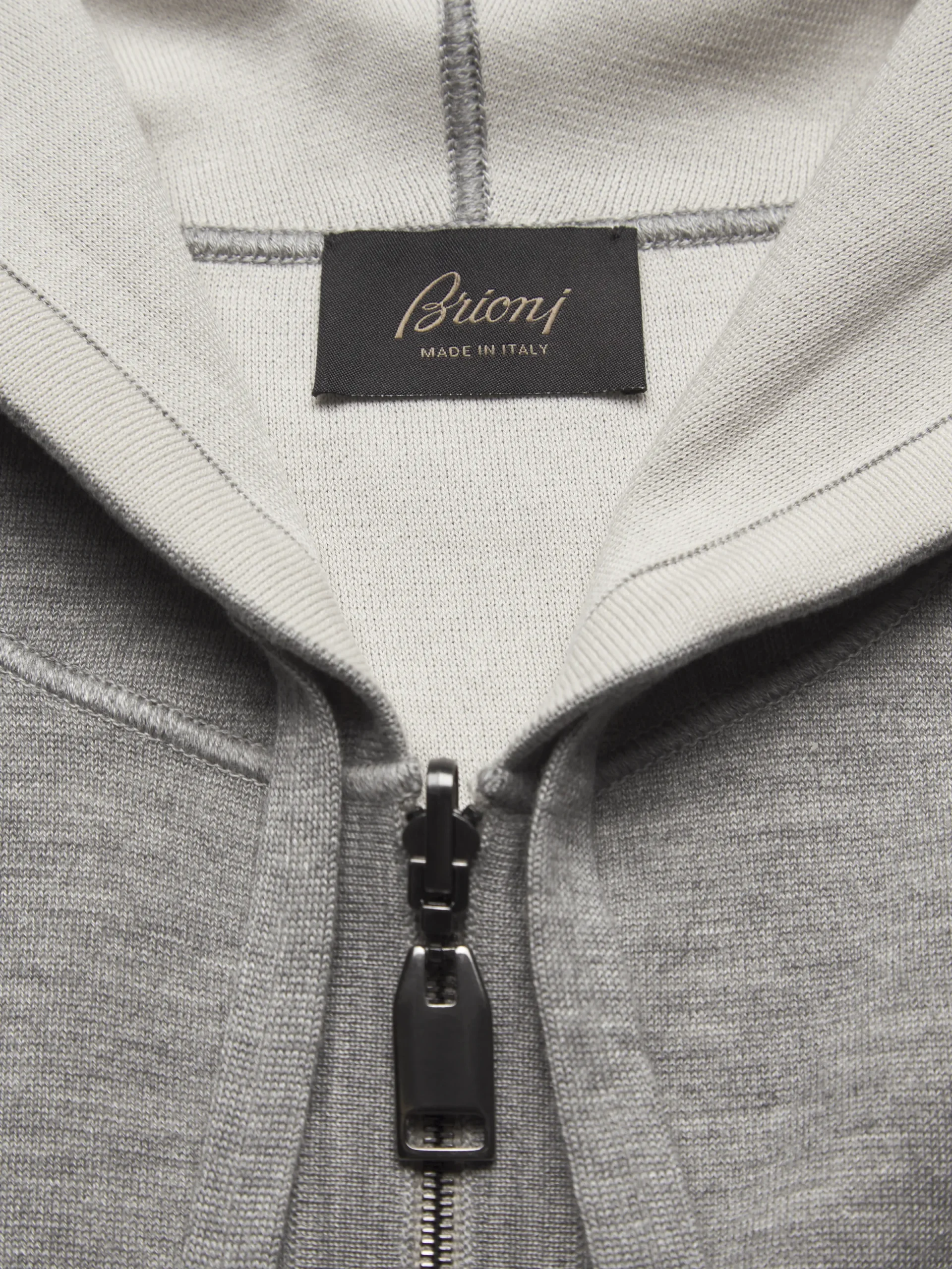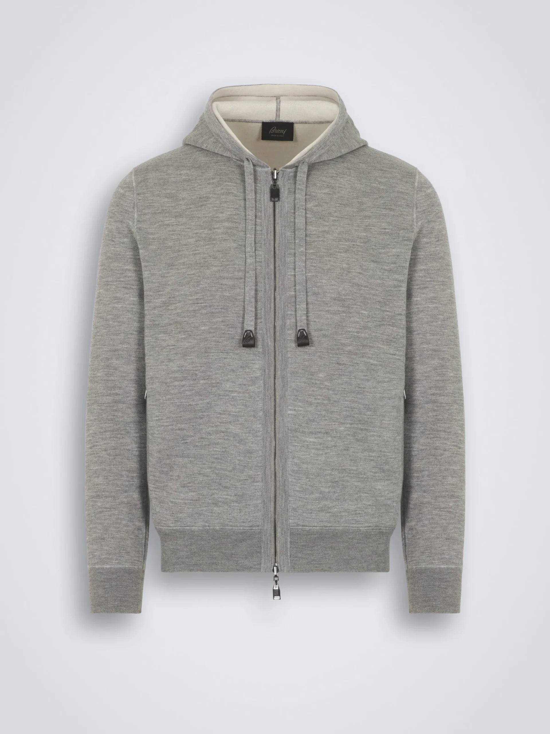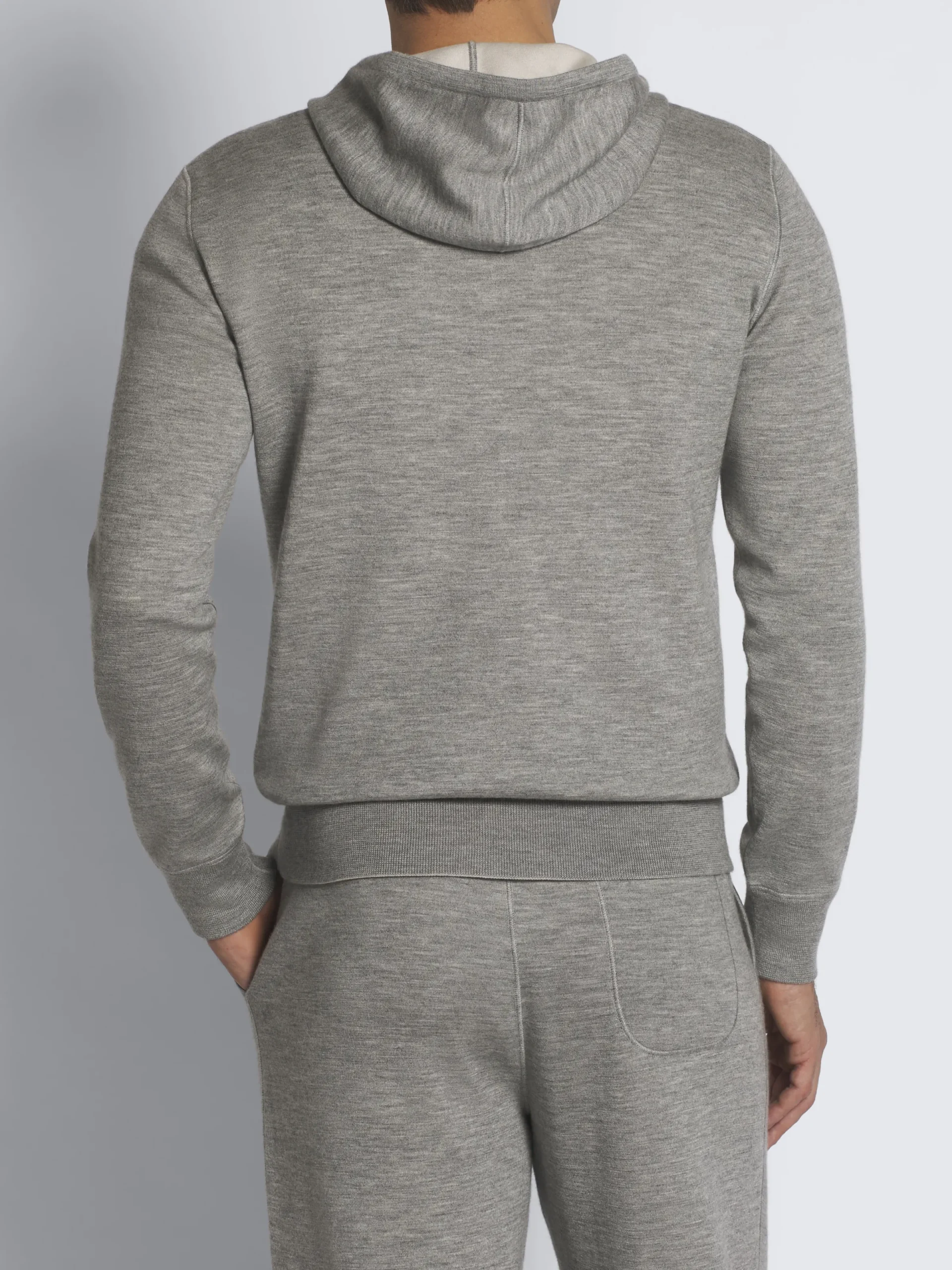 Grey and ivory white cashmere, silk and cotton reversible hooded blouson. Bi-material and bi-colour, this reversible hoodie is knitted in a soft blend of cashmere and silk on one side and pure cotton on the other. The perfect, versatile piece to add to your sportswear and leisurewear wardrobe.