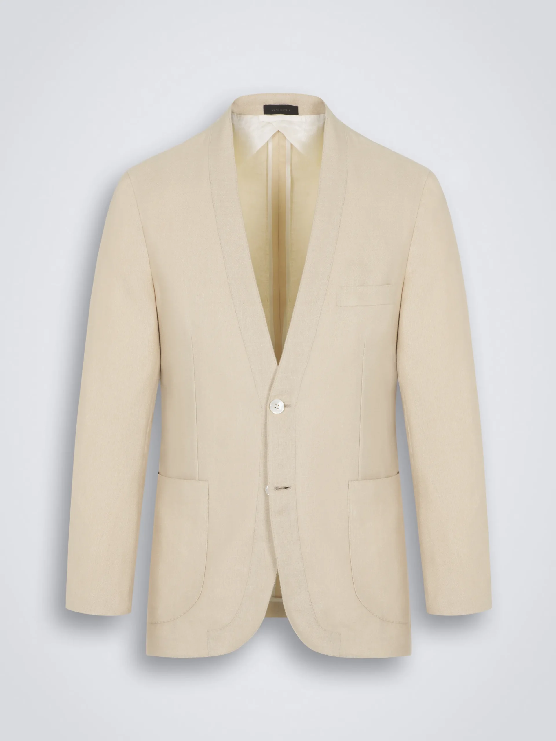 Beige linen, wool and silk Jardigan. A true Brioni original from 1955, the Jardigan was an innovative take on two wardrobe staples, the jacket and the cardigan, that were merged to create a new icon of effortless elegance. Collarless, deconstructed, unlined and lapel-free, this single-breasted version features front double horn buttons closure, a jet breast pocket, two patch pockets and two back vents. A perfect touch of sophistication for informal occasions, this garment offers great wearability and illustrates our commitment to relaxed dressing with style.