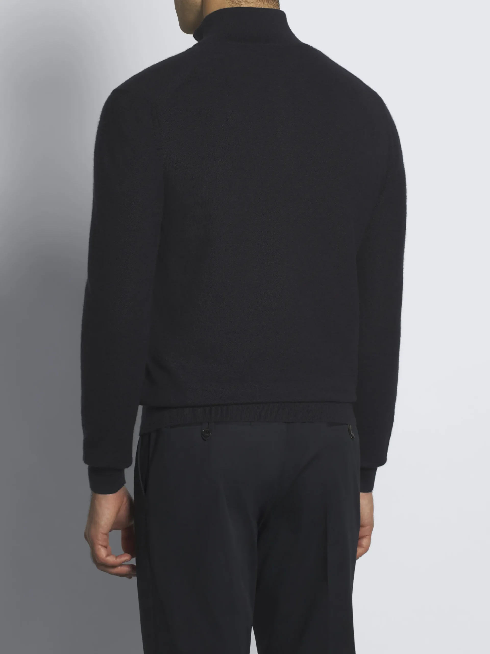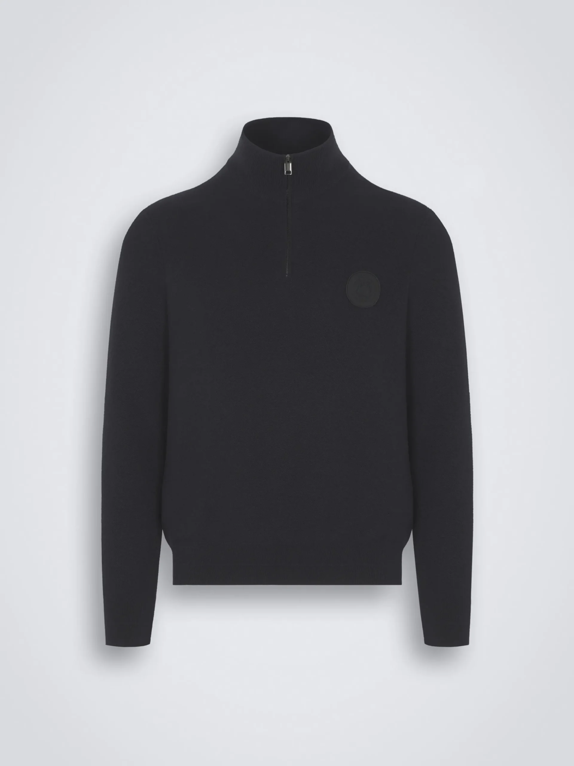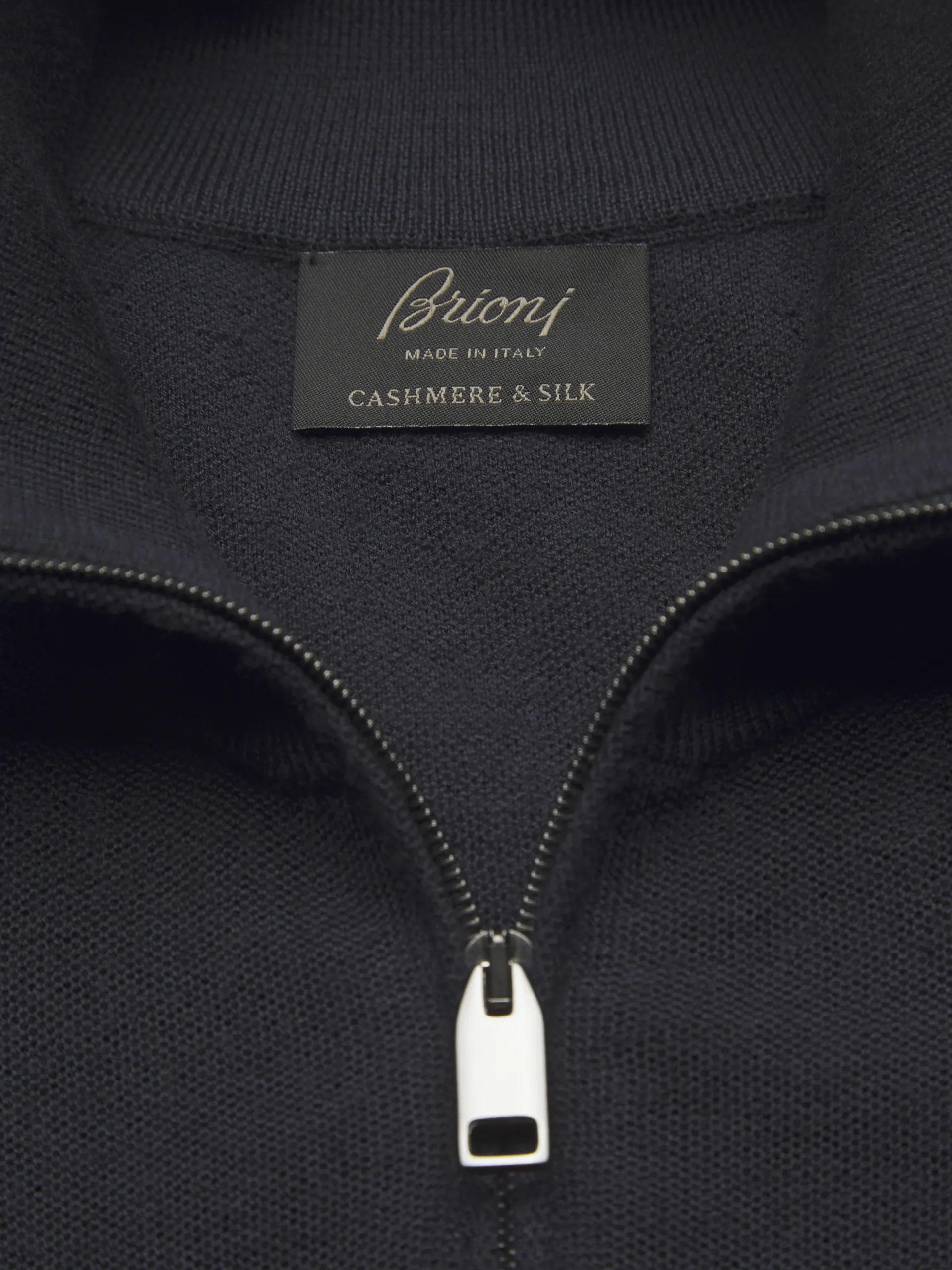 Navy blue cashmere and silk half-zip mockneck sweater. Featuring a regular fit, standing collar, Brioni logo embroidered on the chest, half-zip with metal puller and honeycomb jacquard texture. This garment, perfect on and off the field, is part of our Golf Capsule.