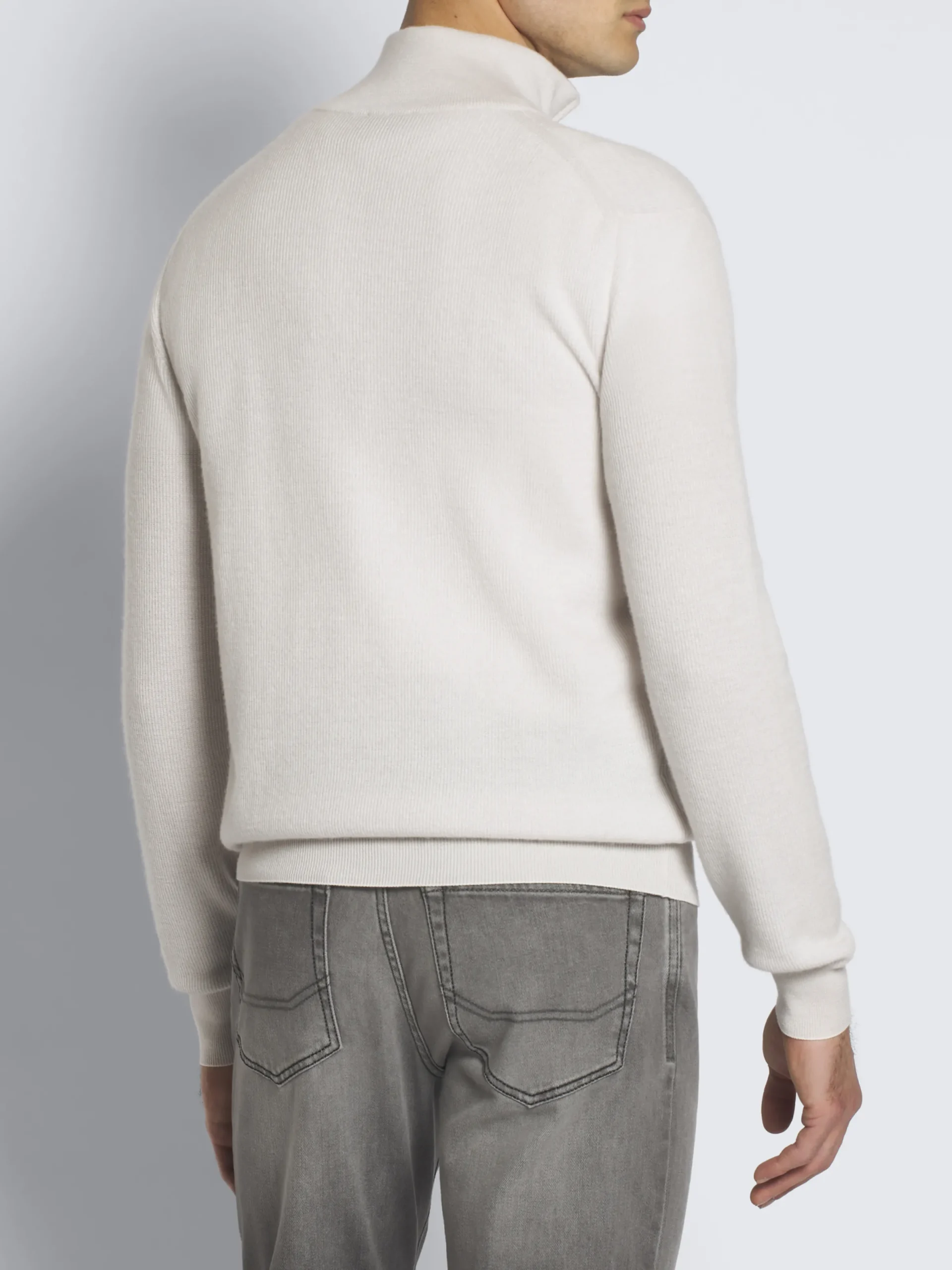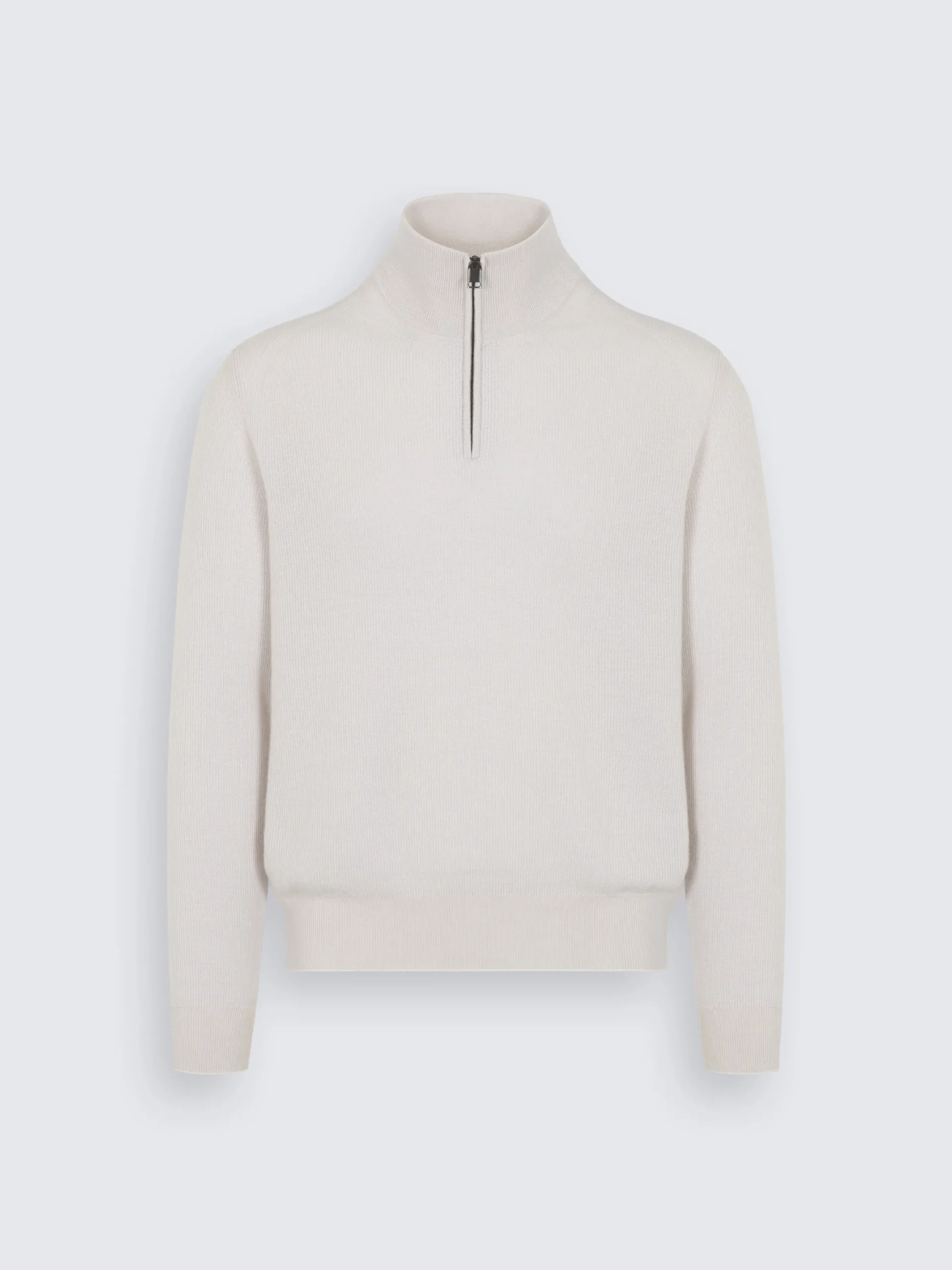 Ivory white cashmere and wool half-zip mockneck sweater. Featuring a regular fit, half-zip with metal puller, and light ribs effect on collar, hem and cuffs. nThis garment presents a vanisé weaving technique, in which vertical stripes in distinct tones are perfectly merged for a delicate visual depth. Effortless, it is an indispensable piece for a gentleman’s leisure wardrobe.