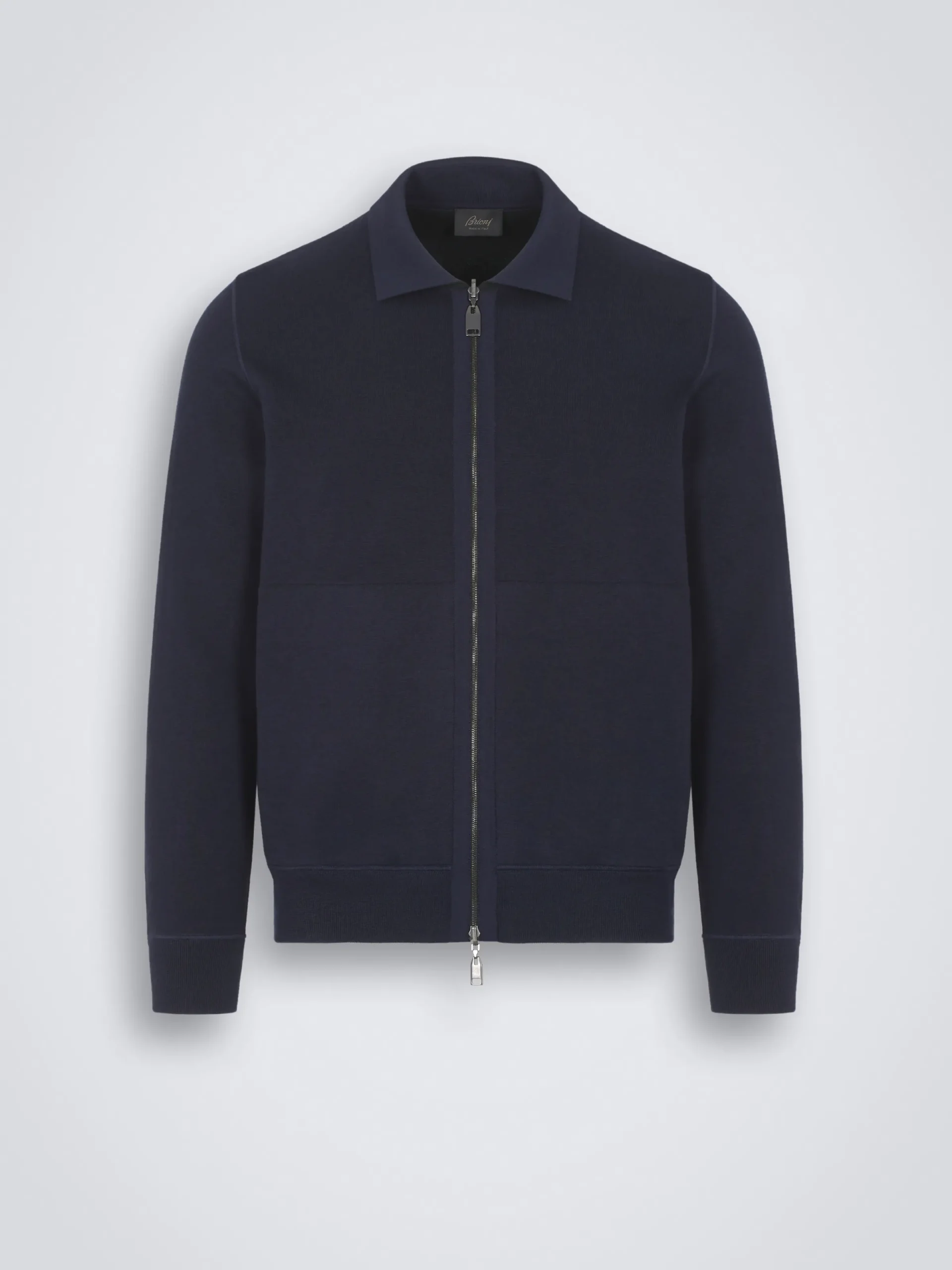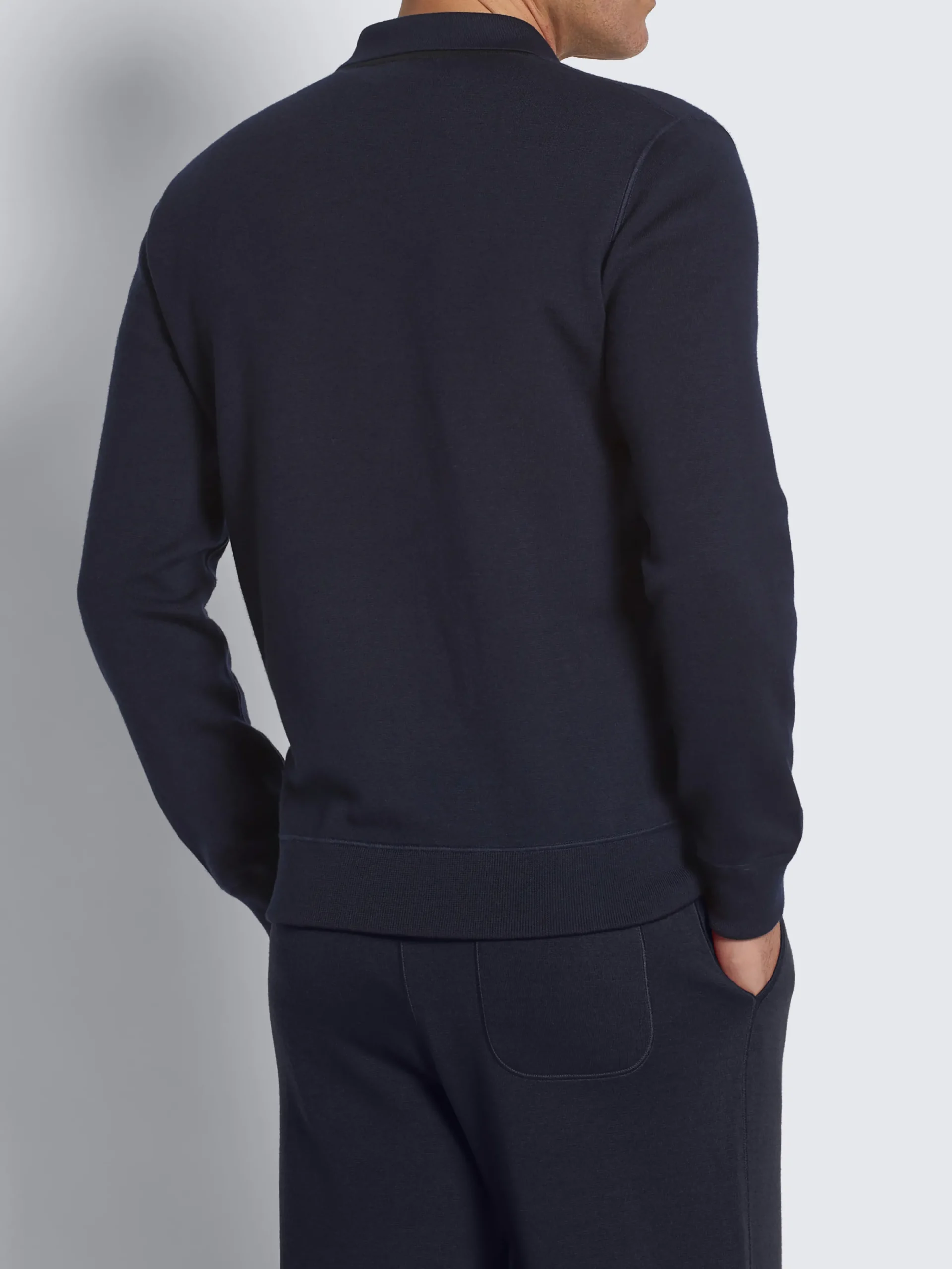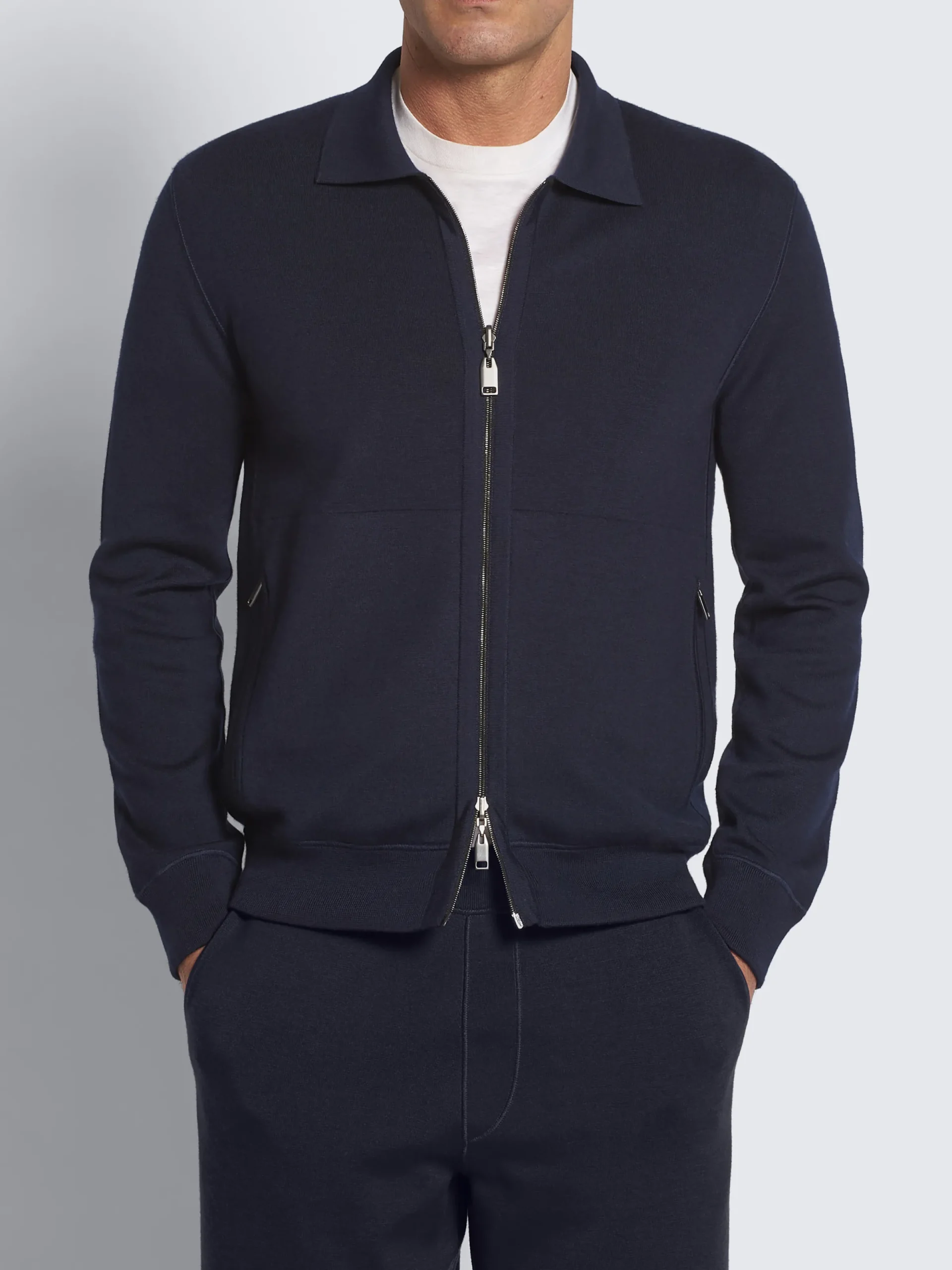 Jogging sweater inspired by our classic blouson construction. Crafted from a soft blend of cashmere and silk on the outer shell and cotton for the internal lining. It features a shirt collar, and two diagonal zipped pockets for added comfort. Perfect for leisure time and relaxing, but also before and after sport. Pair with the matching joggers in the same yarn. A truly refined tracksuit.