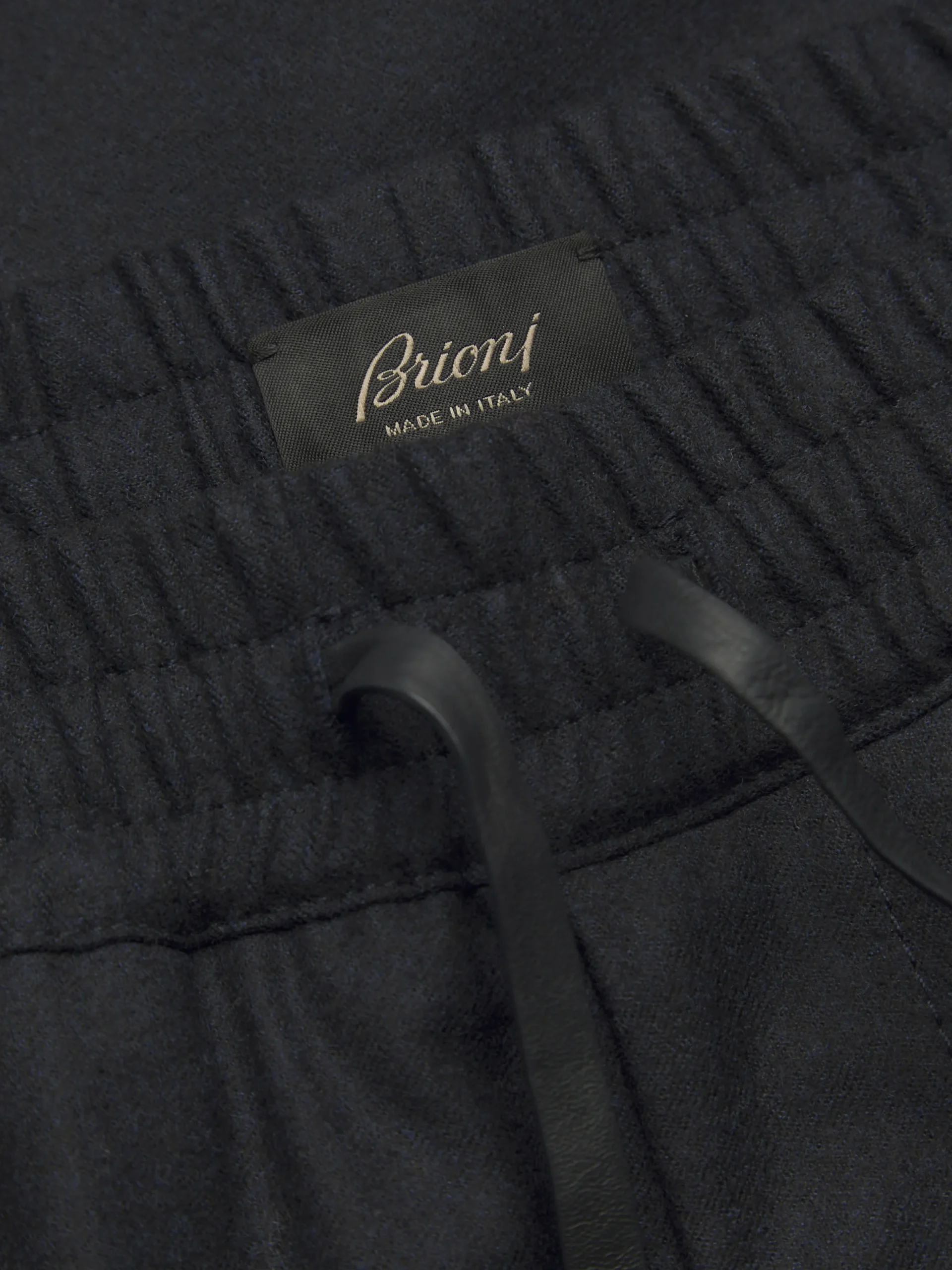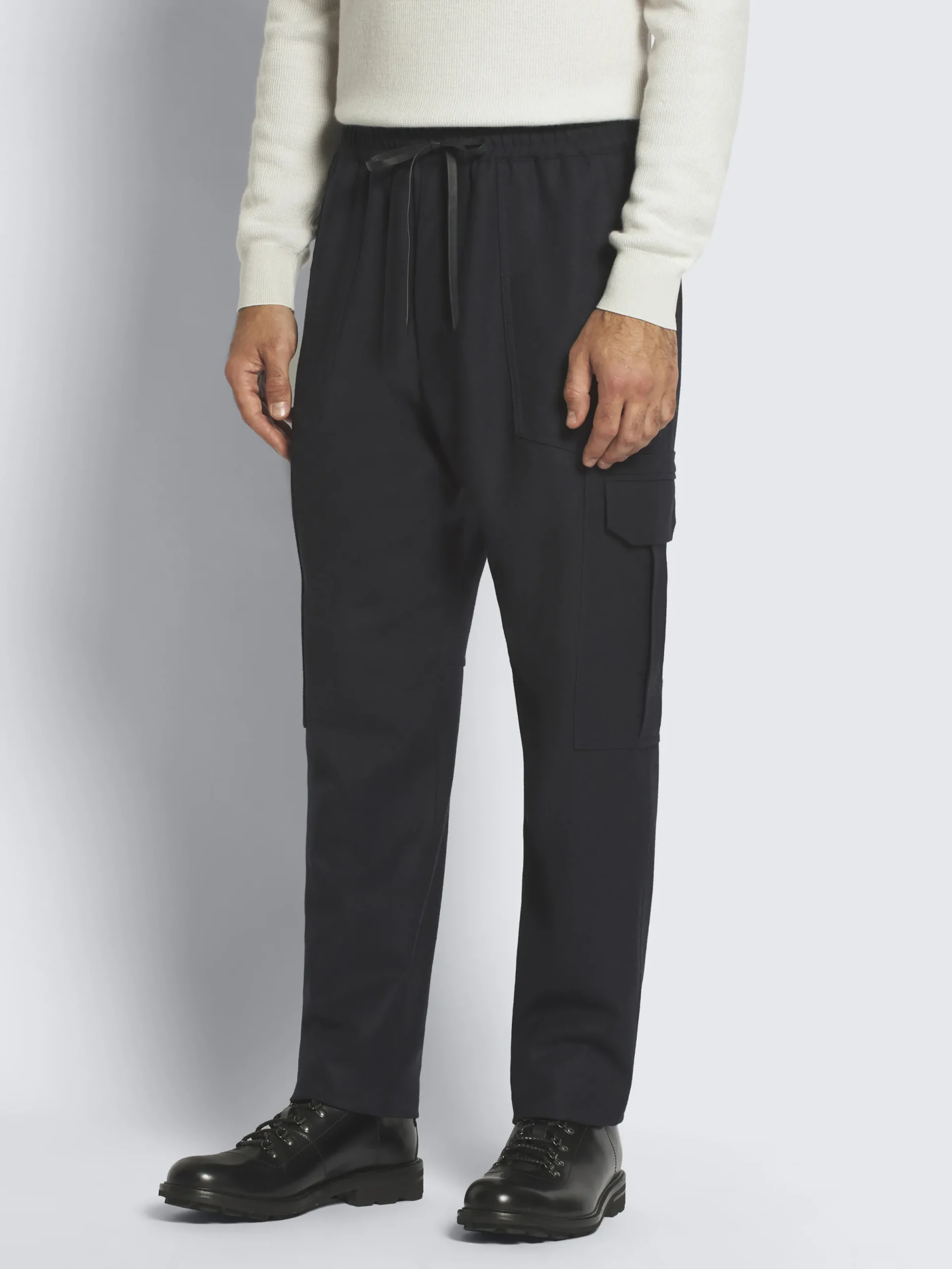 Midnight blue flannel wool twill Lucca trousers, featuring an elasticated waistband, branded leather drawstrings with handprinted edge and zip front closure. This cargo trousers are characterised by two side patch pockets, two flap pockets on the back and multiple pockets on the legs – two flap and one with zip closure. Perfect to wear on casual days, they will add a contemporary touch to your laid-back look. Team them up with a leisure shirt and a pair of sneakers.