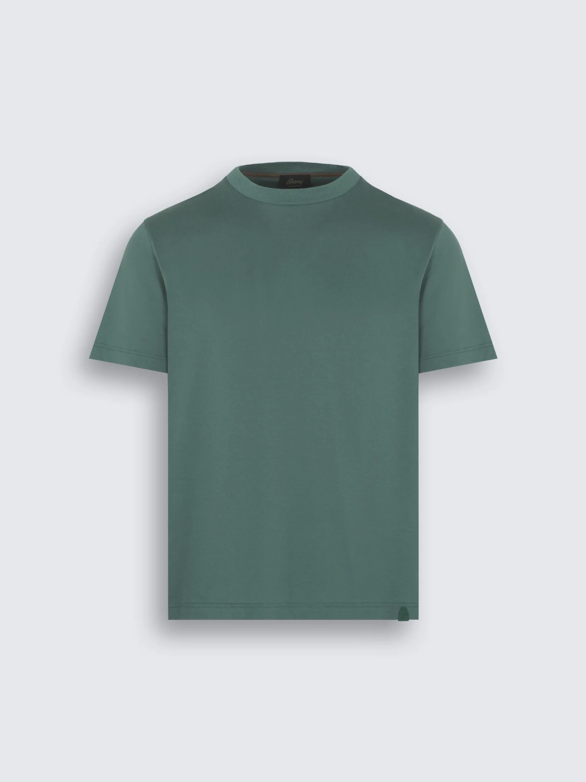 Teal green gassed organic cotton T-shirt. Featuring a regular fit, leather bevelled hem gussets with « B » logo and inside piping on the knitted collar. Timeless and effortles with a high quality finishing, it will refine any leisure look.nThis garment contains GOTS certified cotton. The Global Organic Textile Standard (GOTS) is a voluntary standard obtained by verification through independent third-parties. Practices include requirements on environmental management and wastewater; protection of health, safety and rights of employees; avoidance of hazardous substances.
