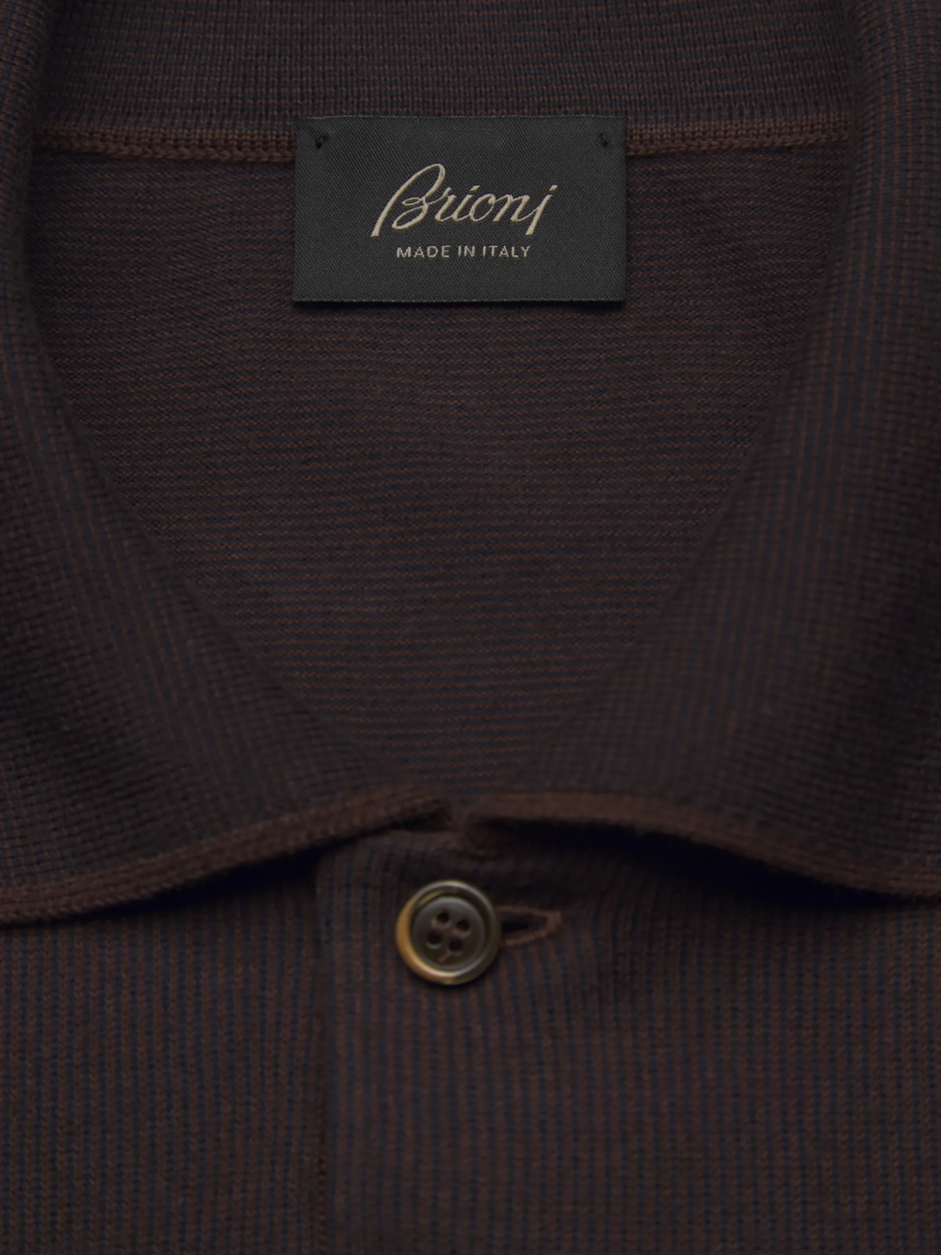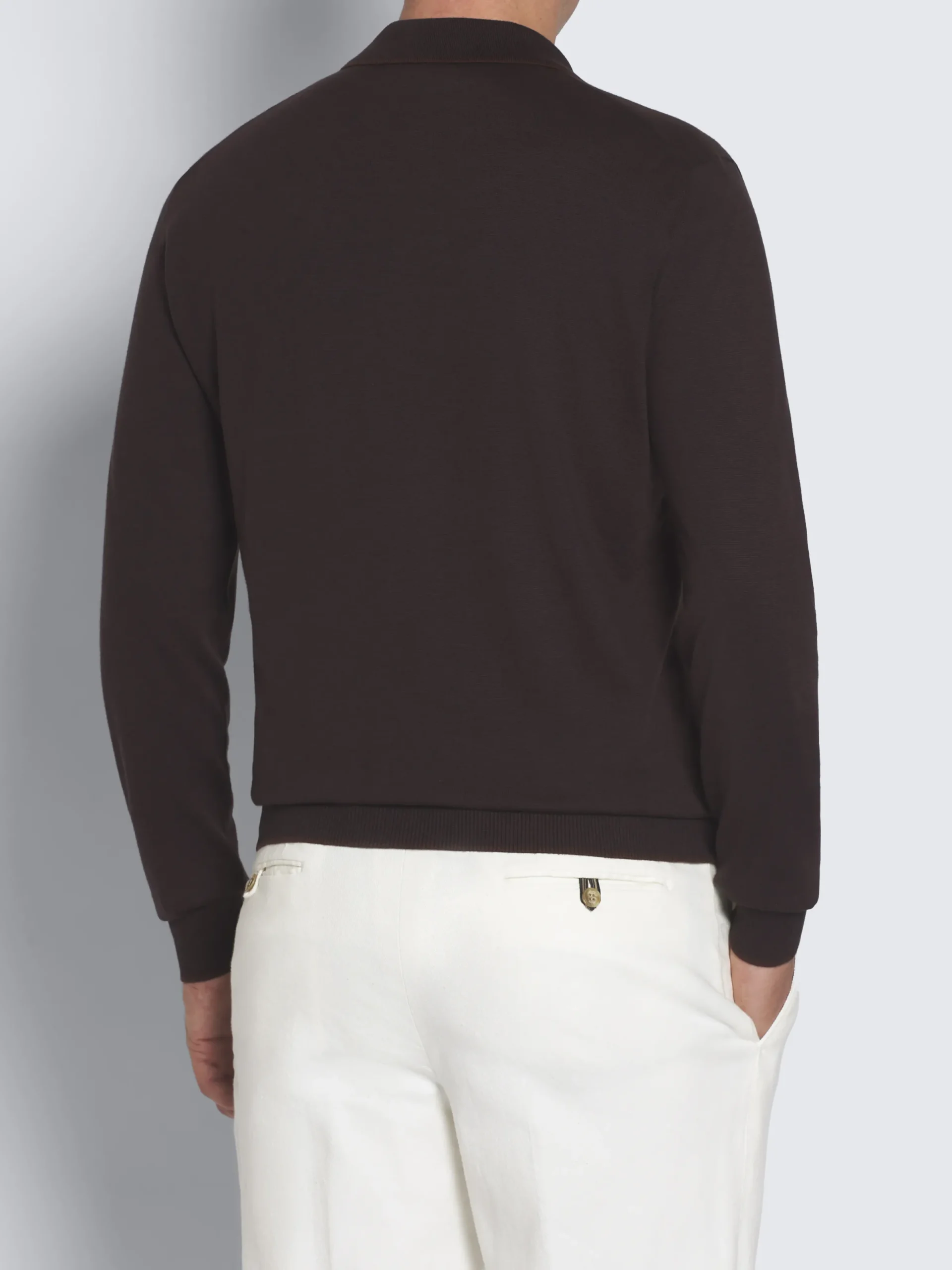 Dark brown Sea Island cotton and baby cashmere polo sweater. Featuring a regular fit, mother of pearl buttons, contrasting colour detail on the collar and light ribs effect on hem and cuffs. It presents the vanisé weaving technique, resulting in perfectly merged vertical stripes in distinct colours for a delicate visual depth. The perfect piece for a relaxed and contemporary look. Sea Island is one of the finest and most sought-after cottons in the world. Grown in limited quantities in the Caribbean, it is renowned for its long staple fibres which allow for a stronger, more resilient yarn, and result in an incredible hand feel, silky to the touch and smooth on the skin.