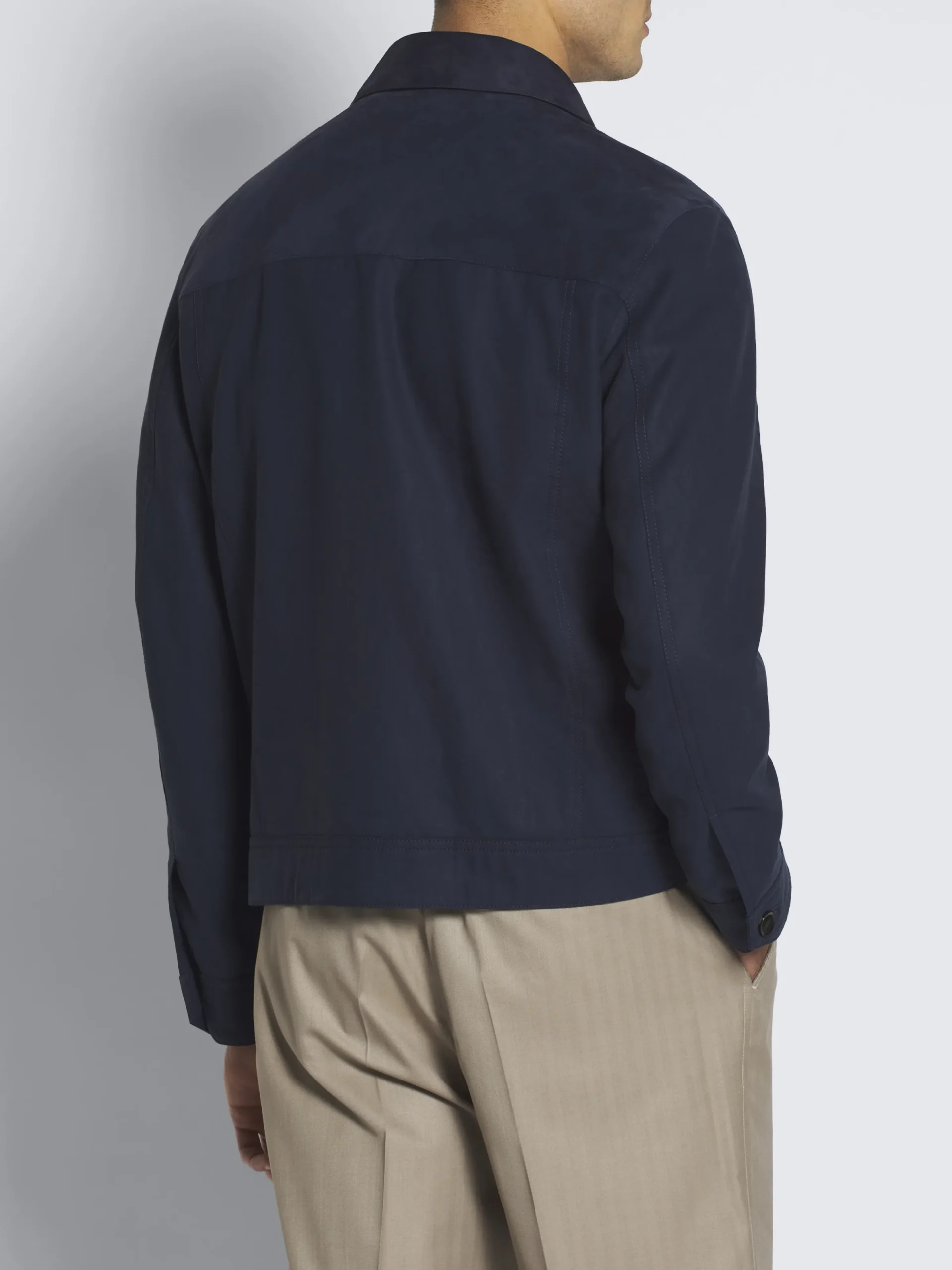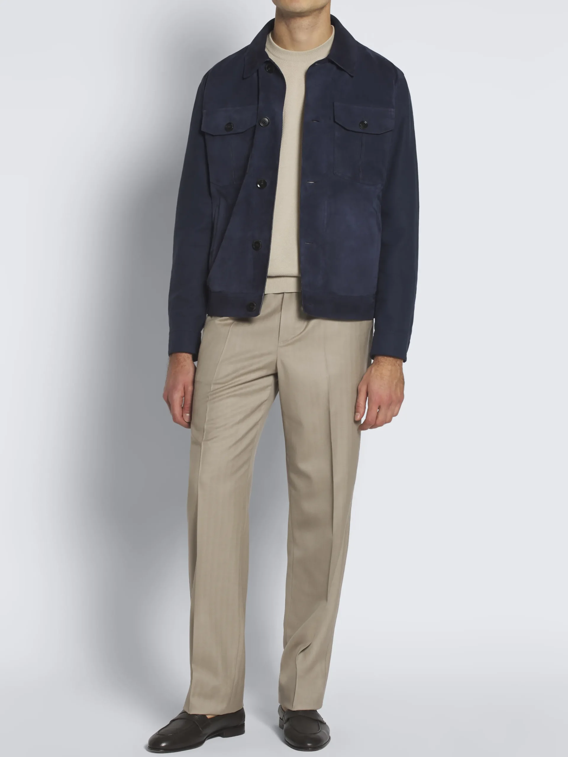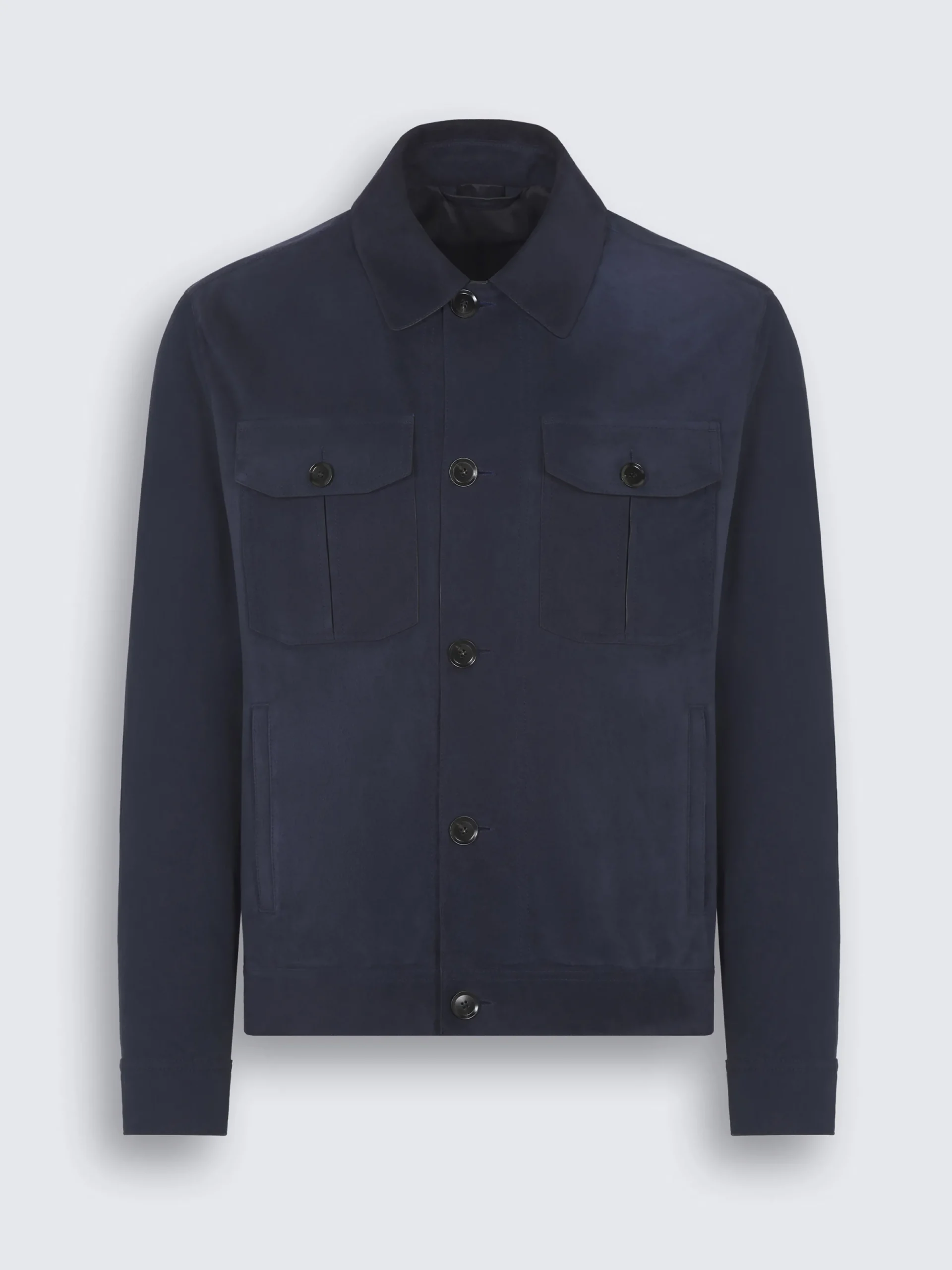 Navy blue shirt collar blouson, made of suede on the front side and linen on the back side and sleeves. Featuring a regular fit, debossed logo on the under collar, horn buttons front closure, half bevelled cuffs with buttons closure. Functional stocking space is given by two chest patch pockets with bevelled shape, flaps and button closure, two side vertical pockets, two internal pockets along the lining and one internal zip pocket. Meticulous attention is given to details that feature a debossed logo on the undercollar and backing buttons along the closure to secure the front ones and hide the seams. The final touch is added by trimmings applied and painted by hand on the raw-cut edges of the leather through a delicate artisanal technique, improving the finish of the garment, preserving its durability, and enhancing Brioni’s design and attention to detail. Fully lined, this piece will give a modern touch to your relaxed attires.