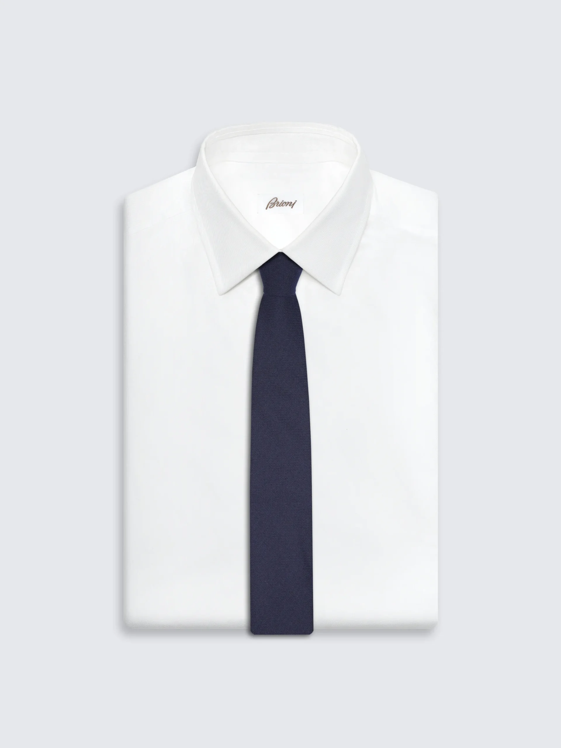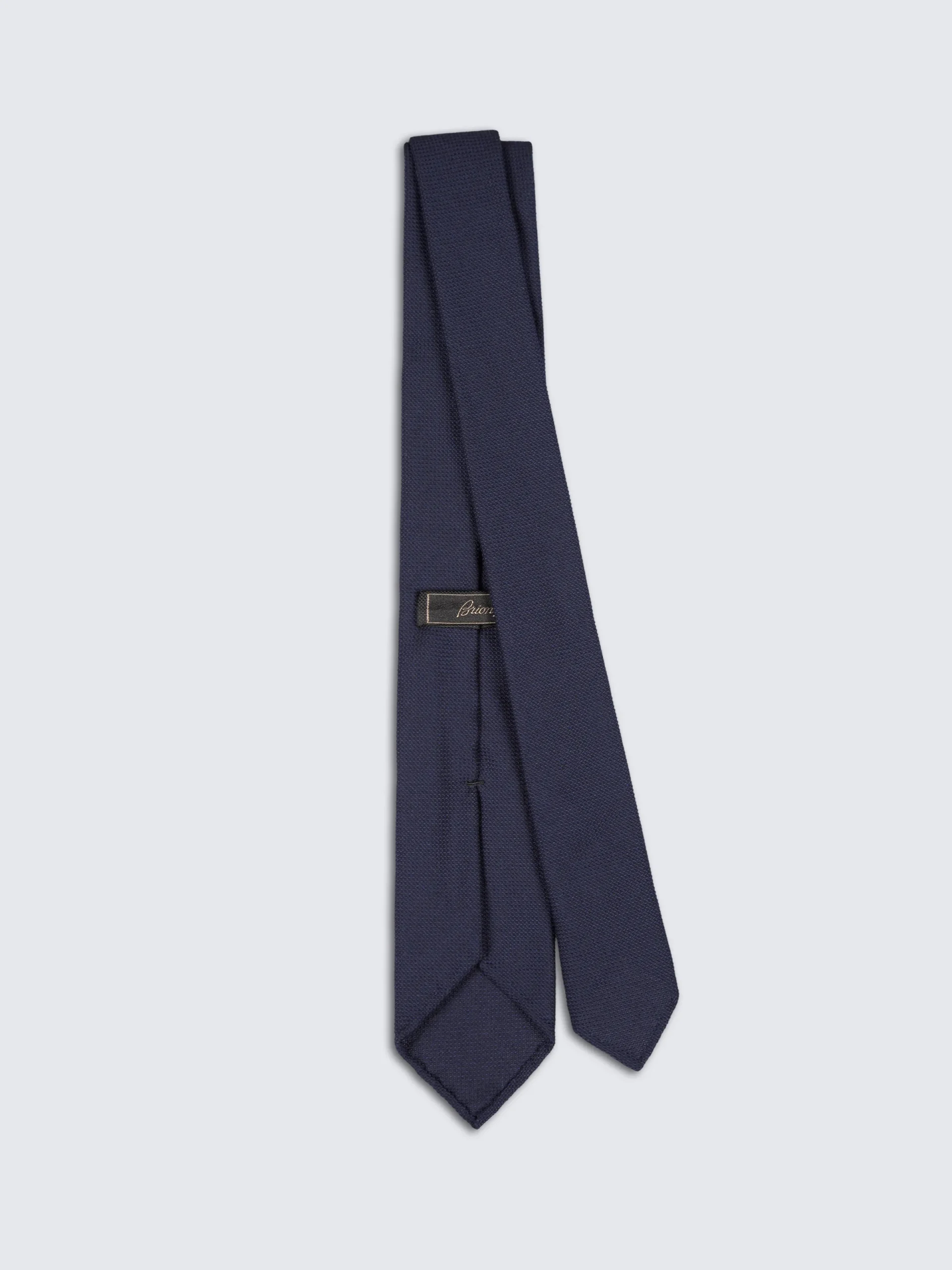 Midnight blue wool tie. Brioni ties are the epitome of elegance, handmade from the finest materials. Featuring an internal wool canvas that keeps it structured over time, single internal thread running along the entire length, and silk jacquard lining with Brioni logo. Perfect to be paired with a white shirt and a formal jacket for a chic and modern look.