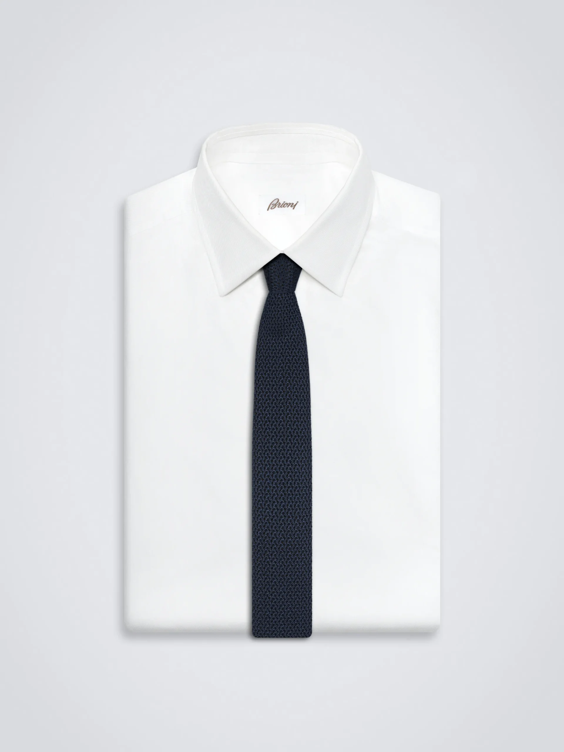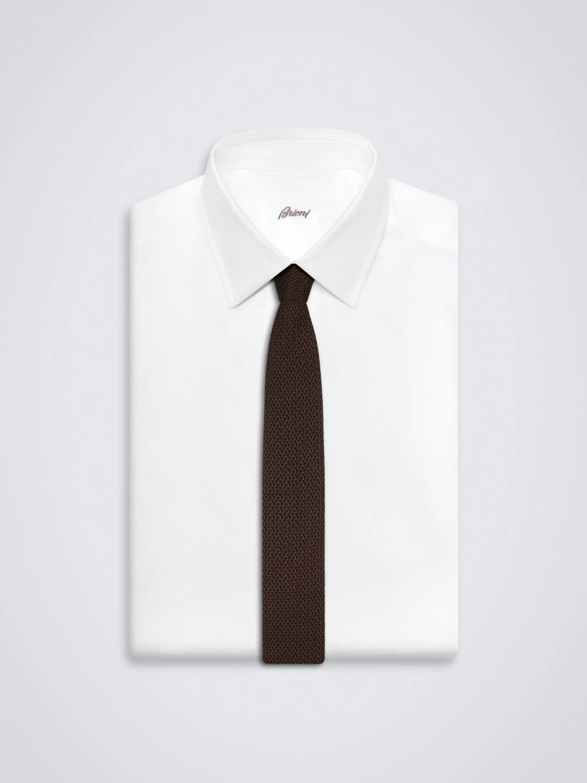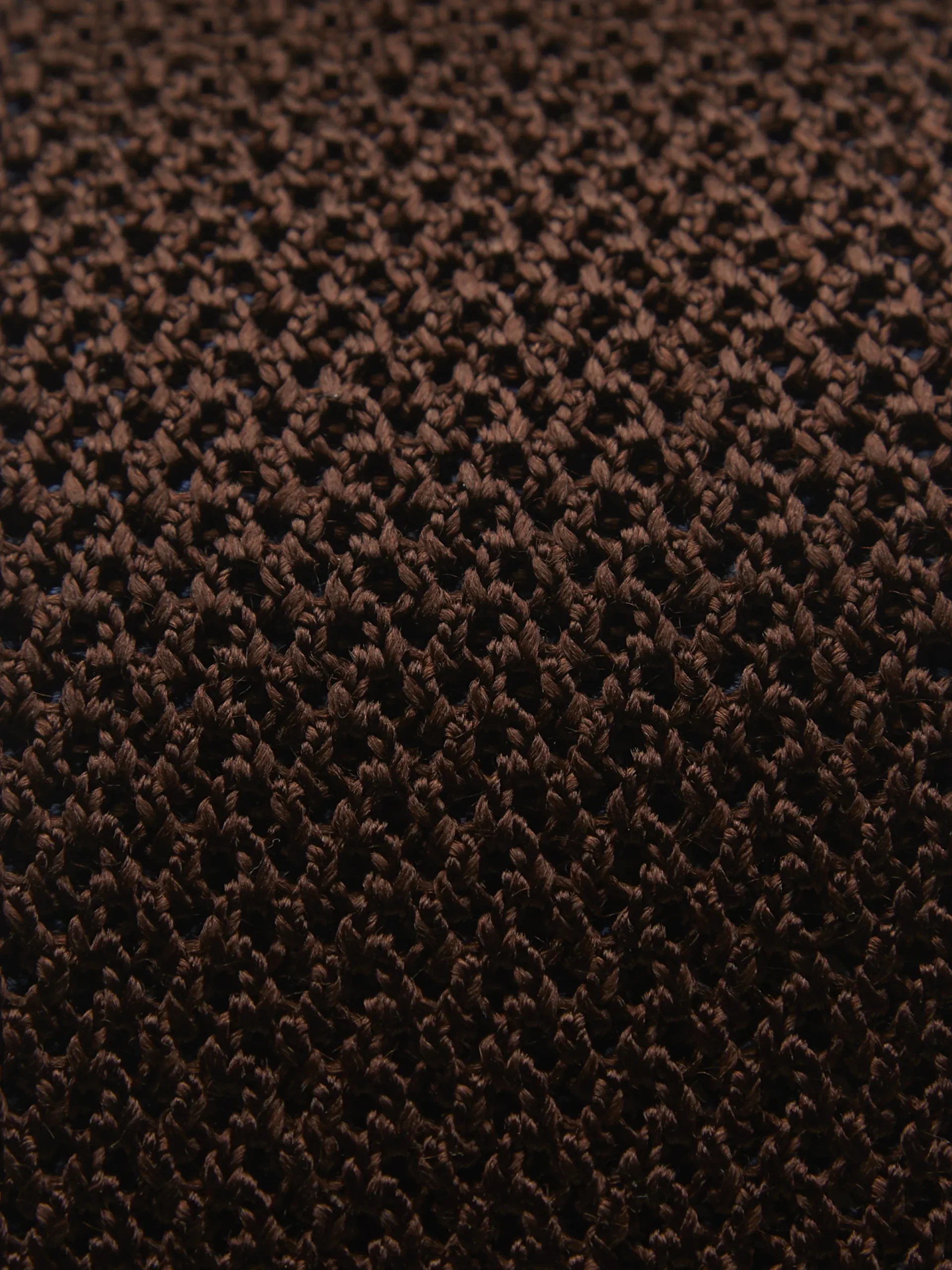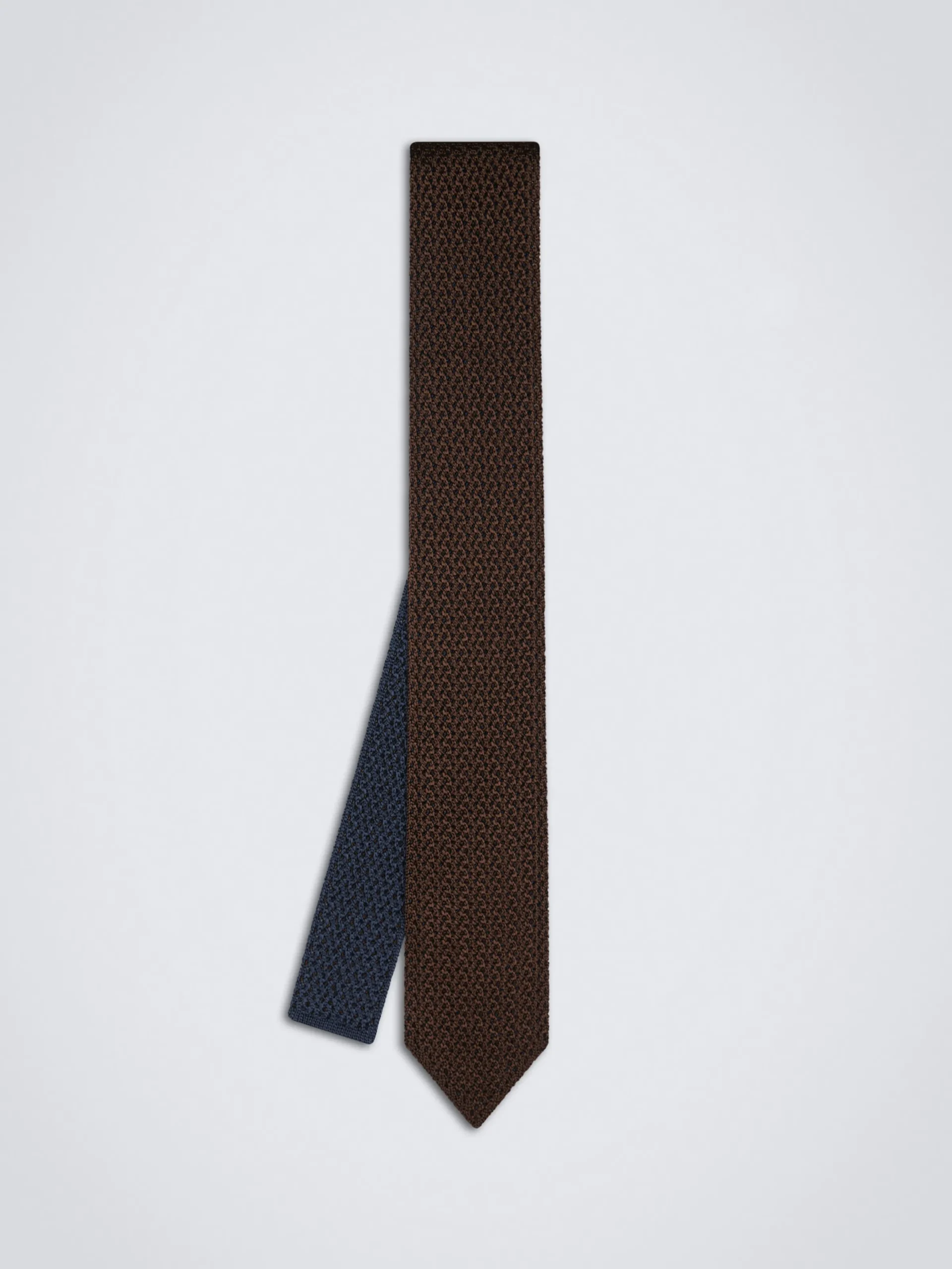 Brown and midnight blue knitted silk tie. This particular texture is obtained thanks to a tubular machine, which allows the silk threads to maintain extreme softness and vivid colours. This special piece, will add an original and modern touch to your formal suit or jacket.