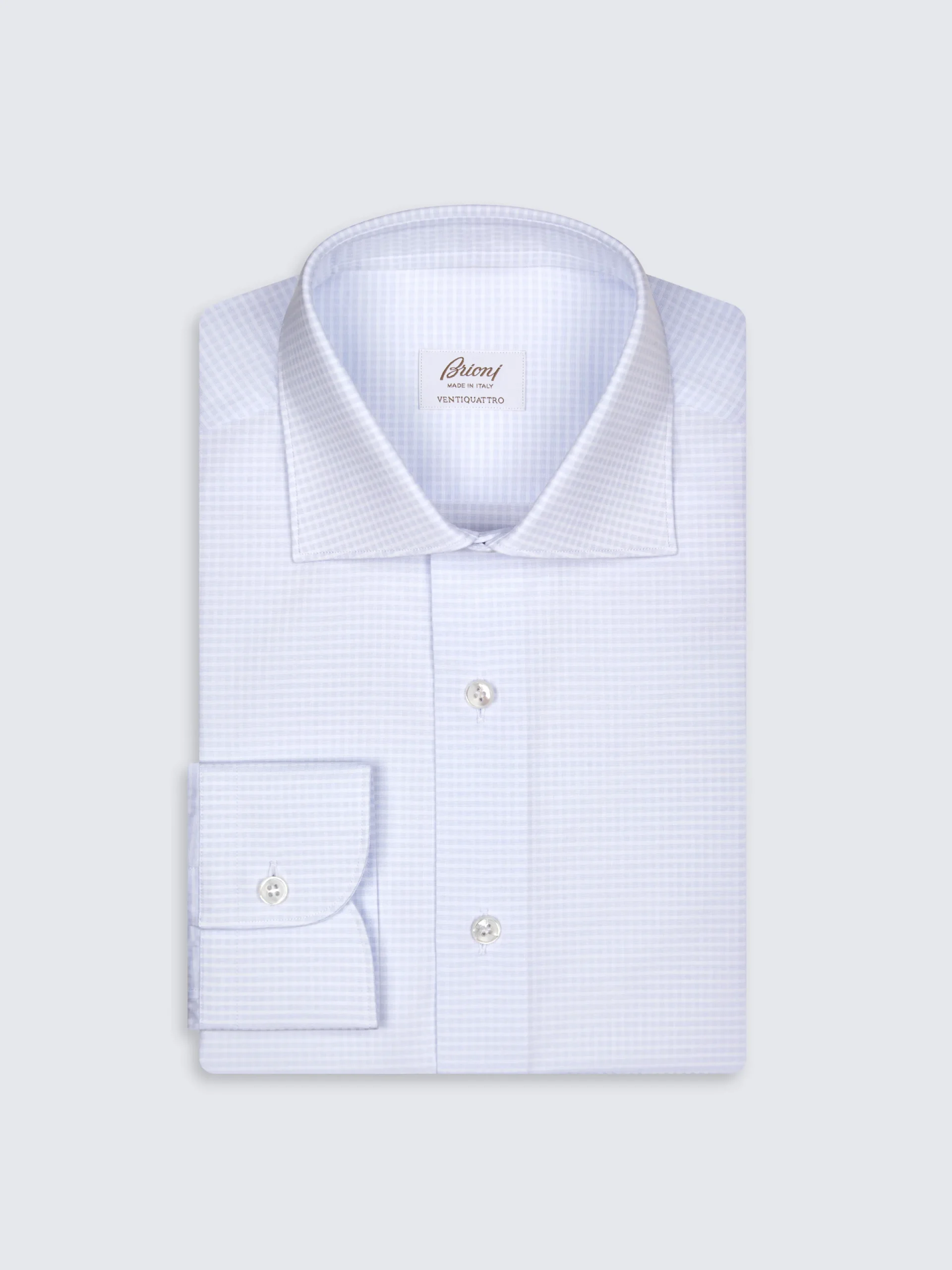 Light blue and white micro-checked Ventiquattro cotton formal shirt. Featuring a regulat fit, rounded cuffs, mother of pearl buttons and without front placket. Sleek and sophisticated, it is perfect to be worn with a tie. A true wardrobe staple.