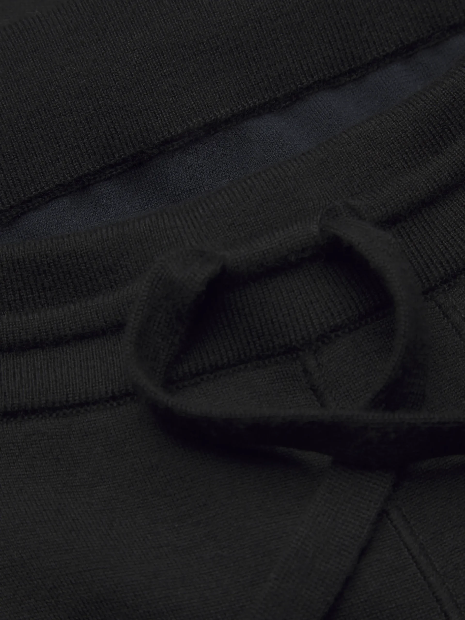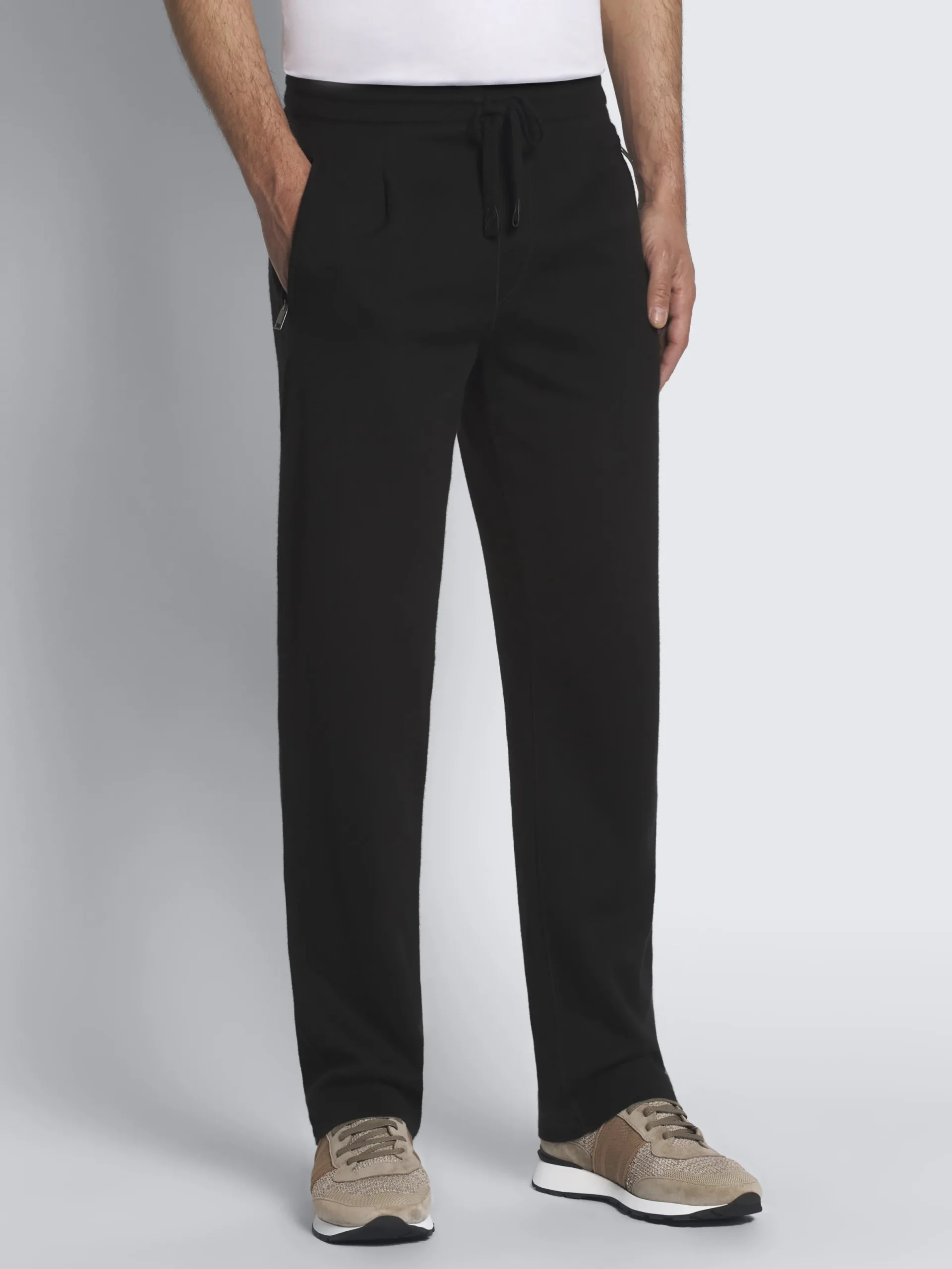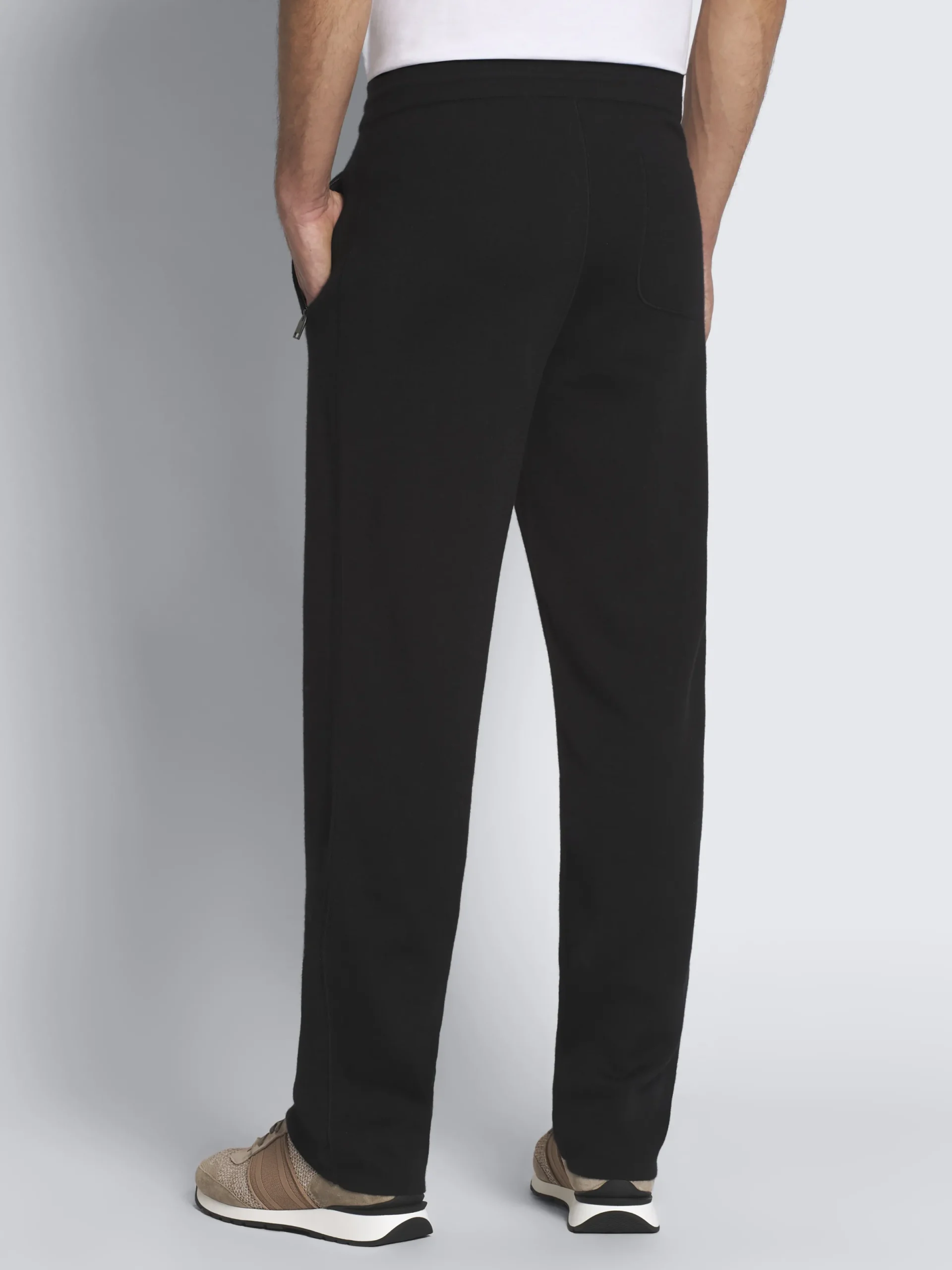 Black knitted leisure trousers in a soft cashmere and silk blend on the outside and 100% cotton on the inside. Leather cord adjuster and two jet pockets at front for added practicality. Exceptionally comfortable, these trousers are the perfect addition to your sportswear wardrobe, to feel at ease on your days off.