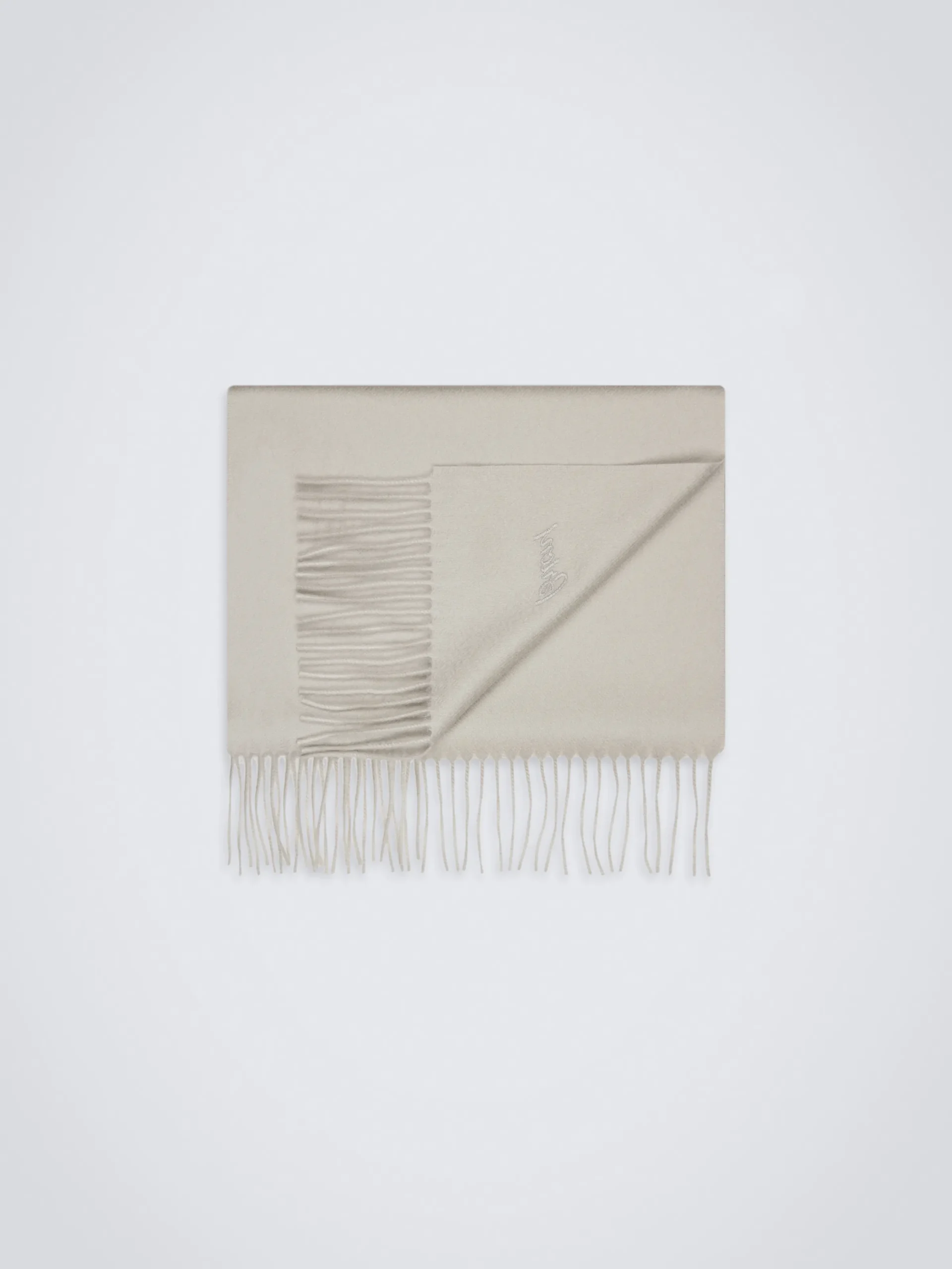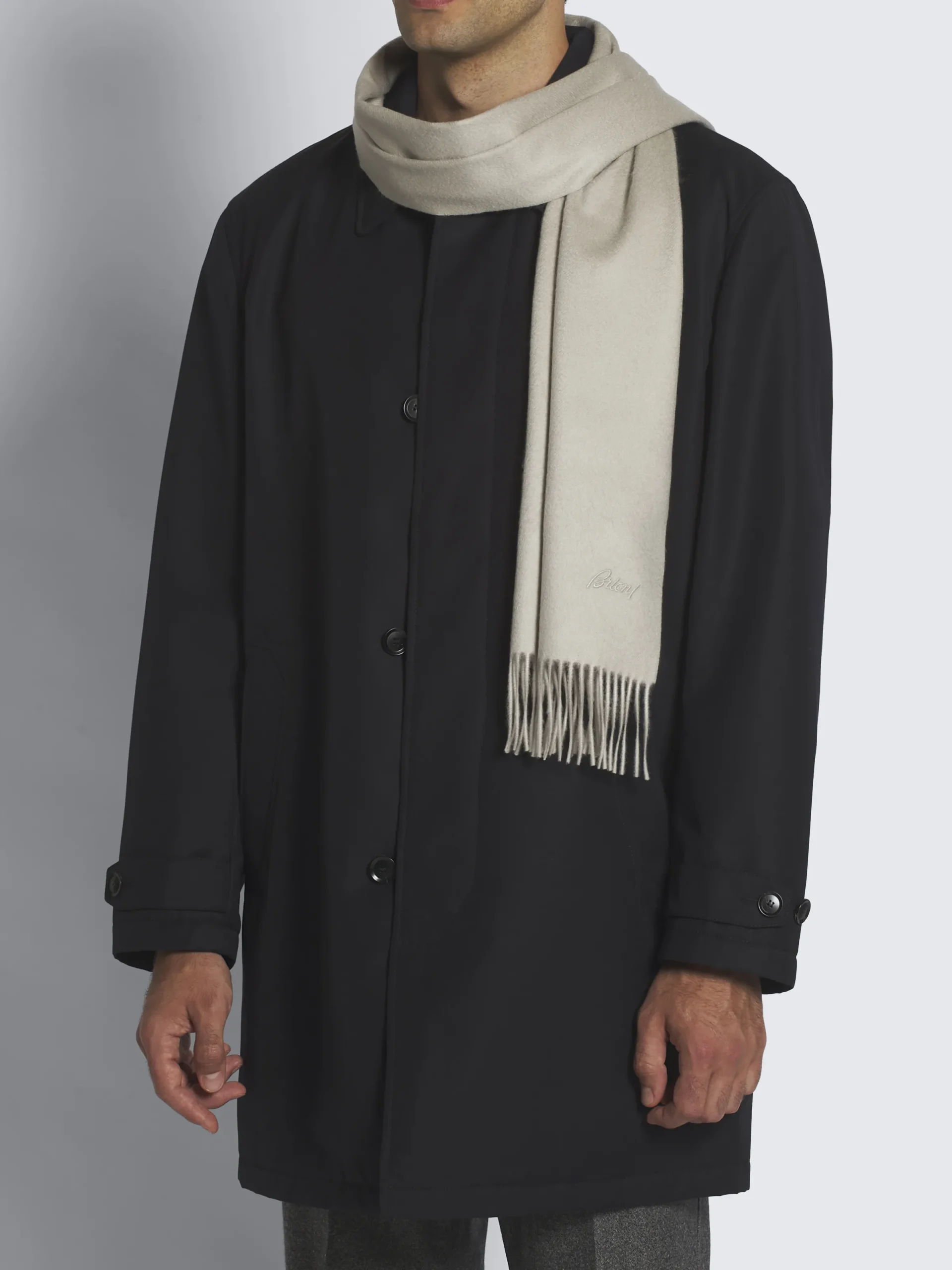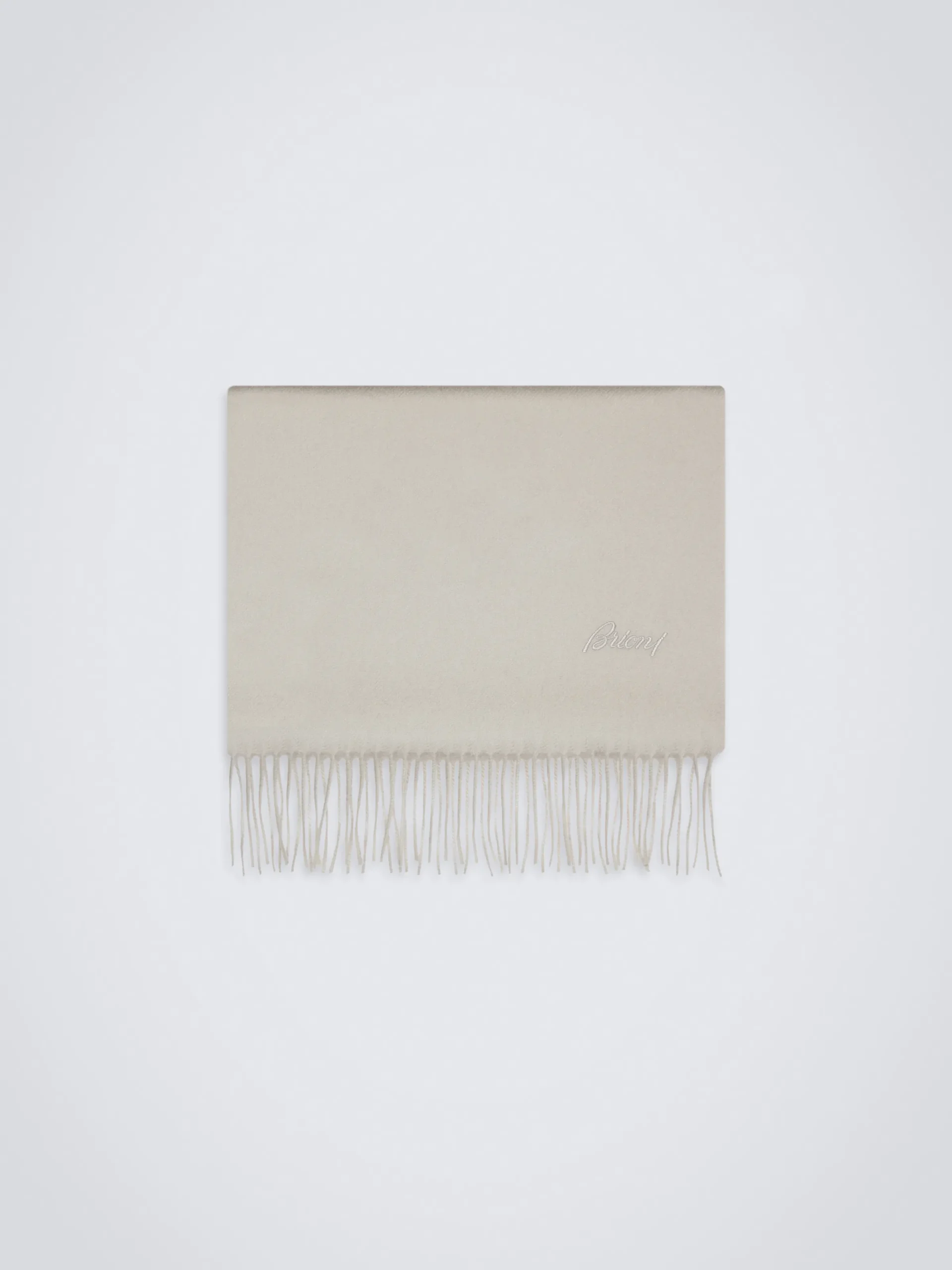 Ivory white cashmere scarf. Featuring fringes along the short edges and tonal Brioni logo embroidered on the bottom. This classic and soft accessory will add a contemporary touch to a wide array of outfits.