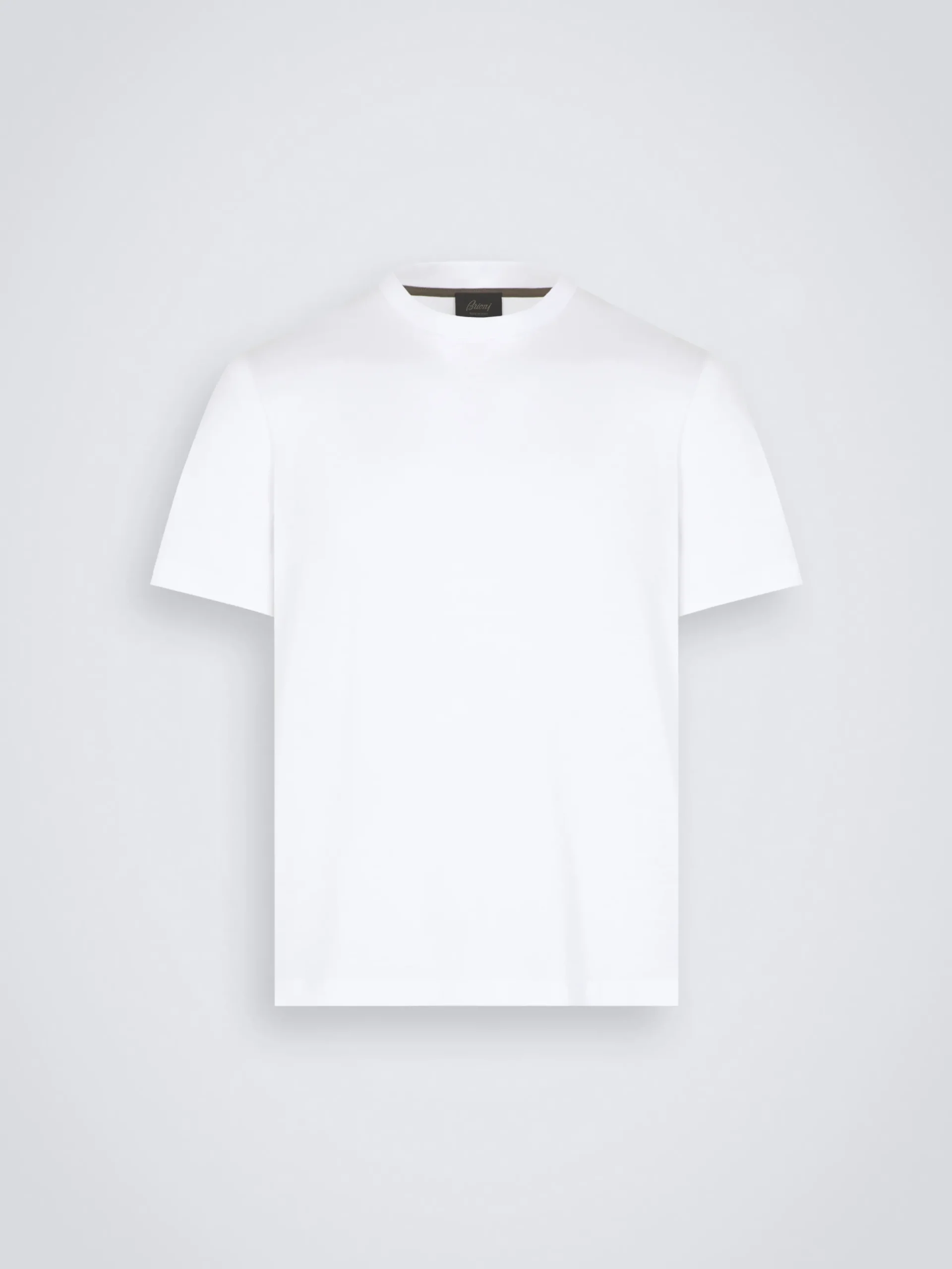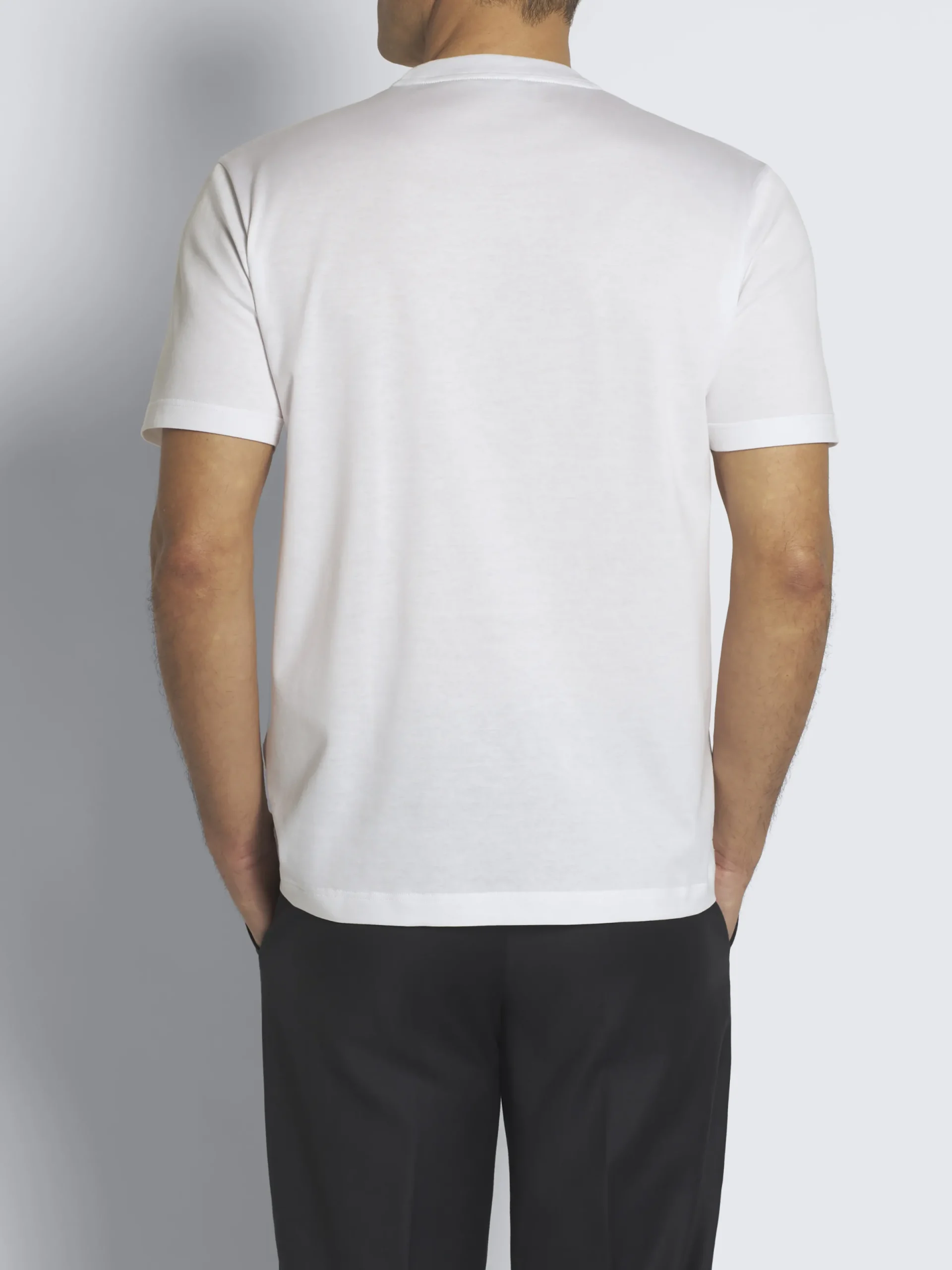 Essential white gassed organic cotton T-shirt, featuring a knitted round neck collar with inside beige piping. Gassed organic cotton is brighter and smoother thanks to the rapid exposure of mercerized organic cotton yarn to a hot gas flame. An everyday staple, perfect to layer under a jacket or your favourite cashmere sweater. This garment contains GOTS certified cotton. The Global Organic Textile Standard (GOTS) is a voluntary standard obtained by verification through independent third-parties. Practices include requirements on environmental management and wastewater; protection of health, safety and rights of employees; avoidance of hazardous substances.