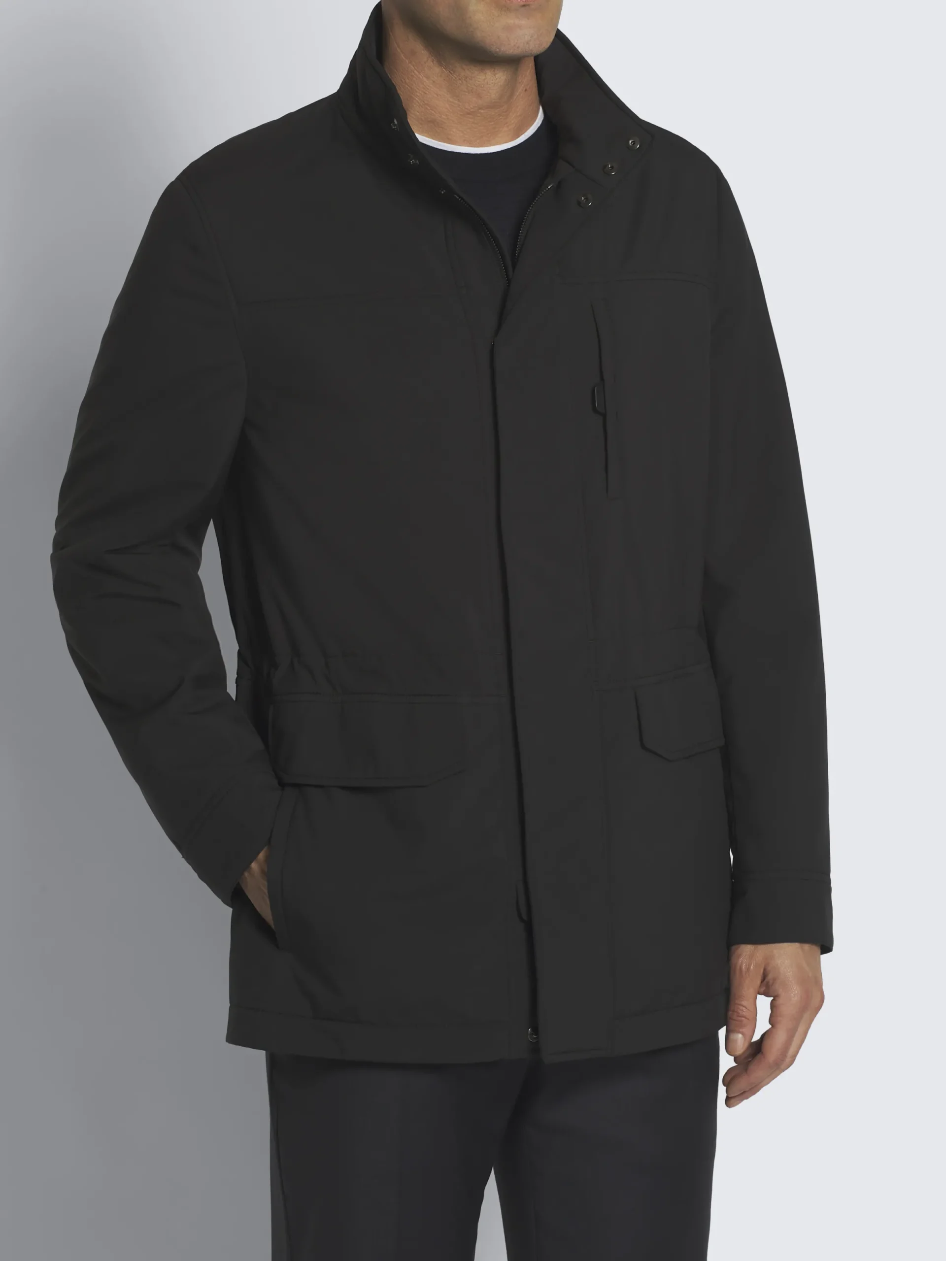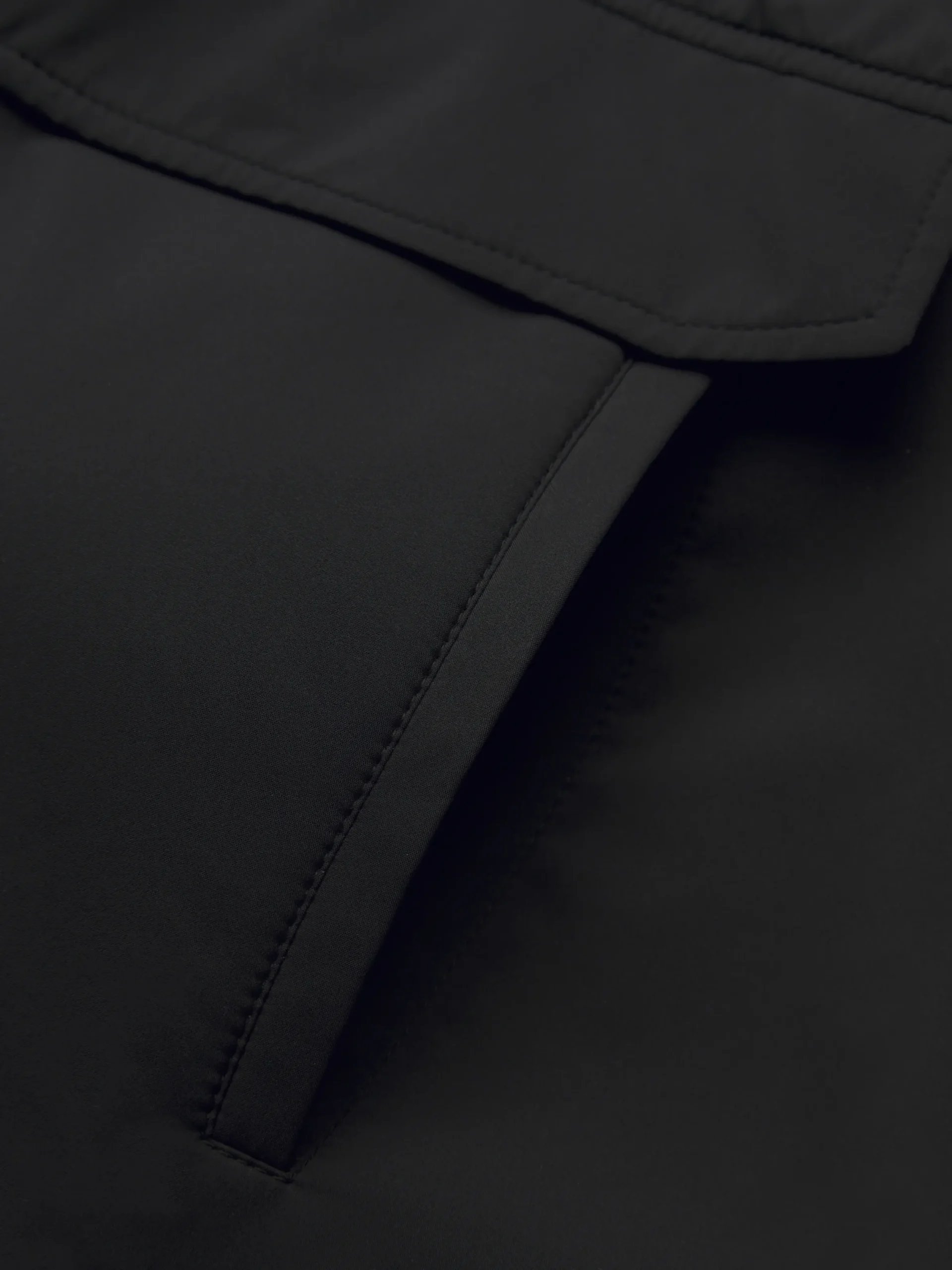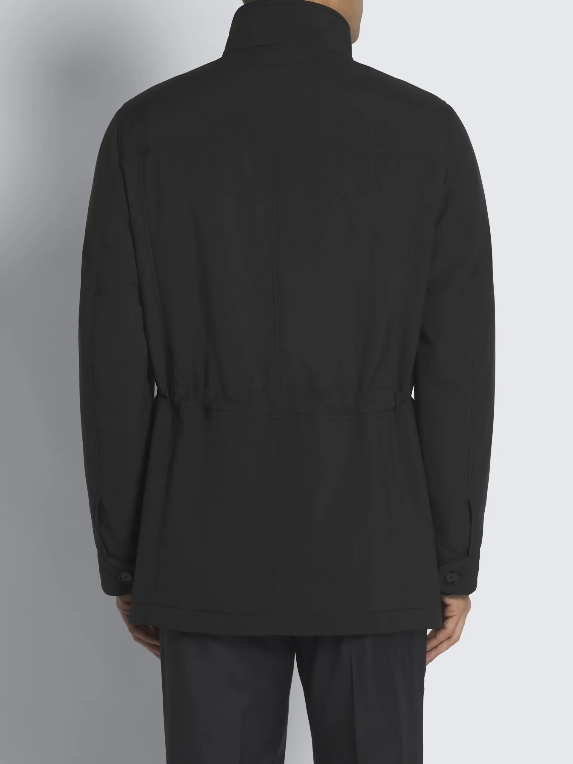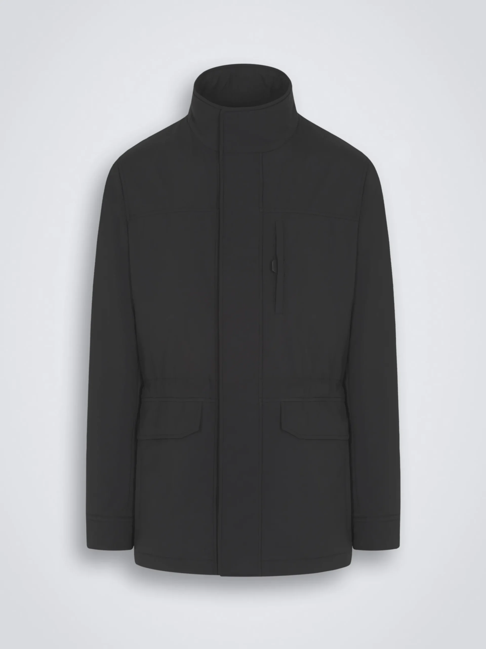 Essential midnight blue Performa field jacket, featuring a standing collar with bevelled lunette shape, dual zip and snaps closure with metal zip puller, two double-entry side pockets and elasticated waist drawcord. This garment contains GRS polyester. The Global Recycled Standard (GRS) is an voluntary, full product standard obtained by verification through independent third-parties. Practices include requirements for recycled content, social and environmental practices, and chemical restrictions.