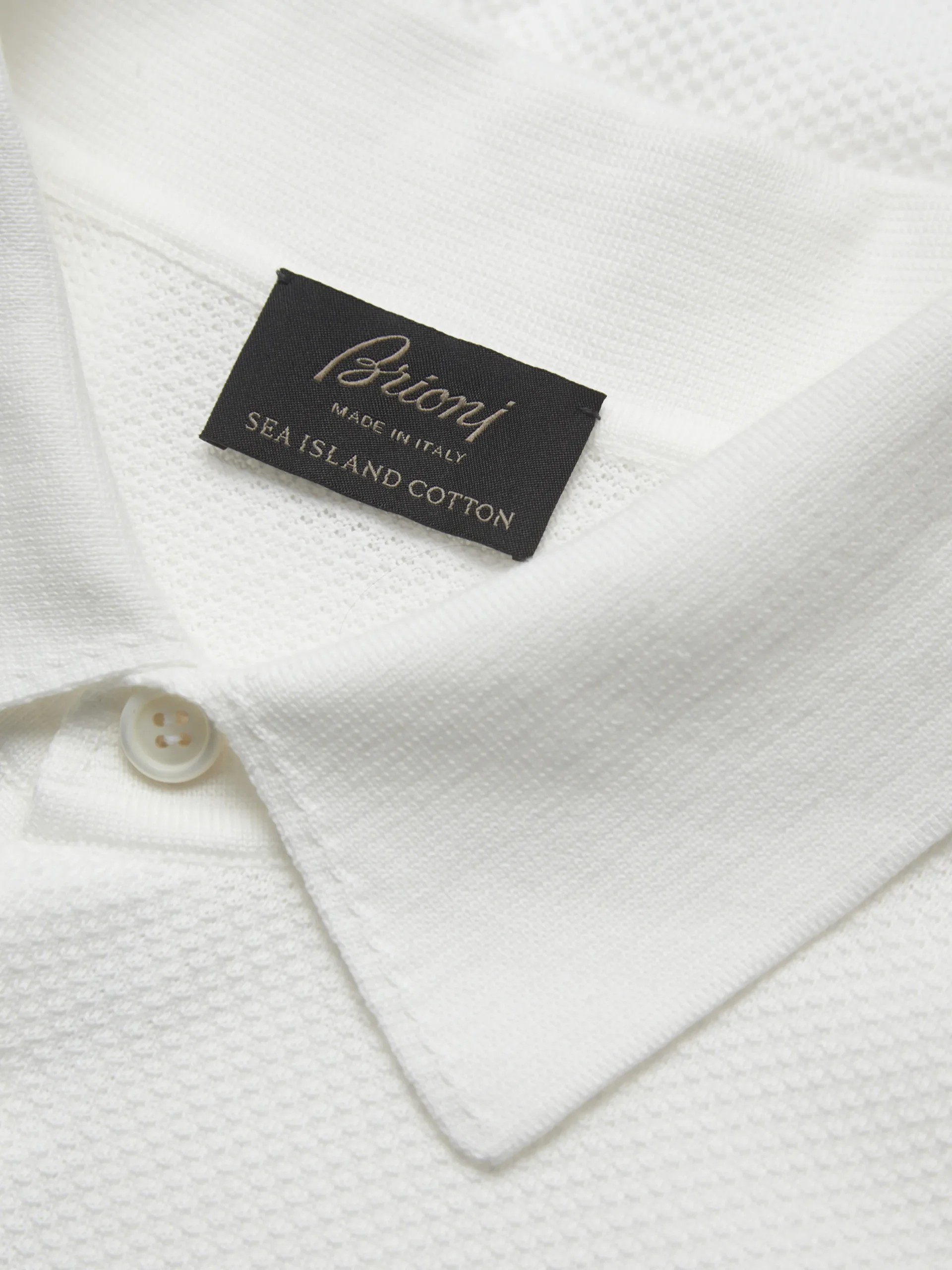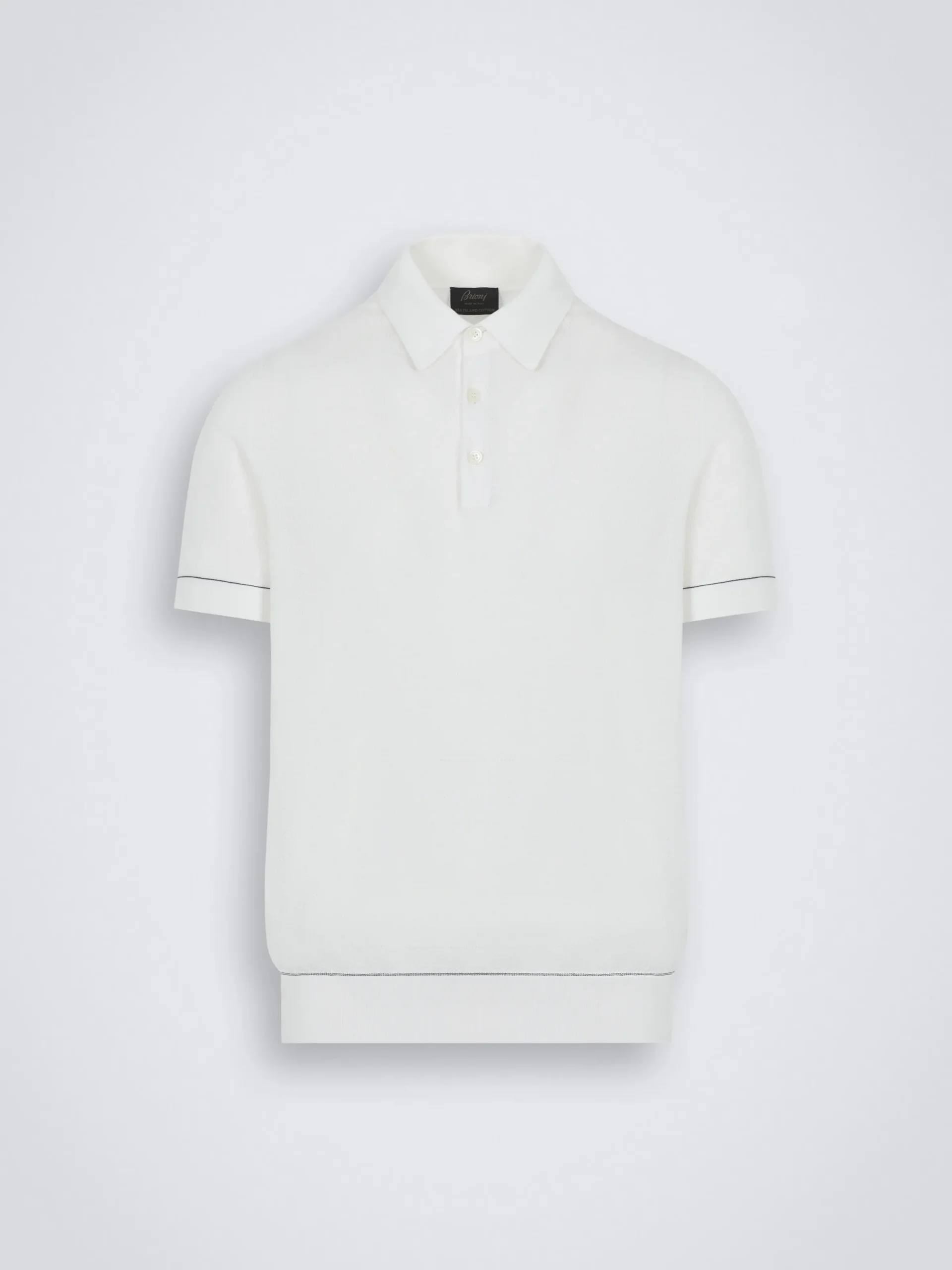 Essential white short-sleeved polo, knitted in Sea Island cotton. The piqué texture gives a sporty feel with the blue contrast stripe detail offering a touch of modernity. It features a regular fit and mother of pearl buttons.nSea Island is one of the finest and most sought-after cottons in the world. Grown in limited quantities in the Caribbean, it is renowned for its long staple fibres which allow for a stronger, more resilient yarn, and result in an incredible hand feel, silky to the touch and smooth on the skin.