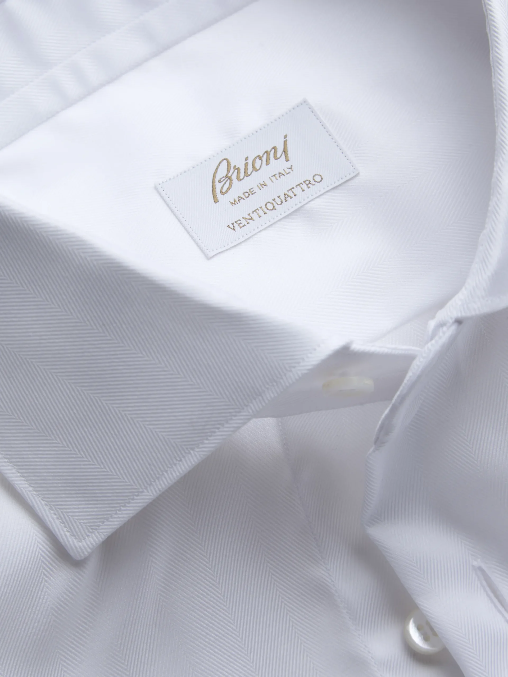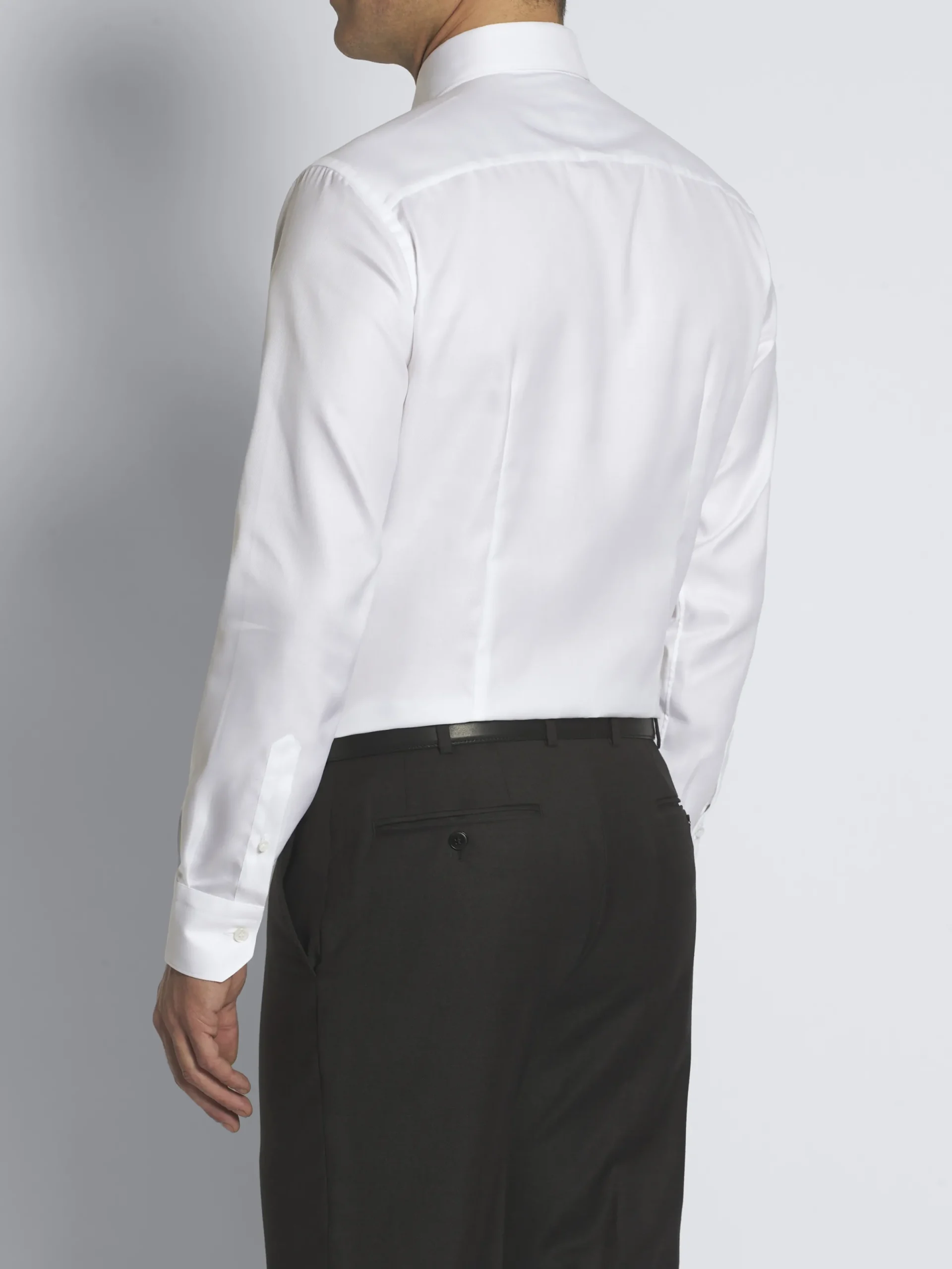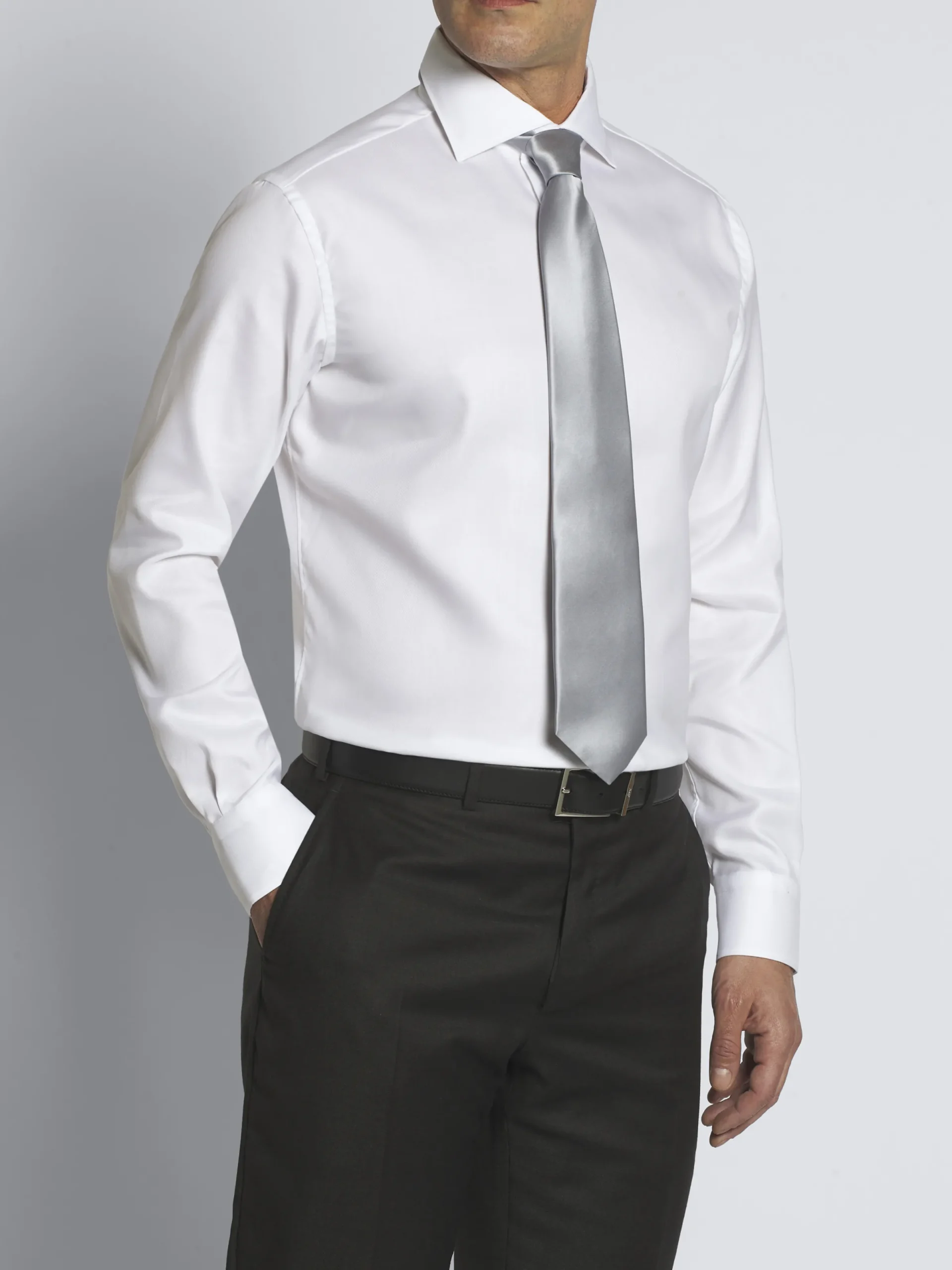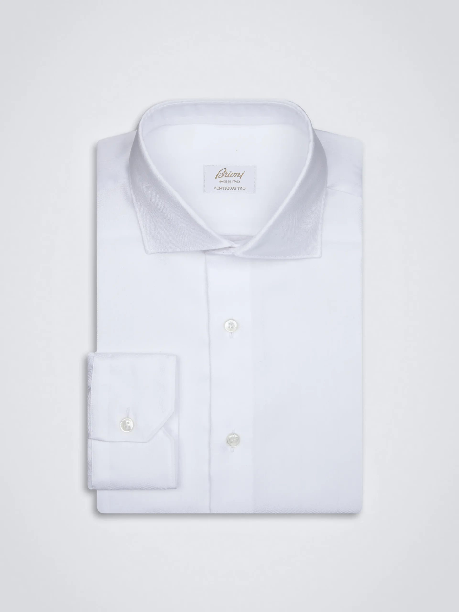 Essential white Ventiquattro cotton formal shirt. Fitted, with spread collar, mitered cuffs, mother of pearl buttons and no front placket. Sleek and sophisticated, is perfect to be worn with a tie. A true wardrobe staple.nWhy you will love our Ventiquattro fabric: it’s an exclusive anti-crease fabric that ensures a polished look at all times, making this shirt ideal for travel or long days.