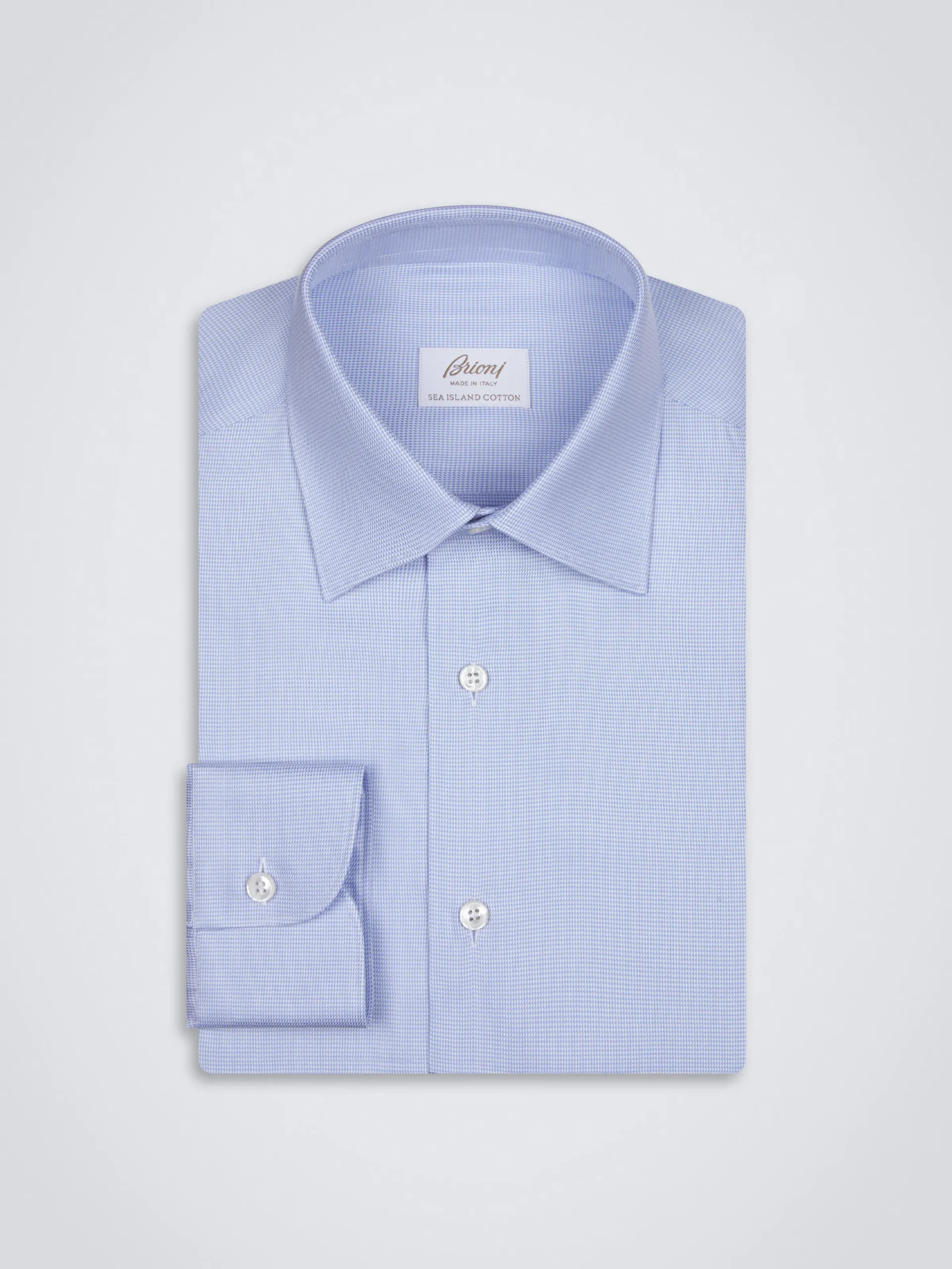 sky blue micro houndstooth Sea Island cotton formal shirt. Featuring a regular fit, rounded cuffs, mother of pearl buttons and without front placket. Comfortable and sophisticated, it is perfect worn with a tie for an elegant yet modern look. Sea Island is one of the finest and most sought-after cottons in the world. Grown in limited quantities in the Caribbean, it is renowned for its long staple fibres which allow for a stronger, more resilient yarn, and result in an incredible hand feel, silky to the touch and smooth on the skin.
