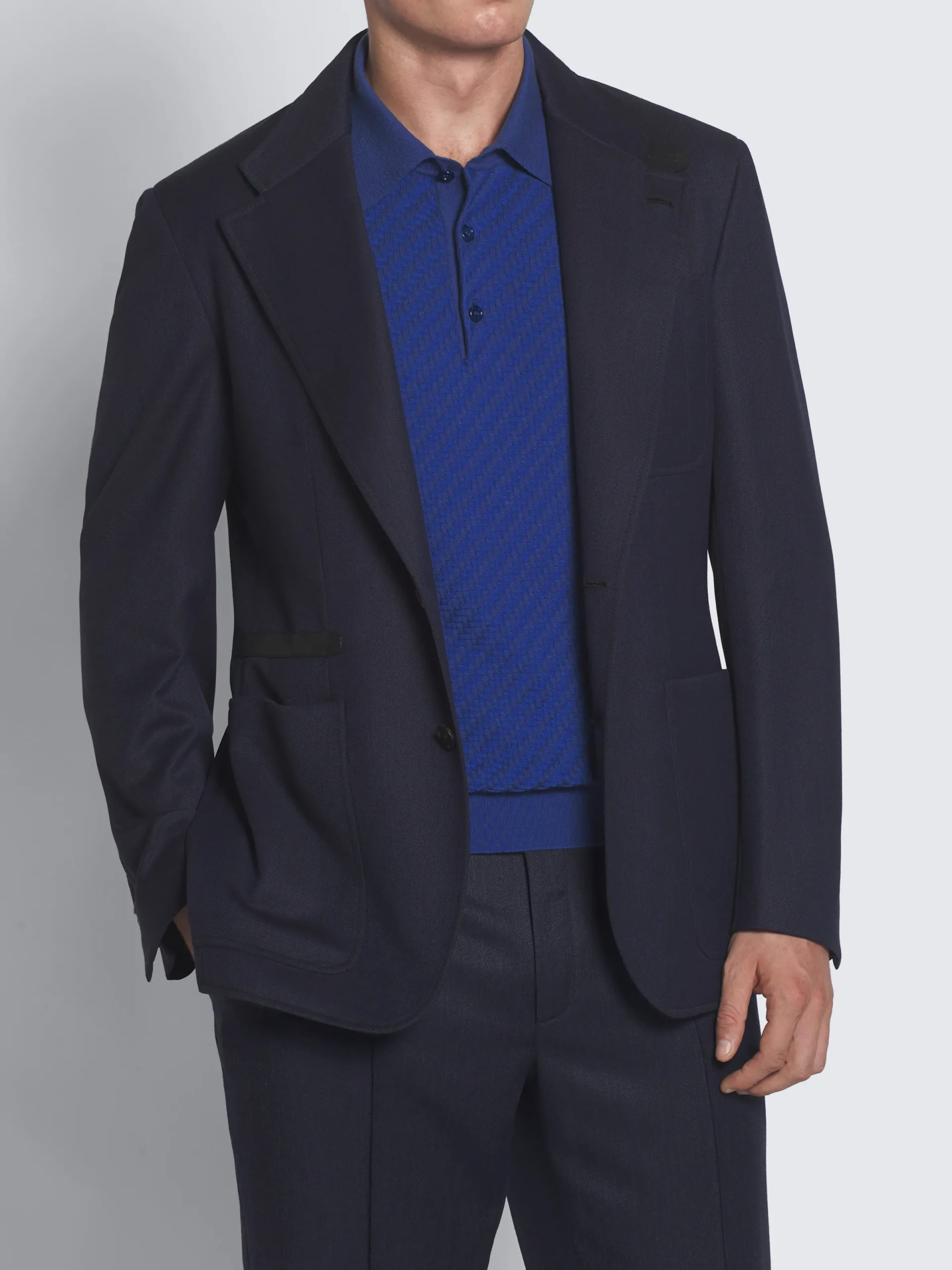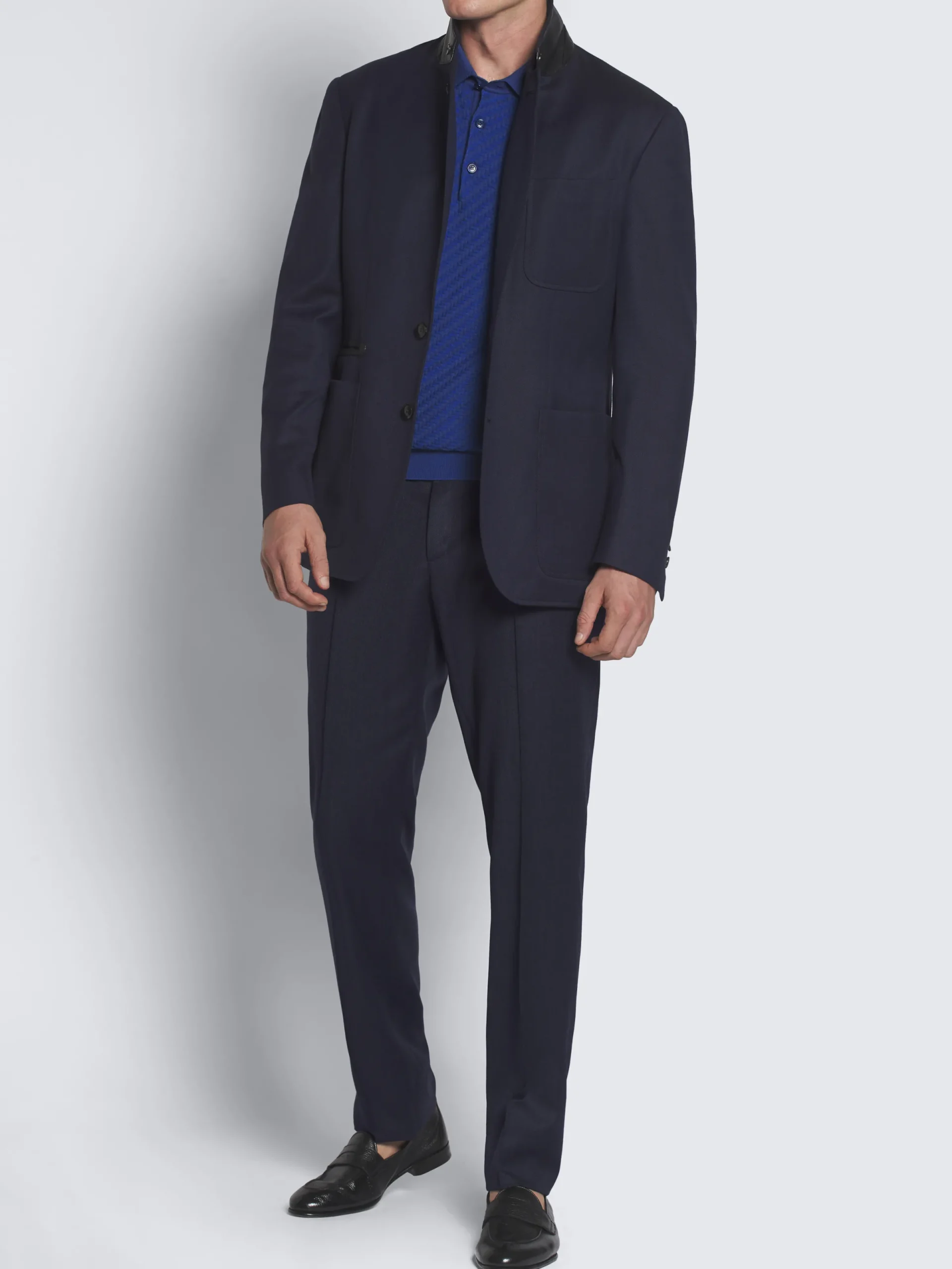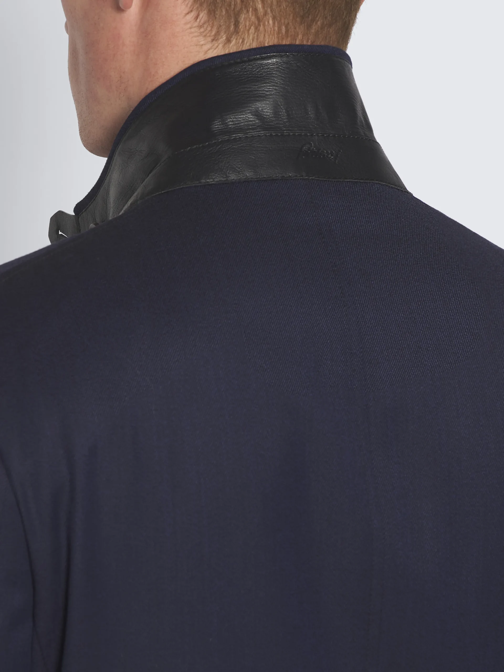 Navy blue cavalry wool twill Travel jacket. Elegant form and technical function combine in this contemporary reinterpretation of the original Brioni Travel jacket from the 1960’s, where the clean lines are underpinned by subtle details offering a nod to the House’s heritage. This model features a Brera collar closure, with a leather tab to fully close it. A leather undercollar with Brioni debossed logo finishes the upper part. Horn buttons on the front closure and cuffs, thirteen pockets among external and internal ones, and two back vents complete this elaborated jacket. Fully lined, it is the perfect blend of elegance and practicality for a distinguished man on business travels.nThis garment contains RWS wool. The Responsible Wool Standard (RWS) is a voluntary standard obtained by verification through independent third-parties. RWS farmers and ranchers are evaluated against animal welfare, land management, and social requirements set in the standard.