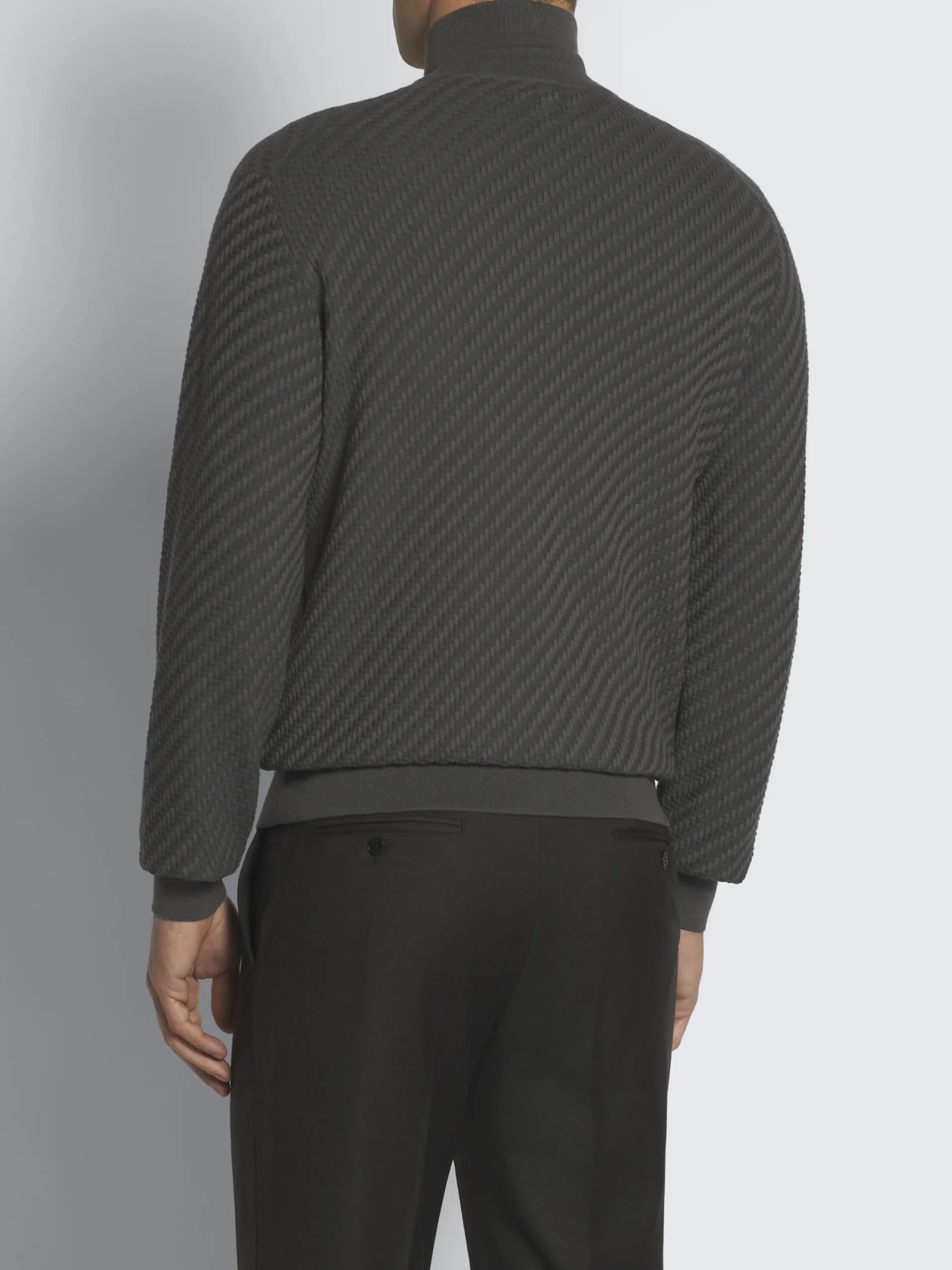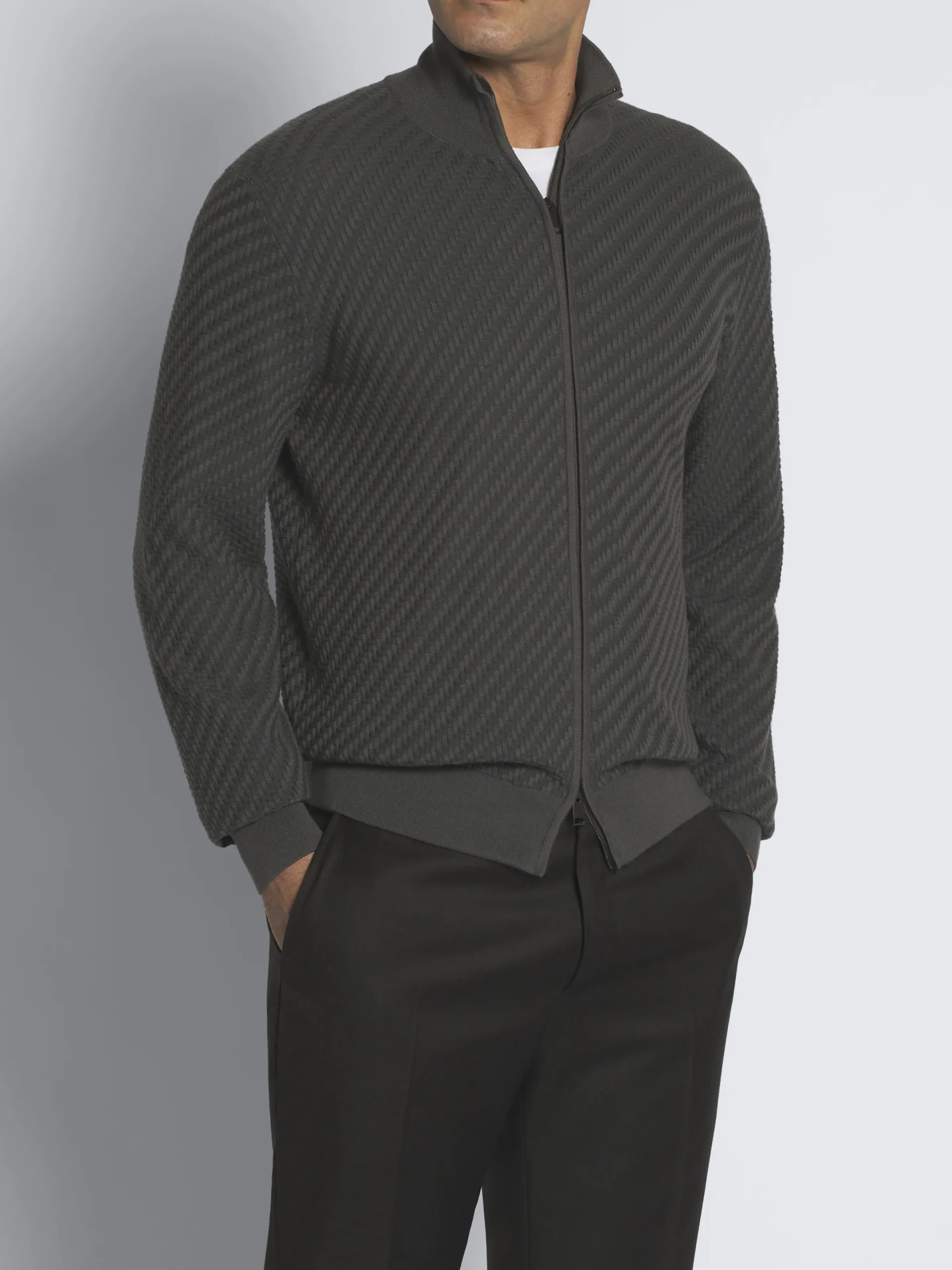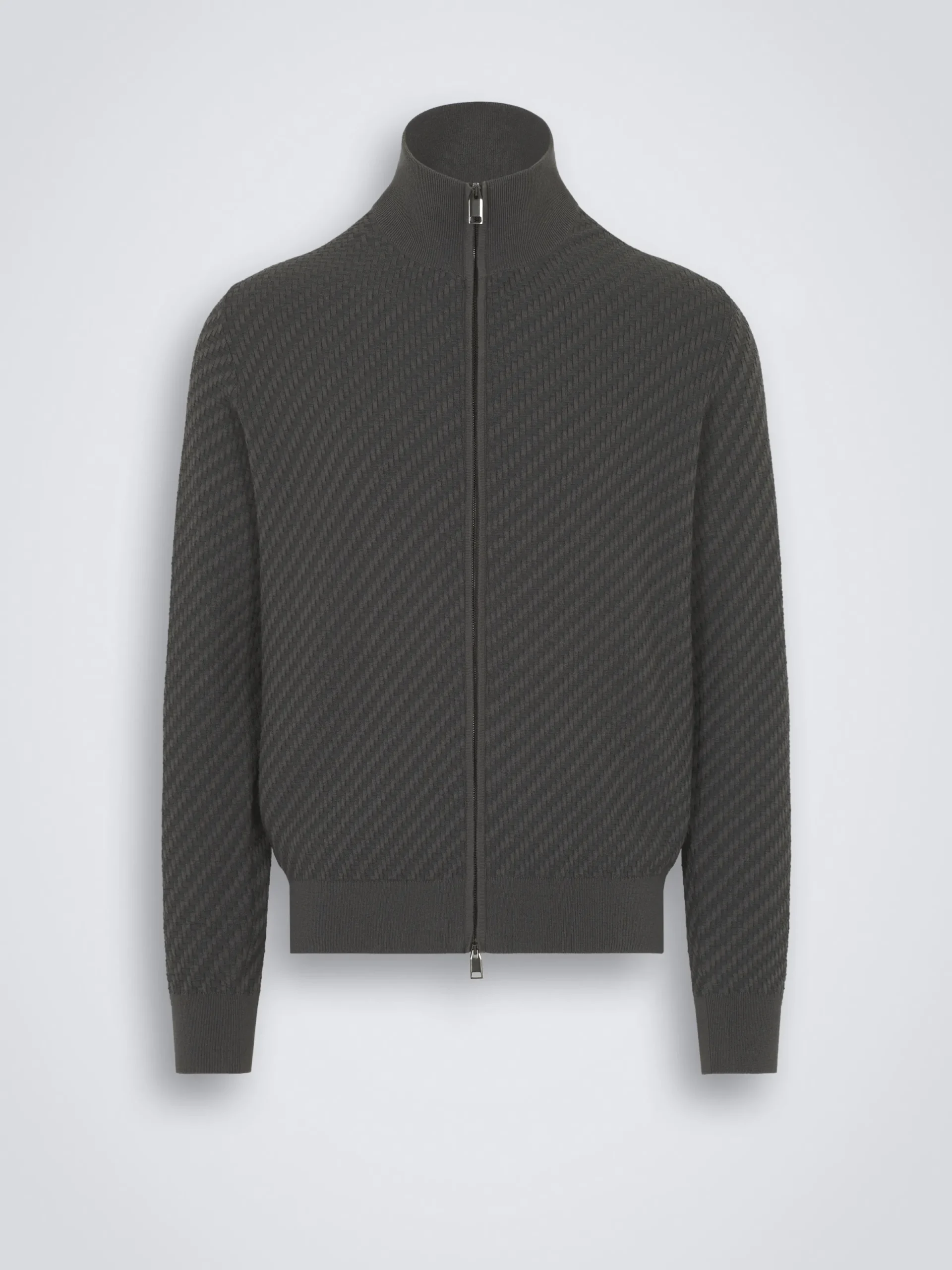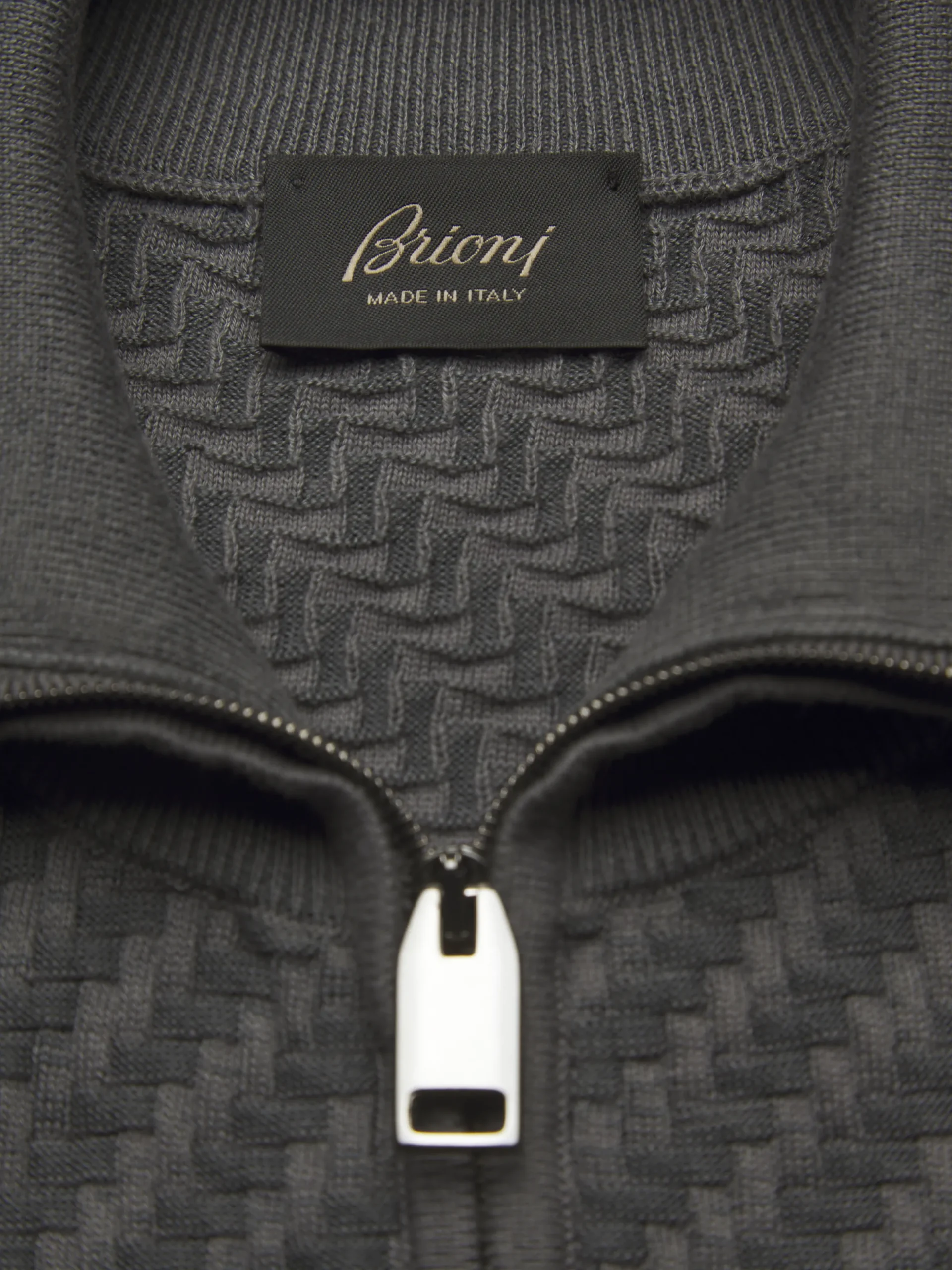 Grey organic organic cotton, silk and cashmere Trama weave full-zip sweater. Featuring a standing collar and dual zip with metal pullers, its regular fit and soft knit make it easy and perfect to match with relaxed attires. The Trama weave features tone-on-tone ribs for a uniquely subtle, tactile feeling. This pattern mimics the San Pietrini, the cobbled stones characterizing the streets of Rome. An iconic motif drawn from the eternal city itself.In Brioni we take great care when sourcing fabrics to make more responsible choices.This garment contains GOTS certified organic cotton that goes through a process that helps reducing the environmental impact of the fibre.This organic cotton is produced without synthetic pesticides or herbicides, so it is safer for workers, wildlife and surrounding communities. This garment contains GOTS certified cotton. The Global Organic Textile Standard (GOTS) is a voluntary standard obtained by verification through independent third-parties. Practices include requirements on environmental management and wastewater; protection of health, safety and rights of employees; avoidance of hazardous substances.