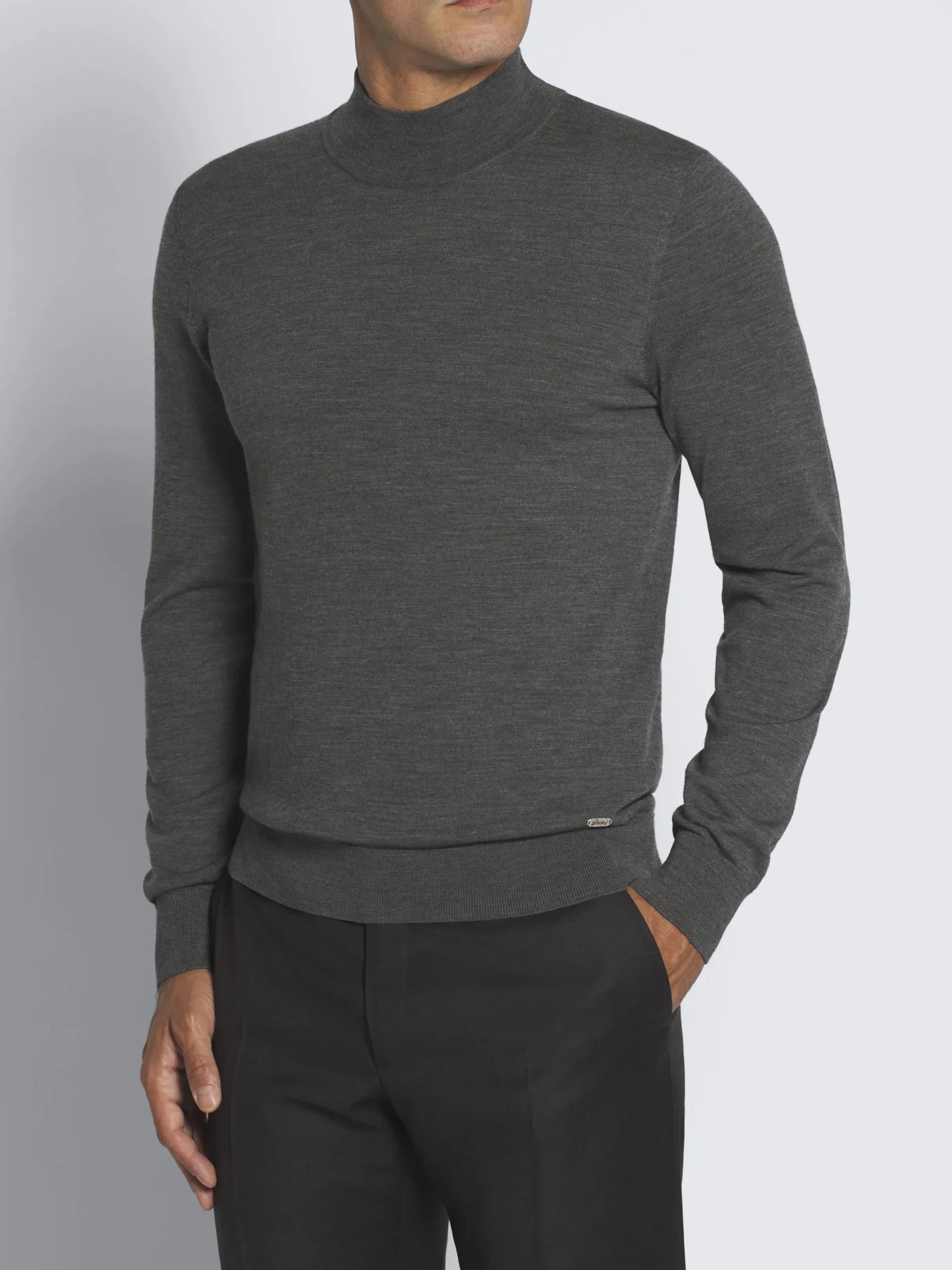 This lightweight mockneck dark grey sweater is crafted from ultra-soft responsible wool, which feels amazing to the touch. The loose neckline gives the sweater a relaxed contemporary look. Timeless and versatile, perfect for an elegant and nonchalant outfit.nThis garment contains RWS wool. The Responsible Wool Standard (RWS) is a voluntary standard obtained by verification through independent third-parties. RWS farmers and ranchers are evaluated against animal welfare, land management, and social requirements set in the standard.