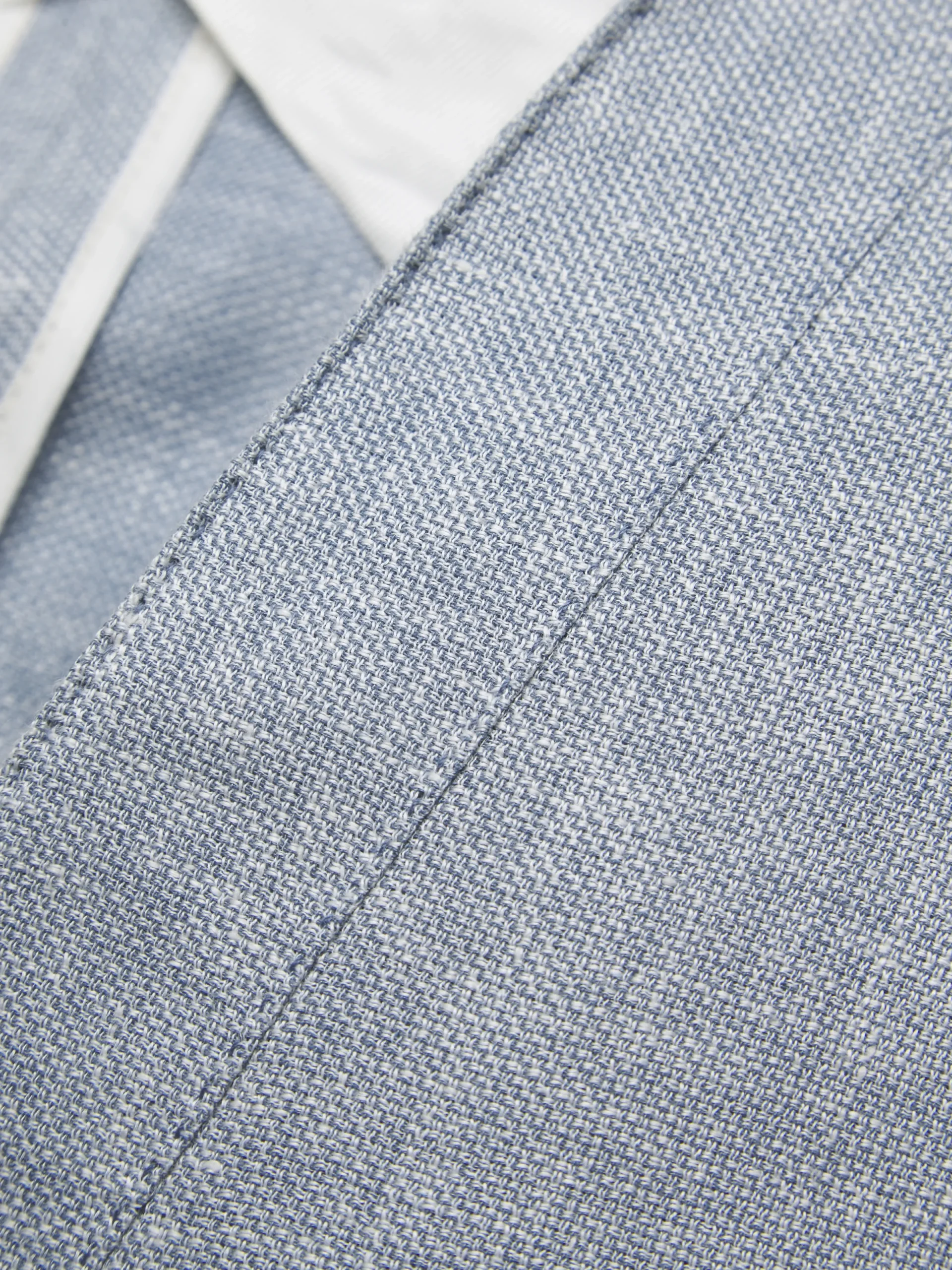 Sky blue linen, wool and silk Jardigan. A true Brioni original from 1955, the Jardigan was an innovative take on two wardrobe staples, the jacket and the cardigan, that were merged to create a new icon of effortless elegance. Collarless, deconstructed, unlined, and lapel-free, this single-breasted version features front double horn buttons closure, a jet breast pocket, two patch pockets and two back vents. A perfect touch of sophistication for informal occasions, this garment offers great wearability and illustrates our commitment to relaxed dressing with style.