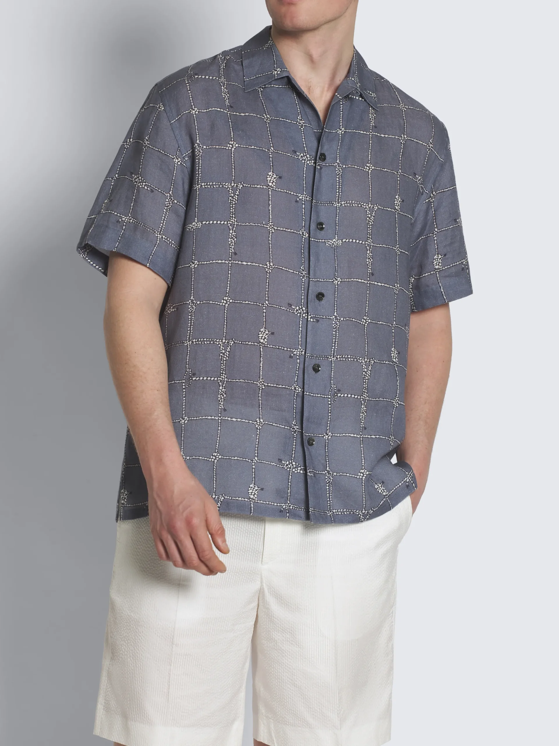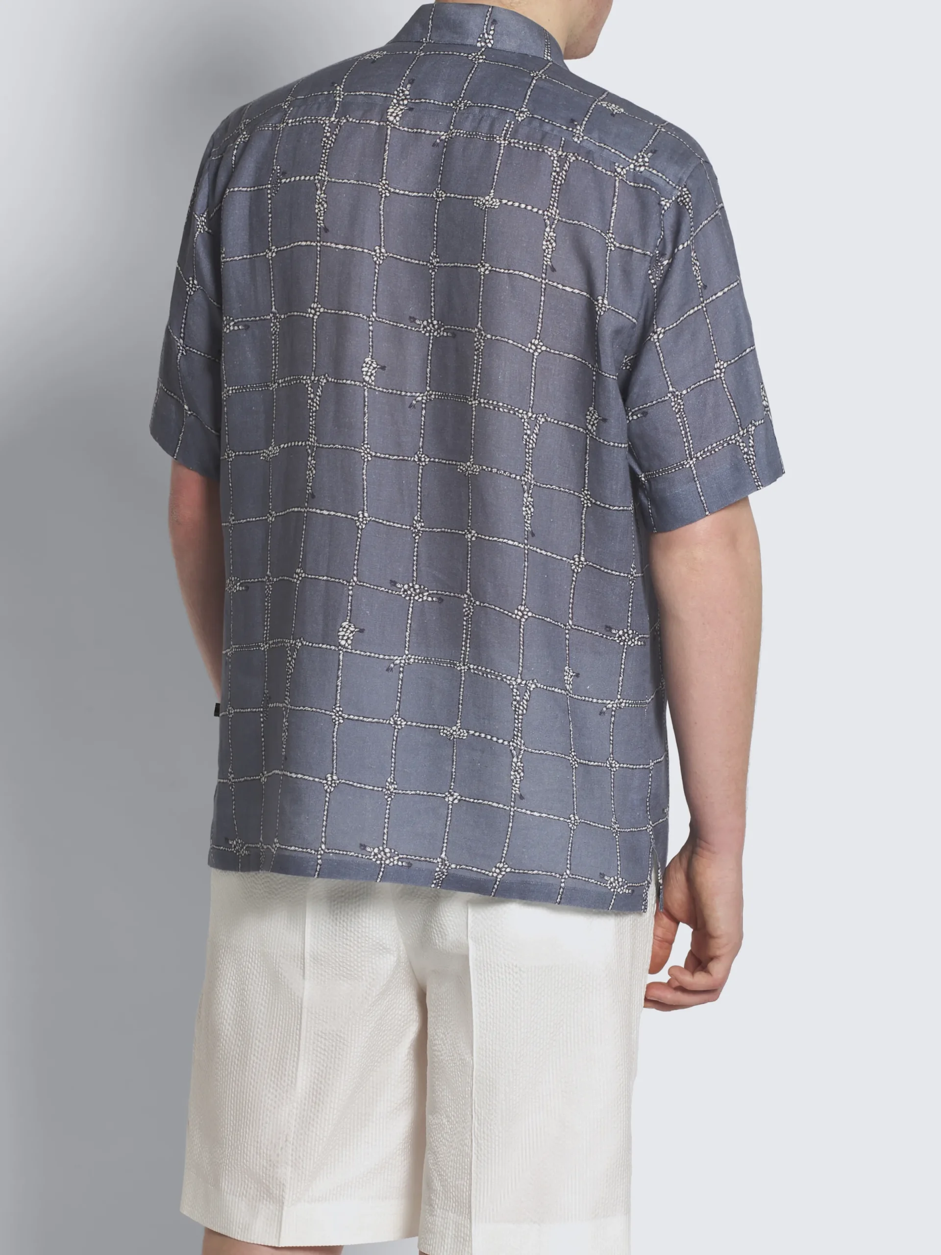 Steel blue and white linen cuban shirt. Featuring the typical relaxed fit and open collar, with an additional loop, this light yet refined model is completed with mother of pearl buttons and two side vents, and enriched by a knotted pattern.nThis item is part of our Riviera collection, a celebration of self-reconnection and unhurried rhythm, inspired by the endless blue hues of the Mediterranean Sea.